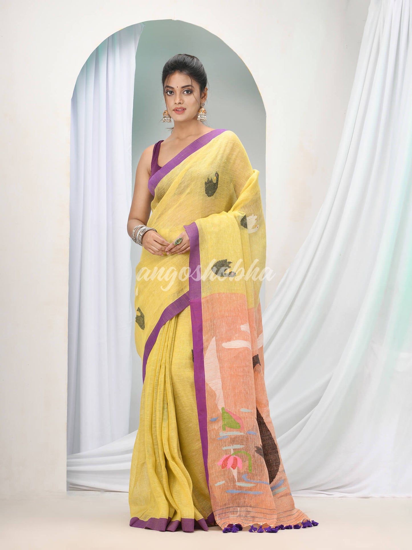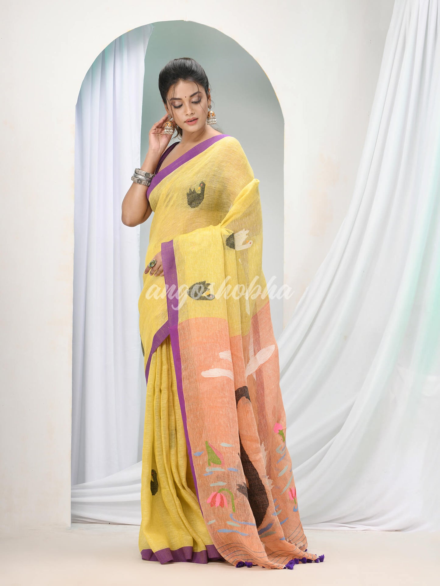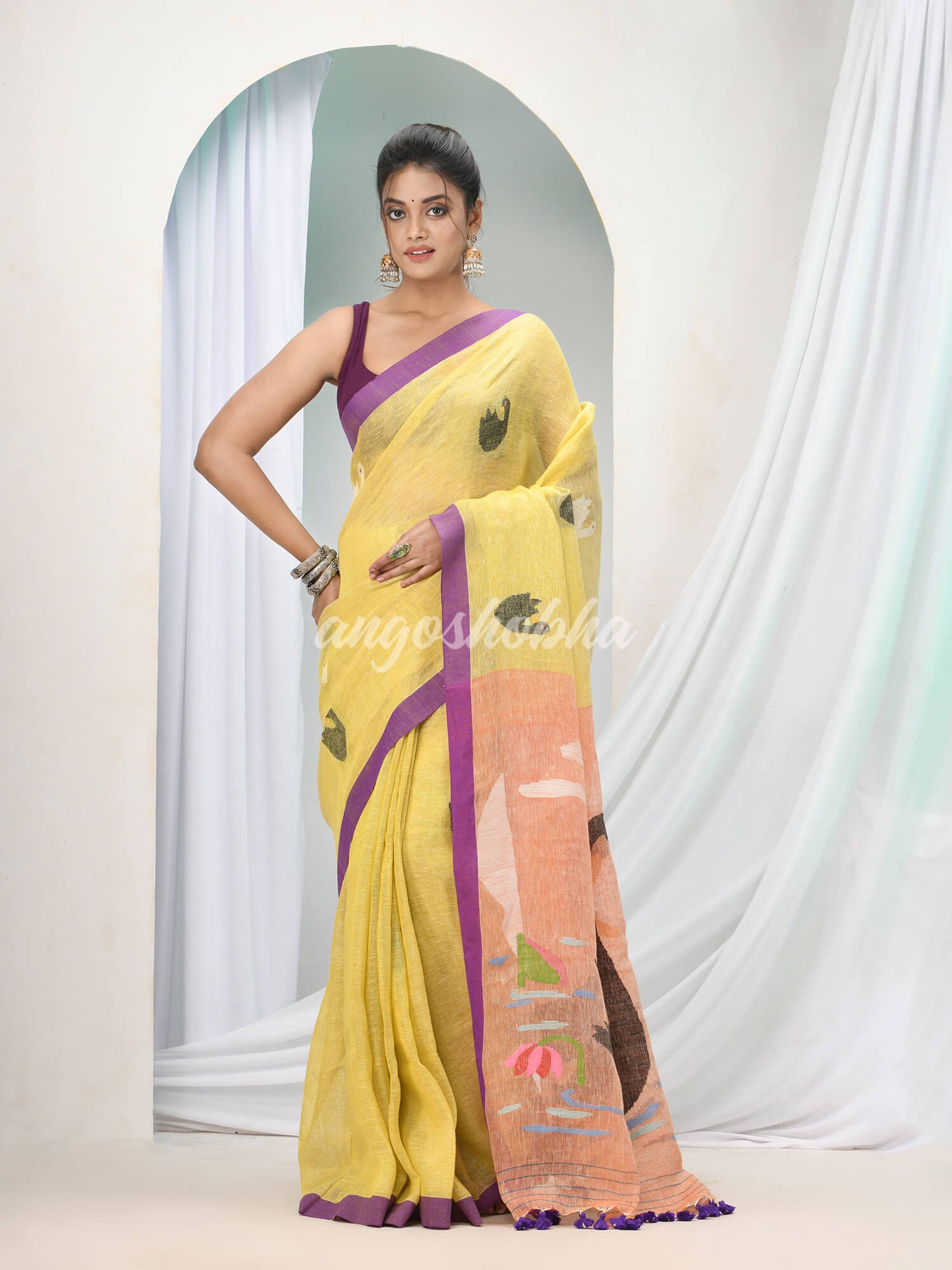 Expertly handcrafted using the finest quality linen, this Lemon Linen Handloom Saree is a perfect addition to your wardrobe. With a delicate handloom weave, it offers a lightweight and comfortable drape, making it ideal for any occasion. Elevate your style with this timeless and elegant saree.