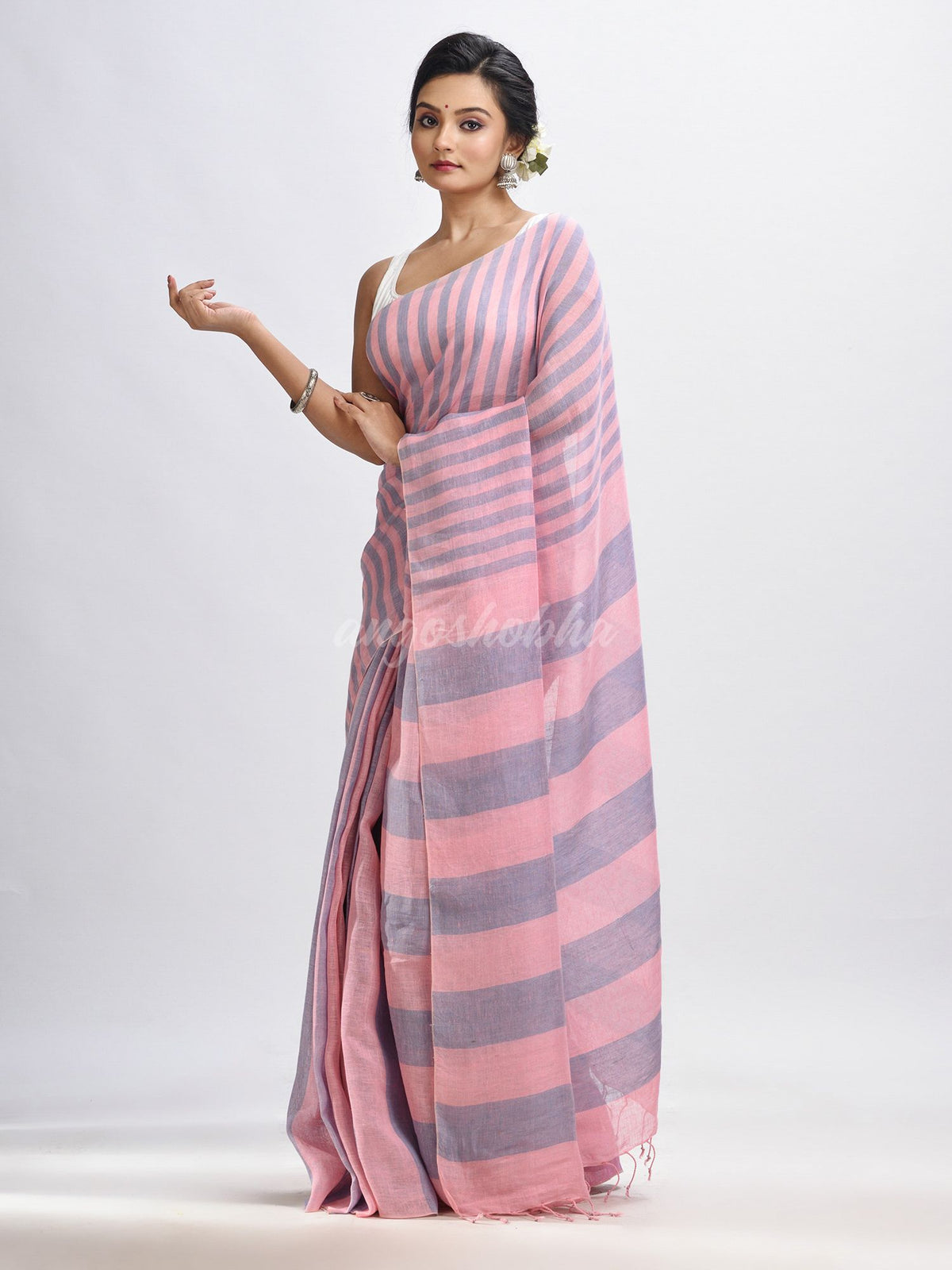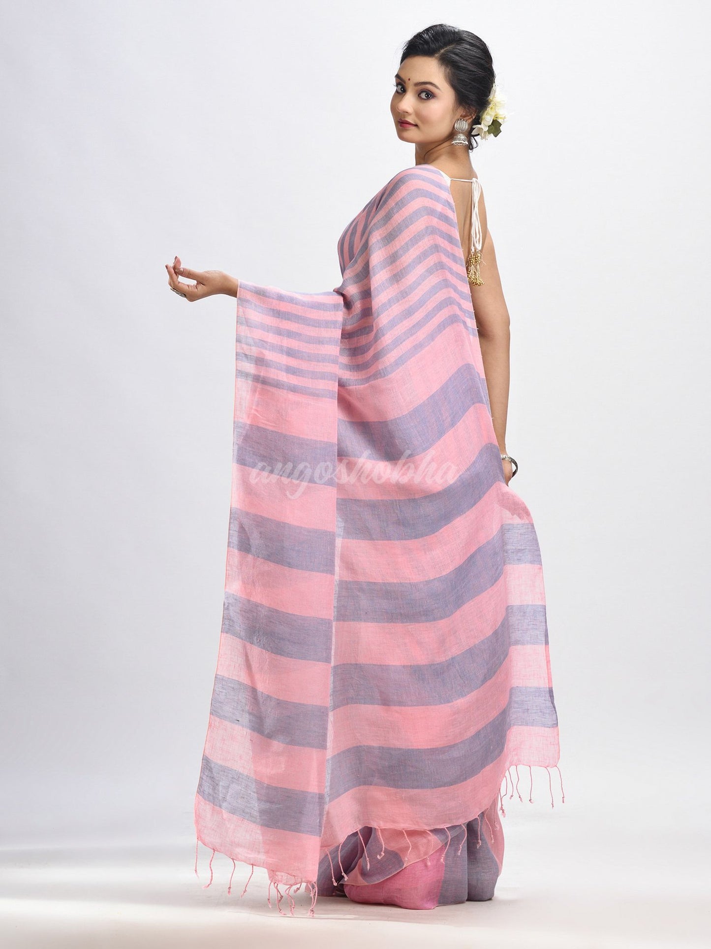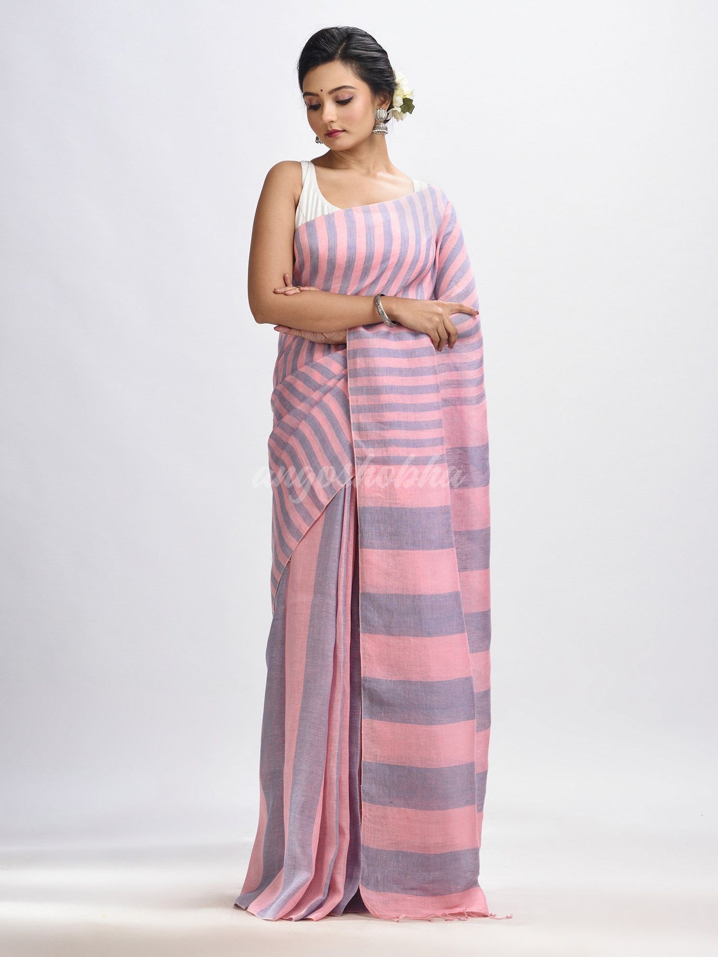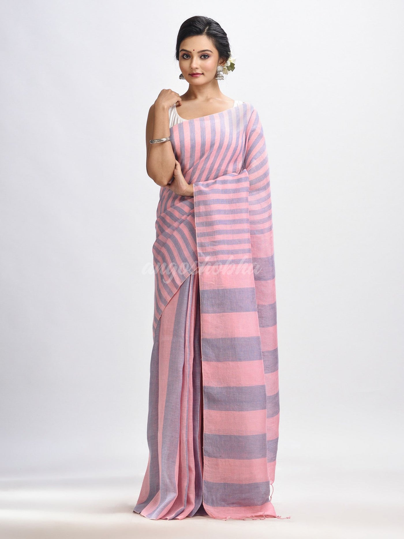 Description: Accentuate your ethnic ensemble by wearing this saree from Angoshobha. Sarees have their own grace, specially this one. This saree from Angoshobha is a beautiful Lemonade pink and Glaucous color handloom saree.The  saree all body multi colour strip. and a Lemonade pink colour attached blouse piece .Style of it with minimal jewellery and high heels to slay the ethnic look.You can wear anywhere and any festival moment with wonderful enjoyment.So collect this product and enjoy with wearing linen saree. Obviously you can trust on this collection. We are always with your fashion and choice.