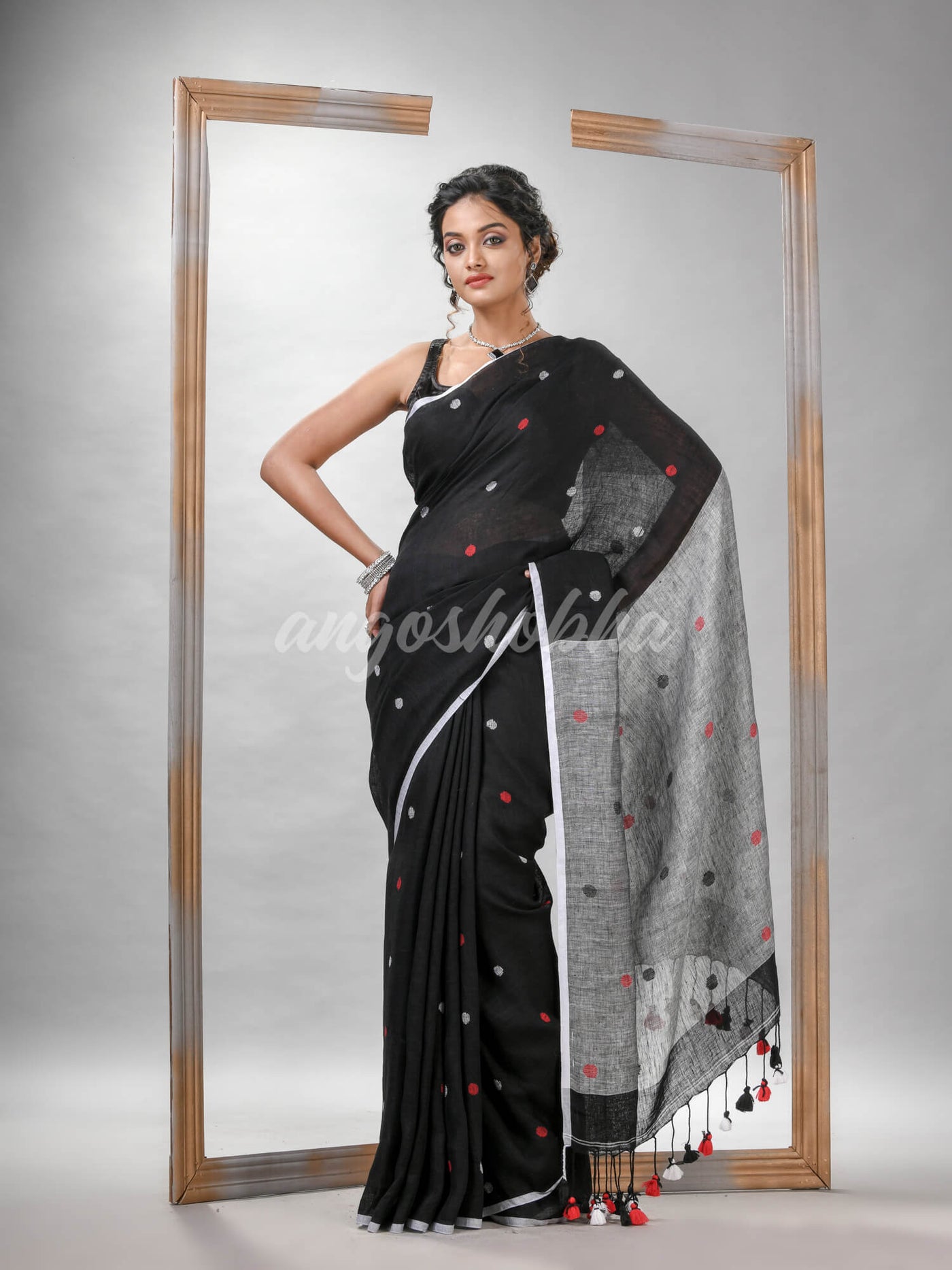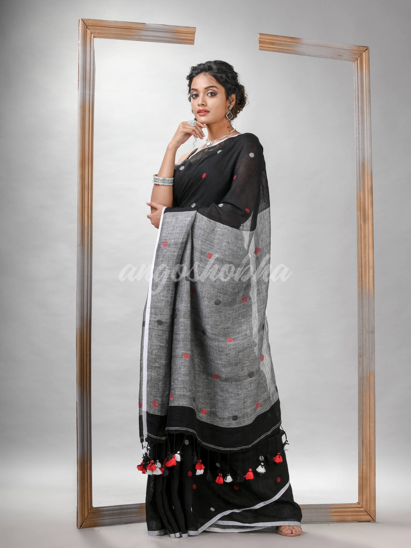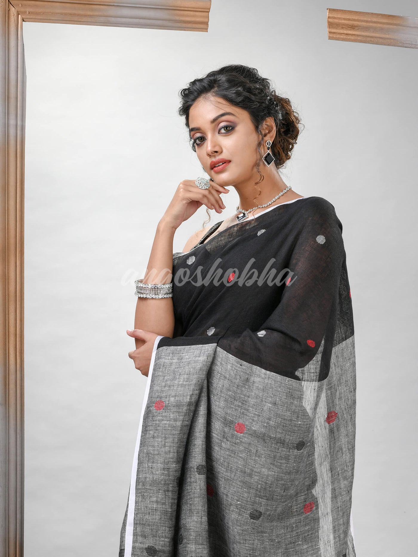 Description : Accentuate your ethnic ensemble by wearing this saree from Angoshobha. Sarees have their own grace, specially this one. This saree from Angoshobha is a beautiful Black colour handloom linen saree. the saree all body motive, .with white colour chen border. it is pallu Grey colour.The saree cones with Grey colour running blouse piece. this beauty gives the most comfortable fit. Style it with minimal jewellery and high heels to slay the ethnic look.Colour hues may slightly vary from that which appears in the image