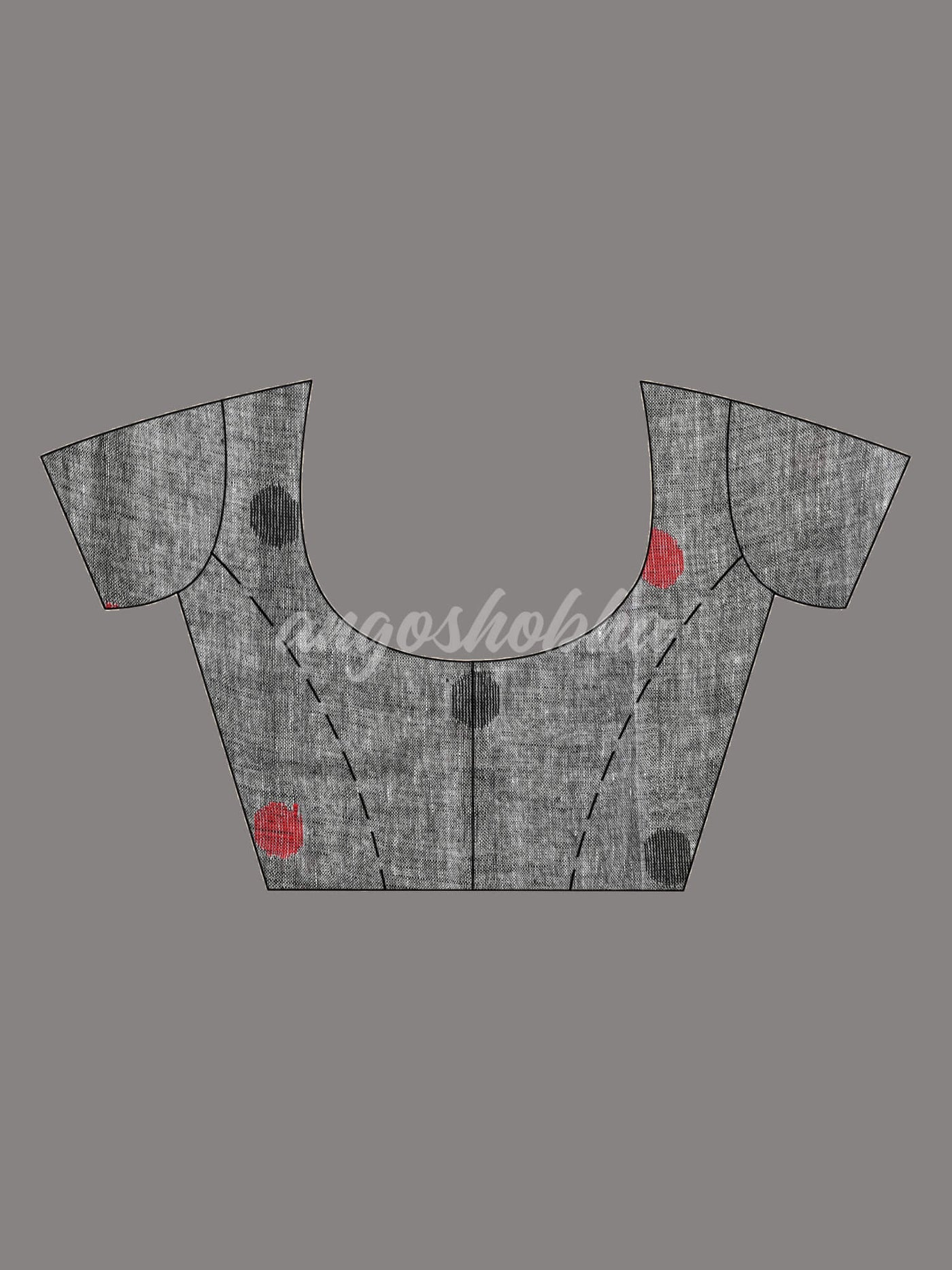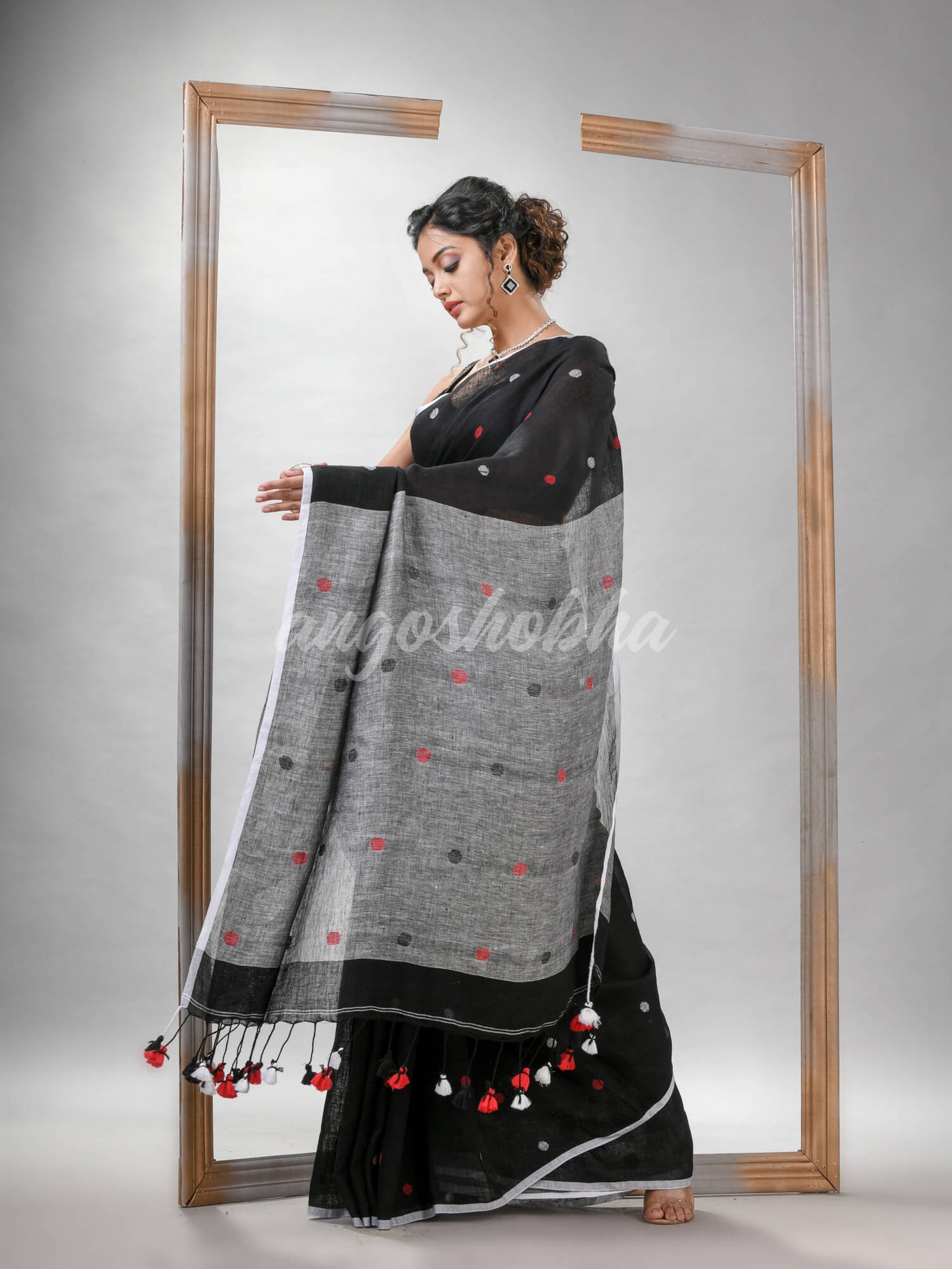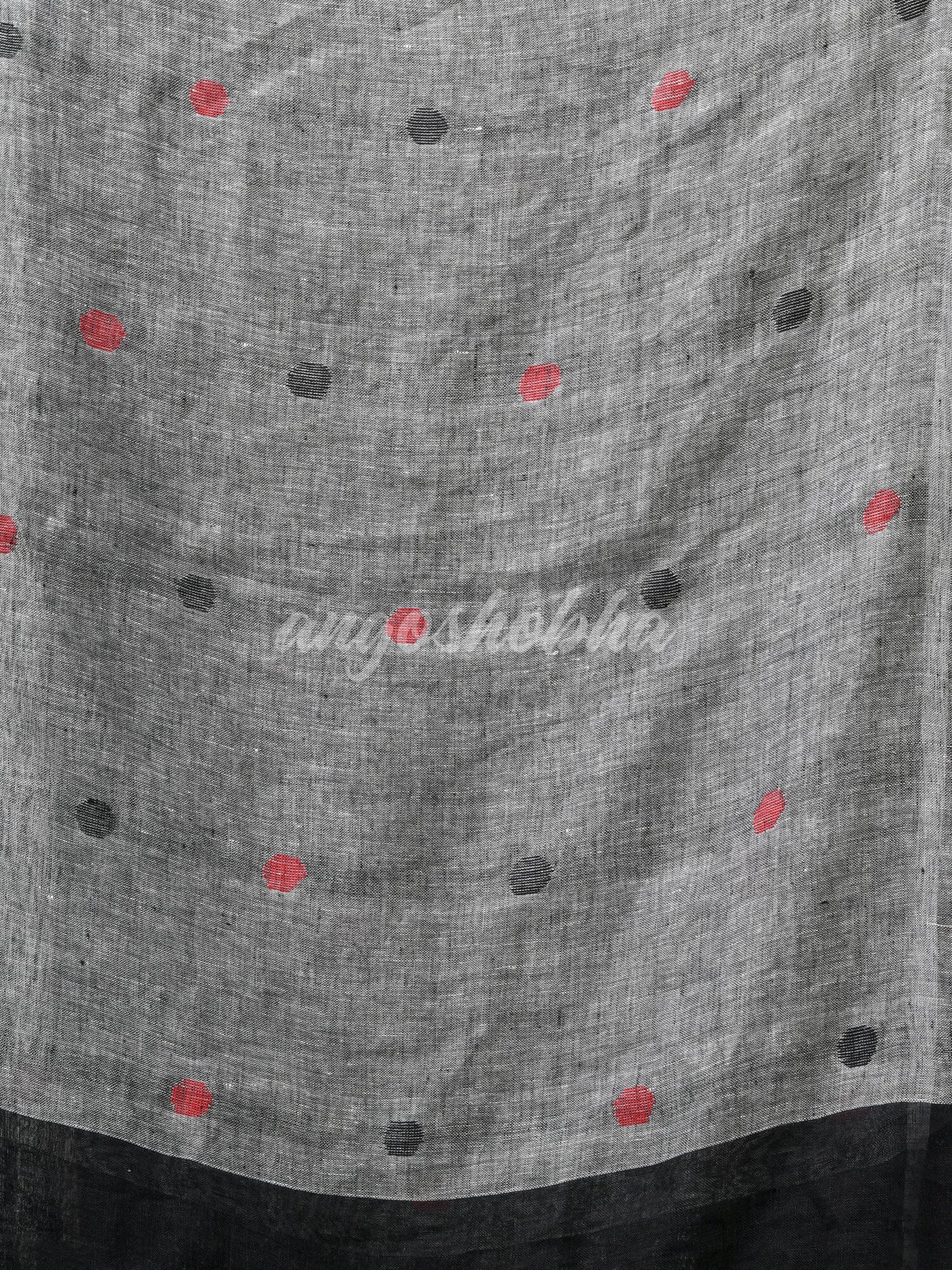 Description : Accentuate your ethnic ensemble by wearing this saree from Angoshobha. Sarees have their own grace, specially this one. This saree from Angoshobha is a beautiful Black colour handloom linen saree. the saree all body motive, .with white colour chen border. it is pallu Grey colour.The saree cones with Grey colour running blouse piece. this beauty gives the most comfortable fit. Style it with minimal jewellery and high heels to slay the ethnic look.Colour hues may slightly vary from that which appears in the image