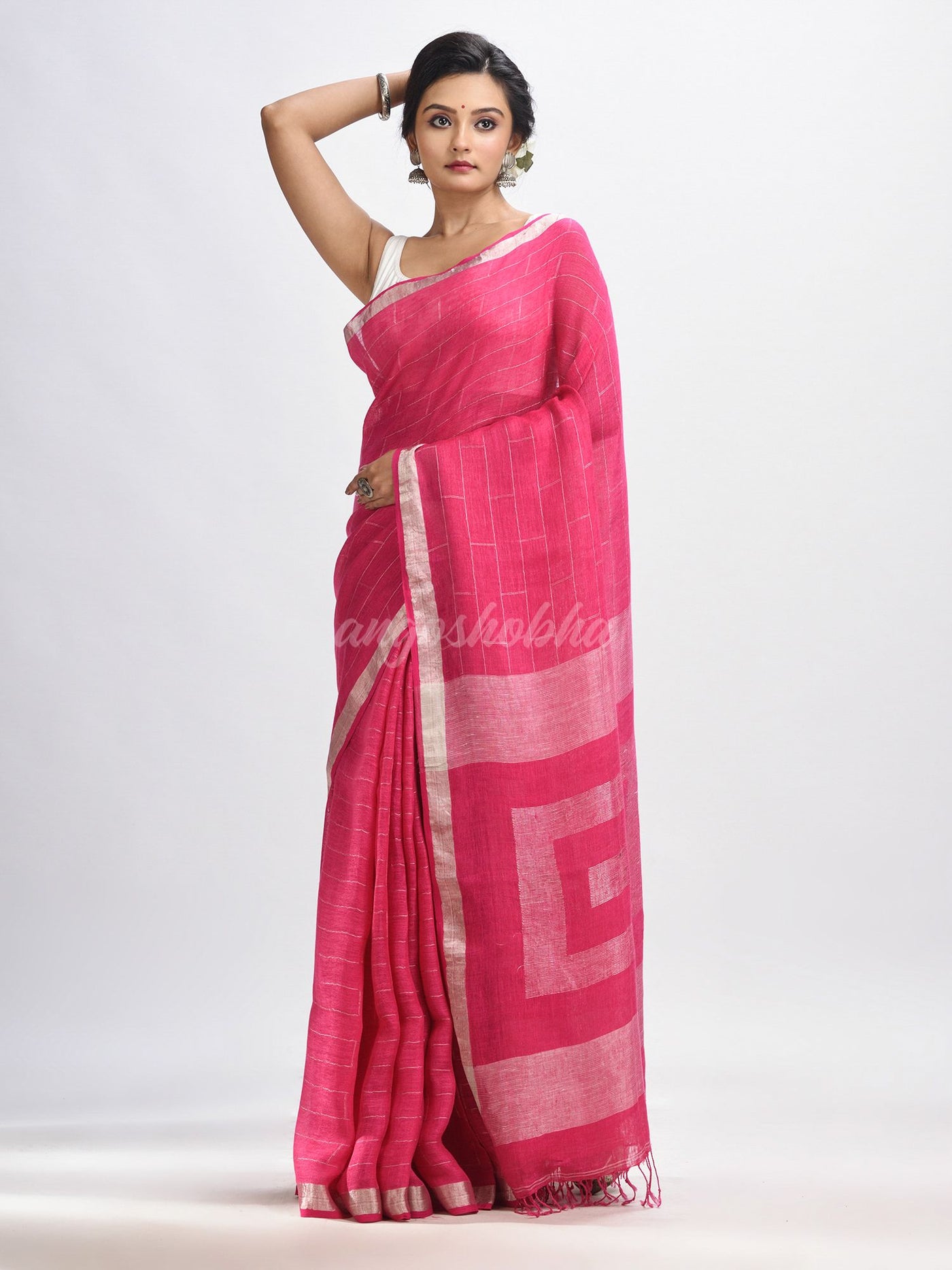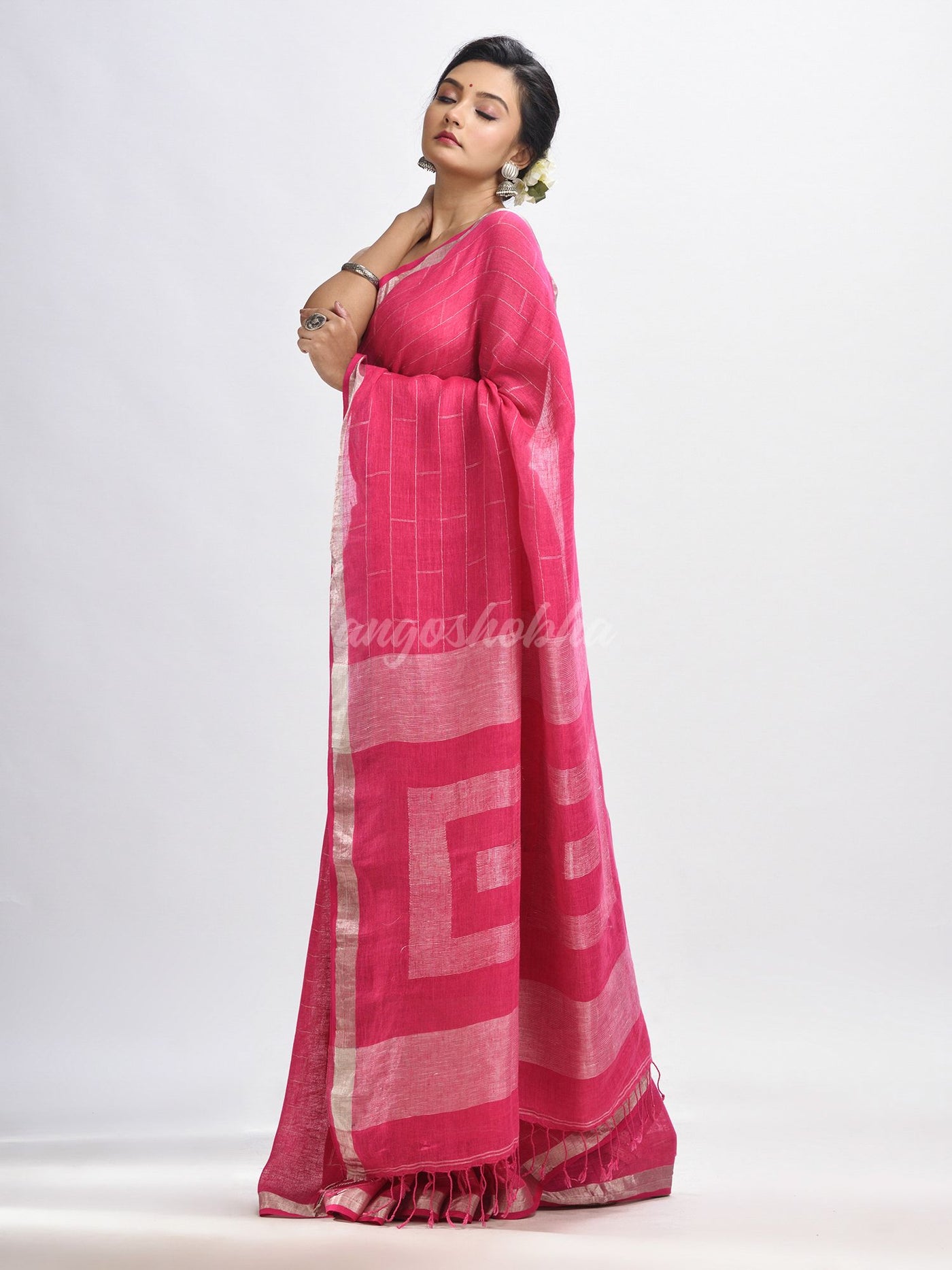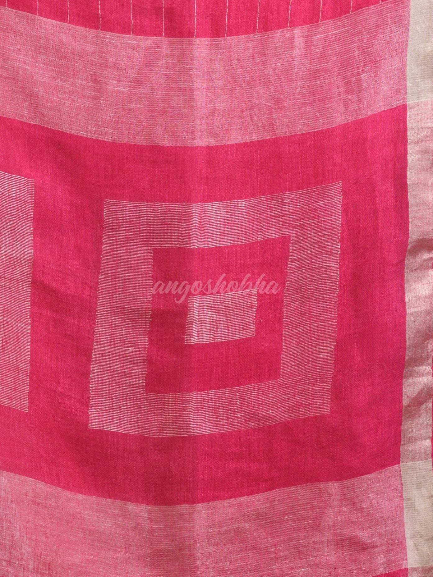 Description: Accentuate your ethnic ensemble by wearing this saree from Angoshobha. Sarees have their own grace, specially this one.This saree from Angoshobha is a beautiful Light pink traditional llinen jamdani saree. The border of the sari is disguised with silver color.The hem of the sari is disguised with Light pink blouse piece.Crafted in a linen fabric, this beauty gives the most comfortable fit.The body of the saree is disguised box design.Style of it with minimal jewellery and high heels to slay the ethnic look.You can wear anywhere and any festival moment with wonderful enjoyment.Store in clean and dry place, away from insects, dust, excessive light and moisture.