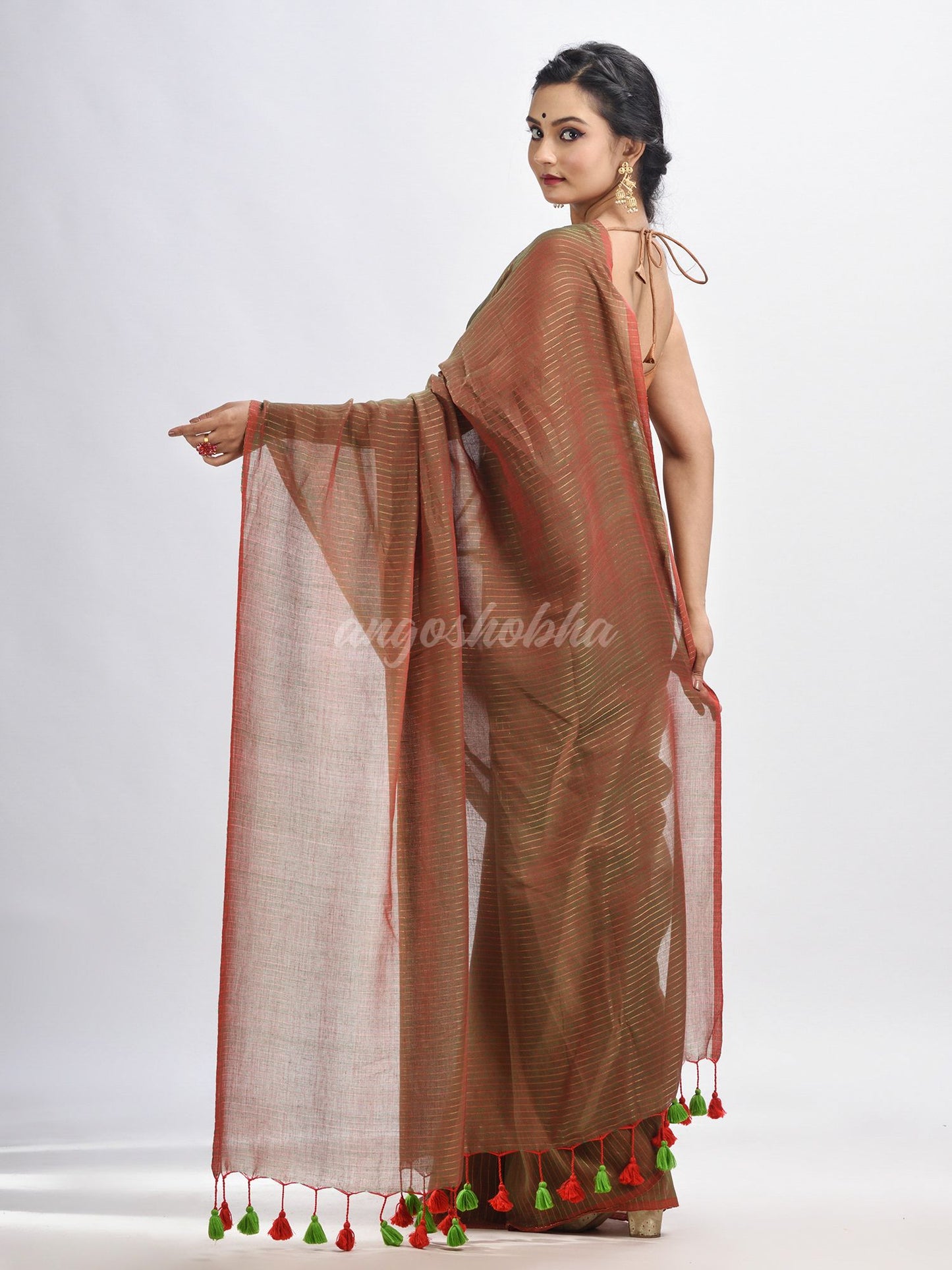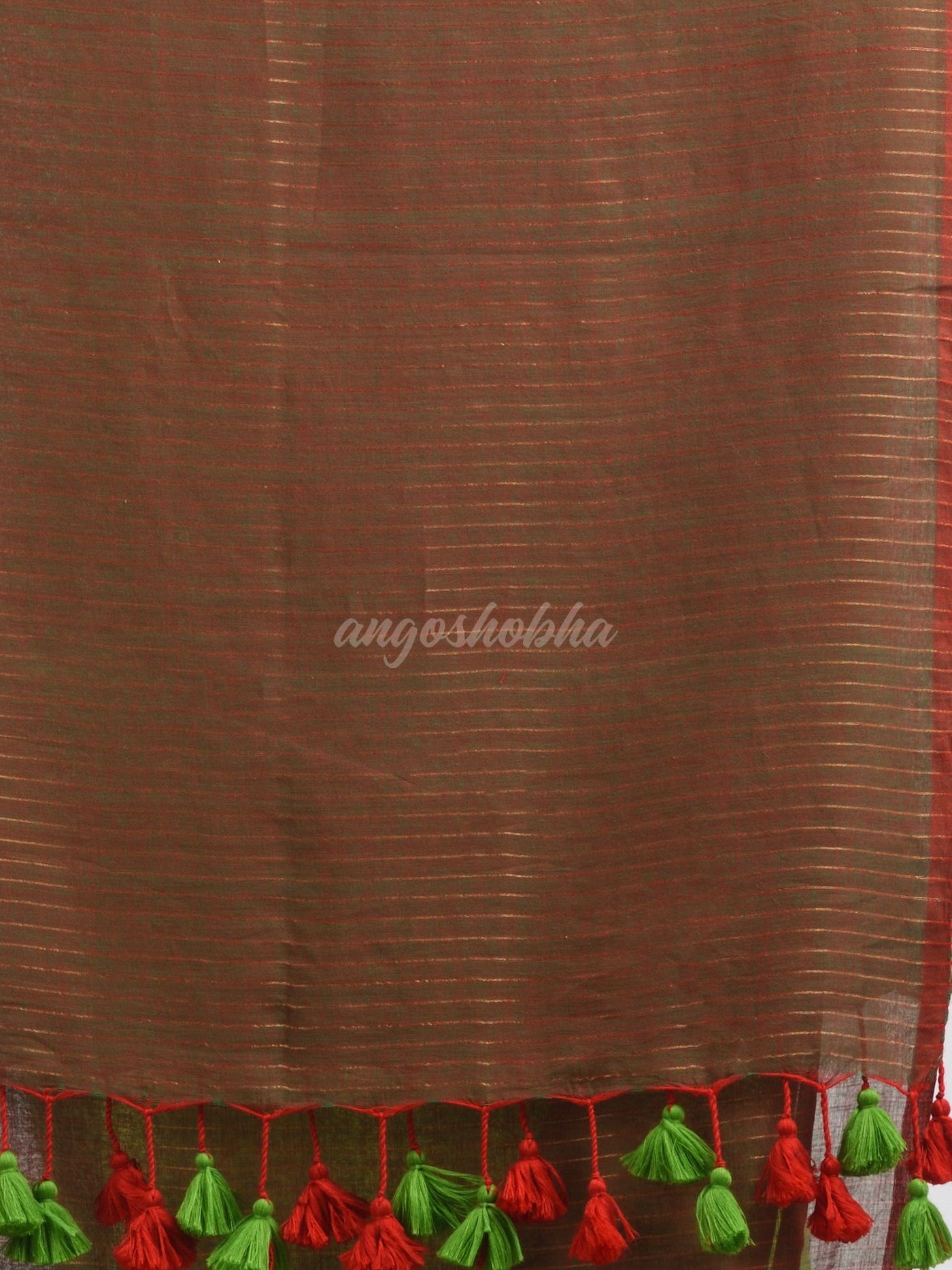 Description:    Make a utterance in the society by wearing our latest new collection Traditional This Lime Green molmol zari cotton handloom cotton saree .The saree all body golden zari strip.with self border .with pallu Green and Red  colour pompom added. is crafted by skilled craftsmen using high quality cotton fabric without compromising on its quality. Colour hues may slightly vary from that which appears in the image