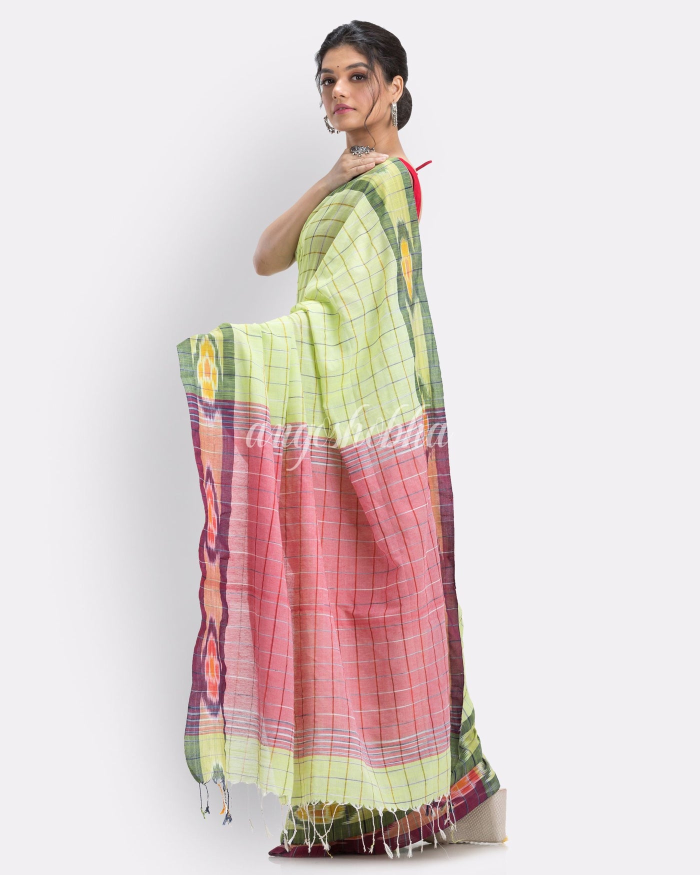 Description: Accentuate your ethnic ensemble by wearing this saree from Angoshobha. Sarees have their own grace, specially this one. This saree from Angoshobha is a beautiful lime colour handloom saree with handwoven work with unique border all over. It comes with a vibrant red border pallu and an attached blouse piece. Crafted in a molmol cotton fabric, this beauty gives the most comfortable fit. Style it with minimal jewellery and high heels to slay the ethnic look.You can wear anywhere and any festival moment with wonderful enjoyment.So collect this product and enjoy with wearing cotton saree. Obviously you can trust on this collection. We are always with your fashion and choice.