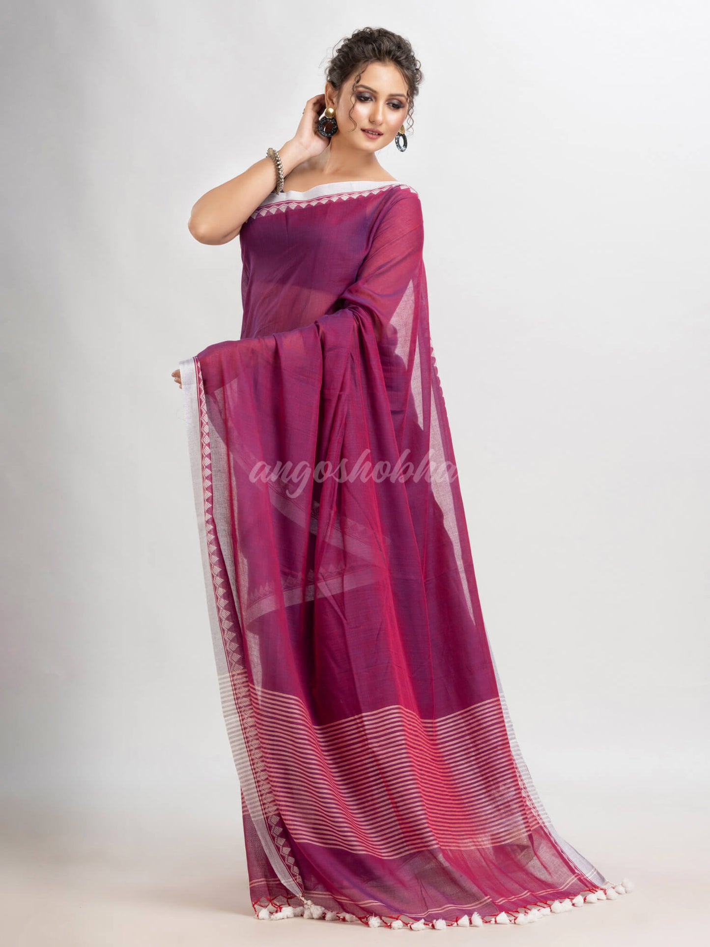 Description: Edorne your fashion and choice with our latest sari of Angoshobha.It is on of the unique sari and high quality fabric. Sarees have their own grace, specially this one. This saree from Angoshobha is a beautiful Magenta handloom saree.The saree all body solid ,With white colour jacquard temple broder.and pallu white stripe.