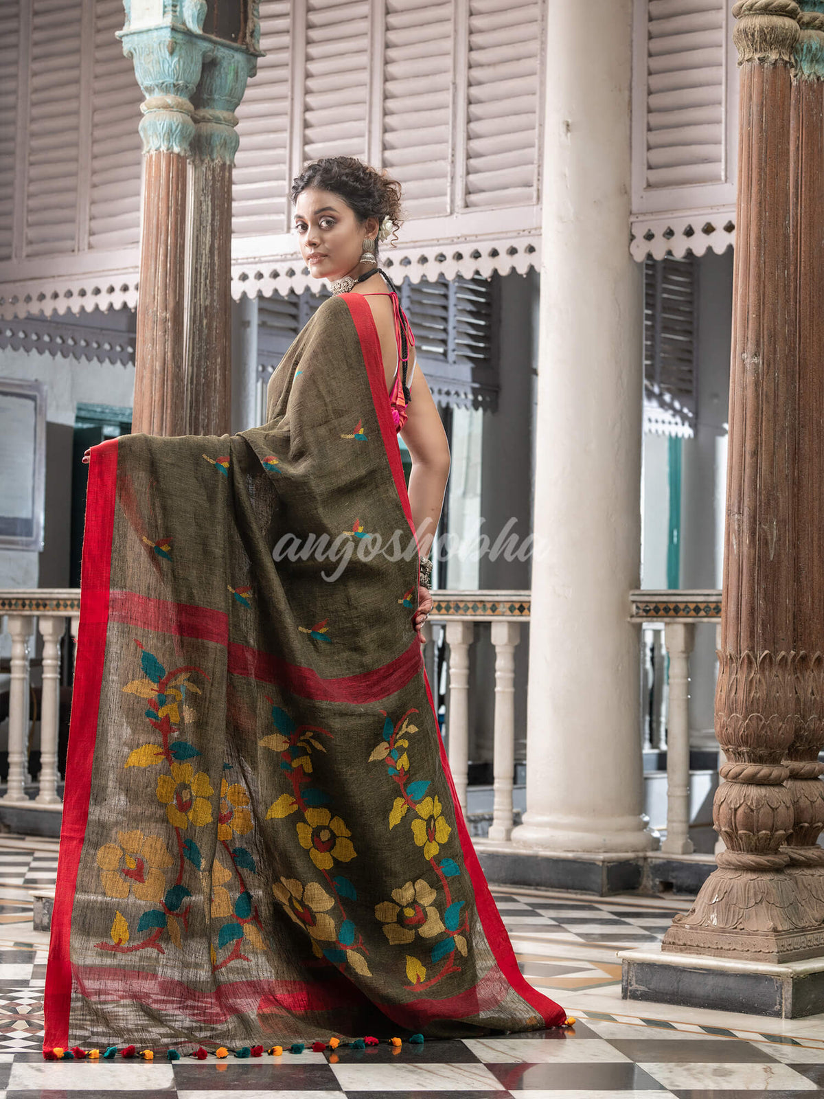Description: Angoshobha’s ethnic saree comes with an unstitched blouse piece, which can be stitched according to your taste and preference. This Moss green linen jamdani saree is crafted by skilled craftsmen using high quality linen fabric without compromising on its quality.The border of the saree is concocted with red colour  and the hem of the saree is designed with latest combination and spreading the body with motifs.And pallu flower motifs. Saree is very comfortable in summer and suitable for festivals .With this beautiful jamdani design and fabric, this saree and blouse set will fetch you Oodles of compliments and praises.So collect this product very soon.