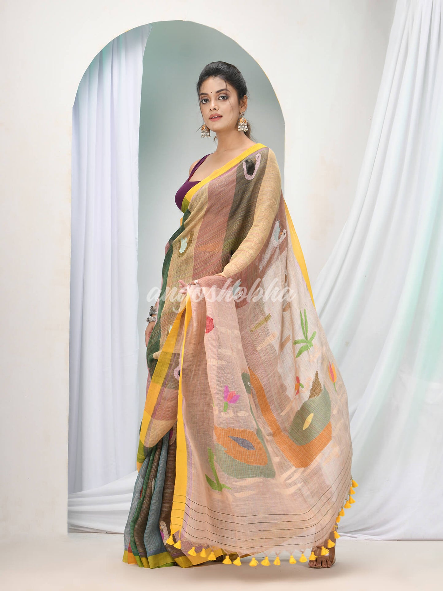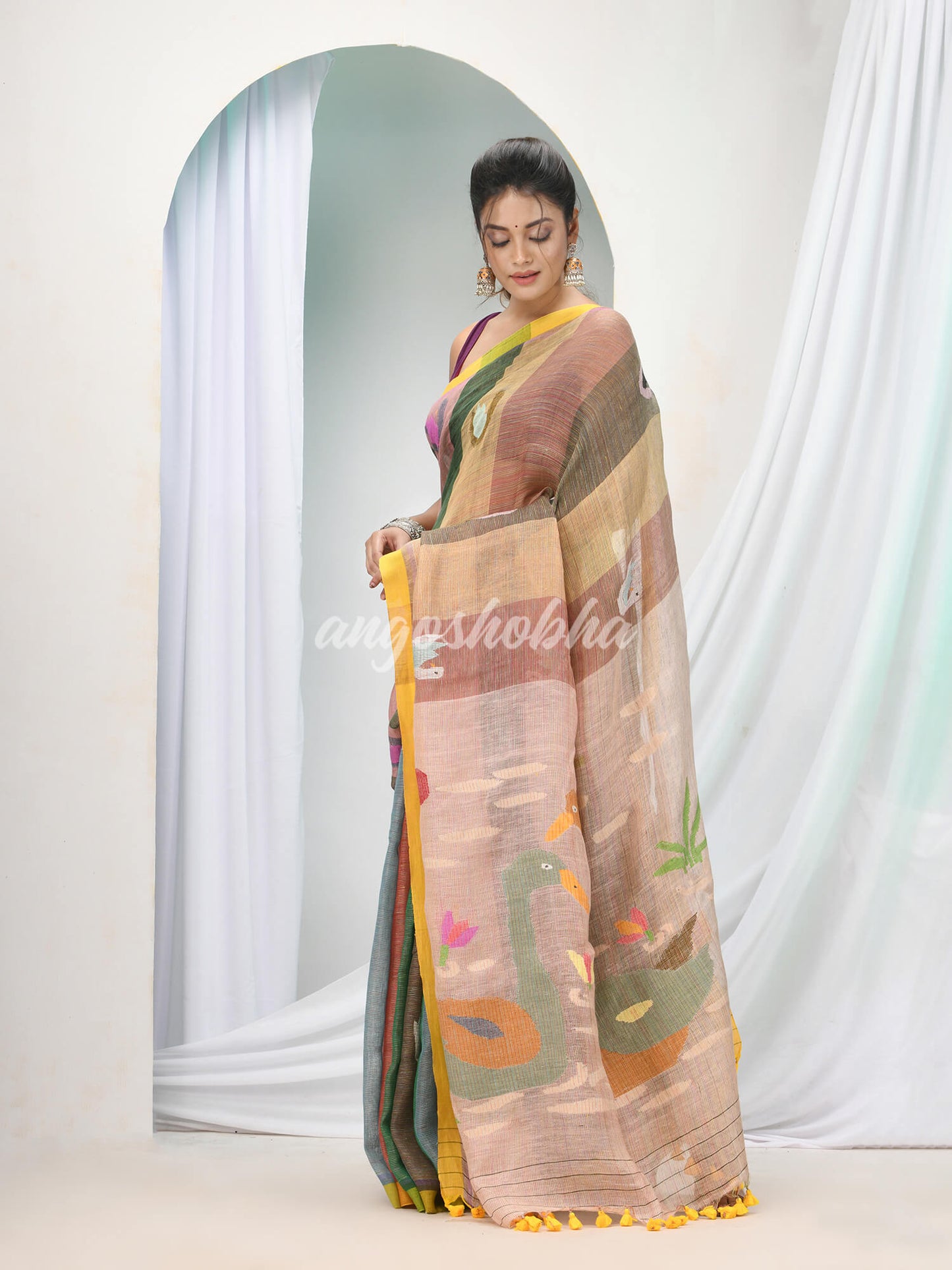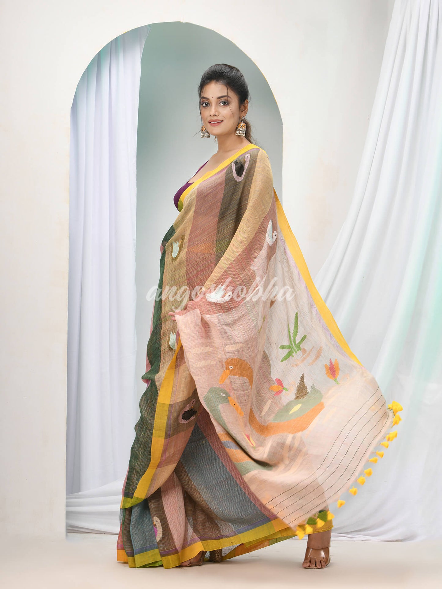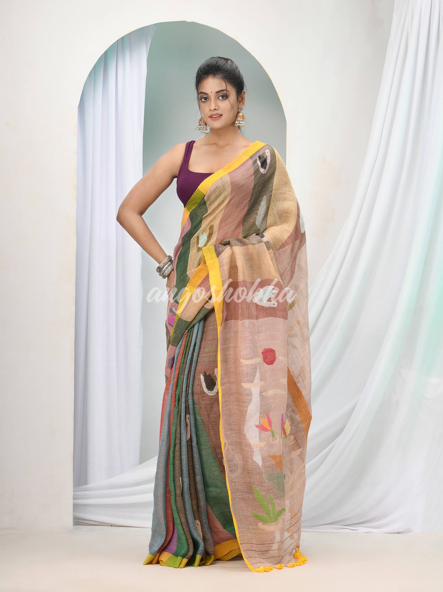 This exquisite Multicolour Linen Handloom Saree is perfect for those who appreciate traditional craftsmanship and elegant designs. Made with high-quality linen, it offers a comfortable and breathable fit. The multicolour palette adds a modern twist to the classic handloom technique. Elevate your style with this timeless piece.