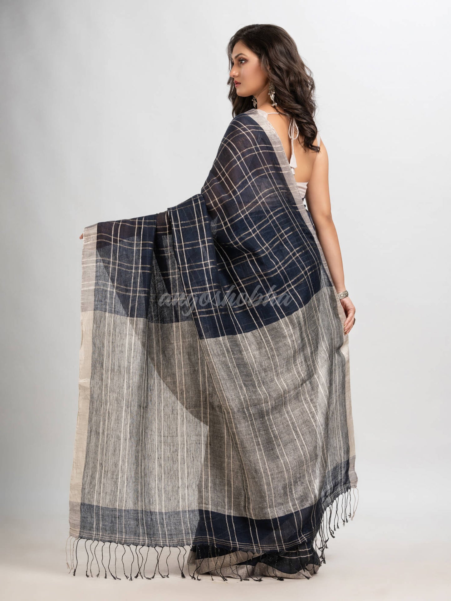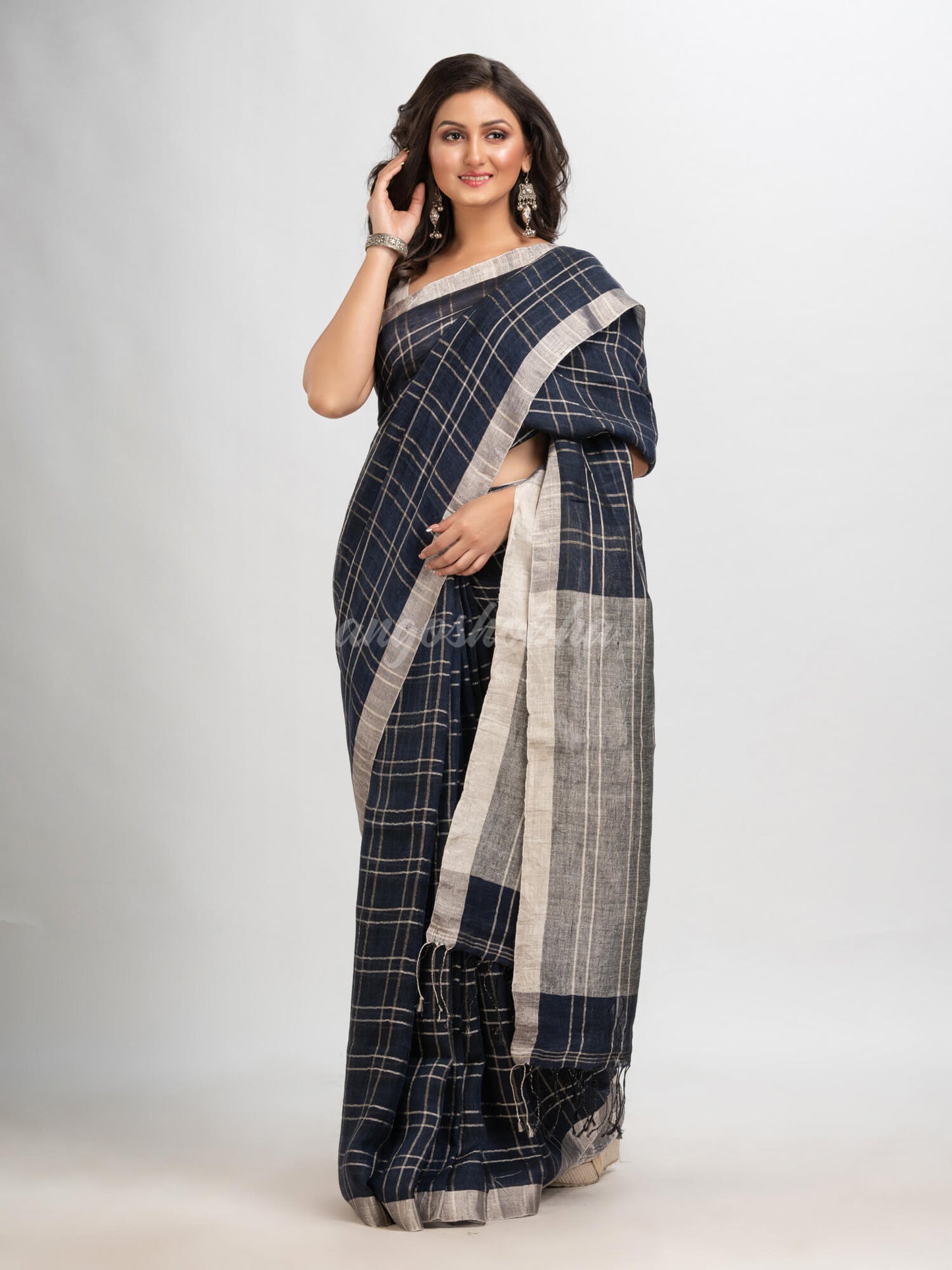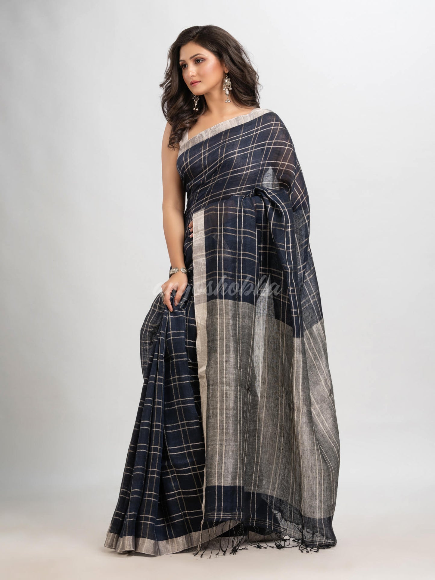 Description: Accentuate your ethnic ensemble by wearing this saree from Angoshobha. Sarees have their own grace, specially this one. This saree from Angoshobha is a beautiful Navy blue handloom saree. with check linen work all over.The border of the sari is disguised with silver color .The hem of the sari is disguised with Navy blue colour and an attached blouse piece. Crafted in a linen fabric, this beauty gives the most comfortable fit. Style of it with minimal jewellery and high heels to slay the ethnic look.You can wear anywhere and any festival moment with wonderful enjoyment.So collect this product and enjoy with wearing linen saree. Obviously you can trust on this collection. We are always with your fashion and choice.