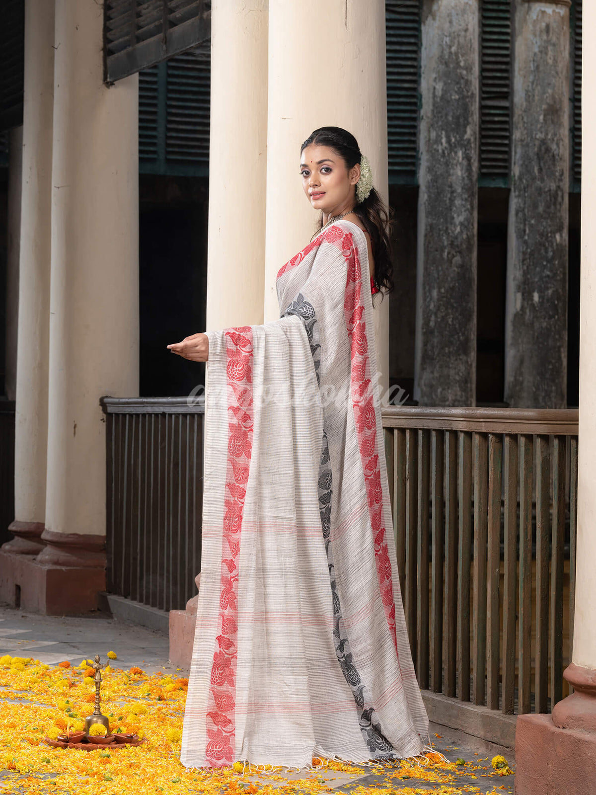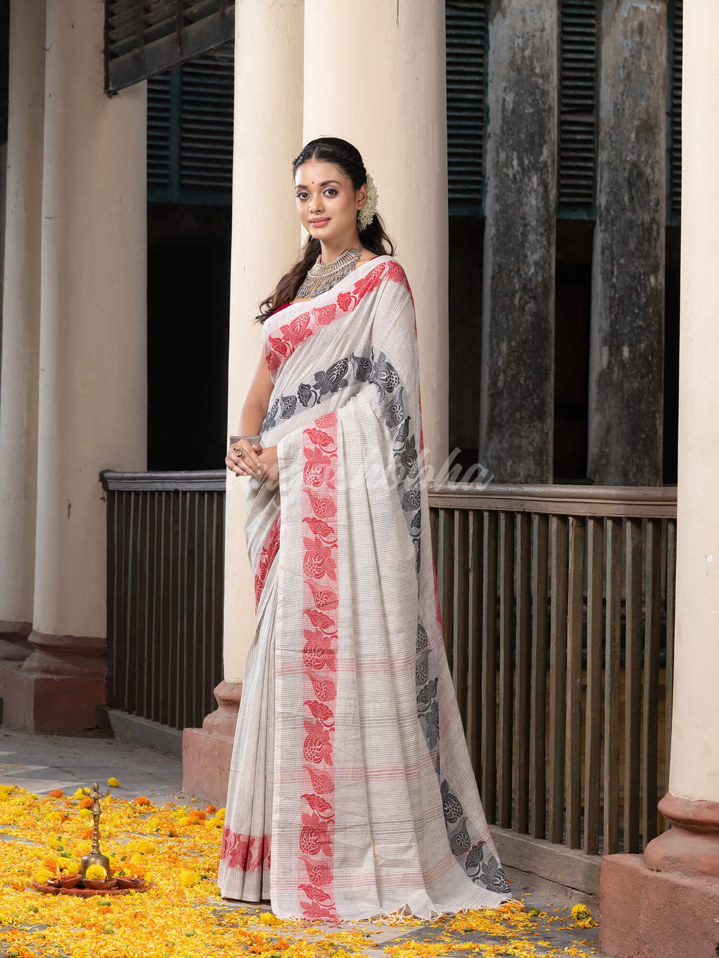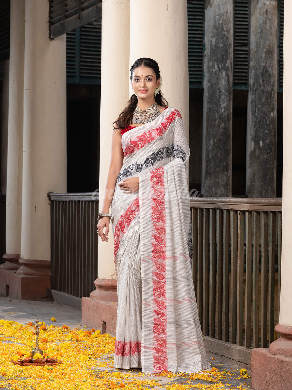 Description: Accentuate your ethnic ensemble by wearing this saree from Angoshobha. Sarees have their own grace, specially this one. This saree from Angoshobha is a beautiful Off White cotton handloom saree . The saree all body strip and black ,red colour jacquard flower motif .with white colour chen border.with same design pallu. Crafted in a cotton fabric, this beauty gives the most comfortable fit. Style of it with minimal jewellery and high heels to slay the ethnic look. You can wear anywhere and any festival moment with wonderful enjoyment. So collect this product and enjoy with wearing cotton saree. Obviously you can trust on this collection. We are always with your fashion and choice.