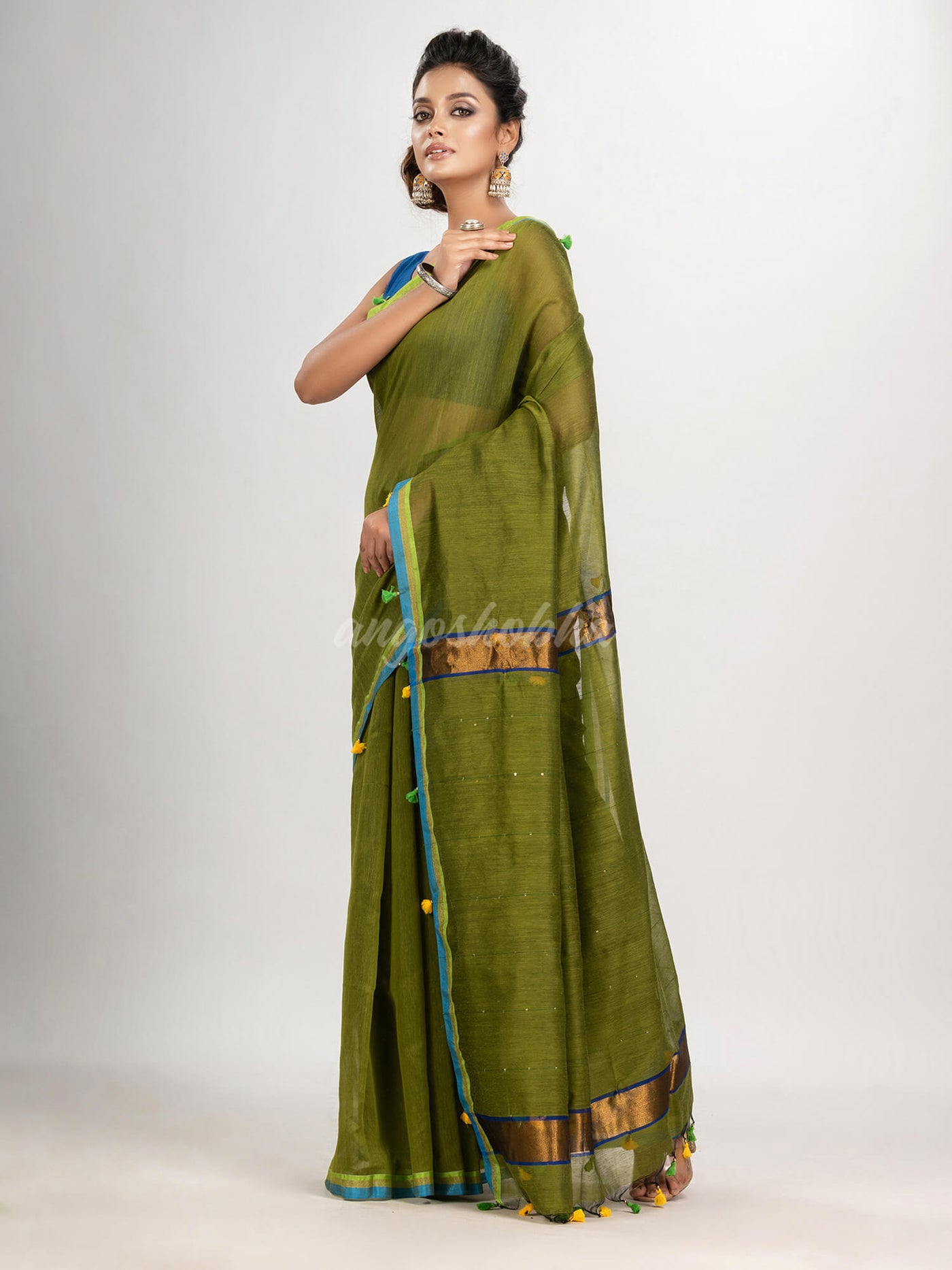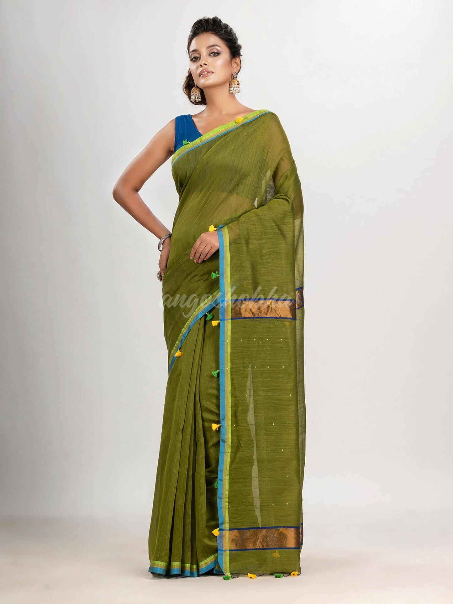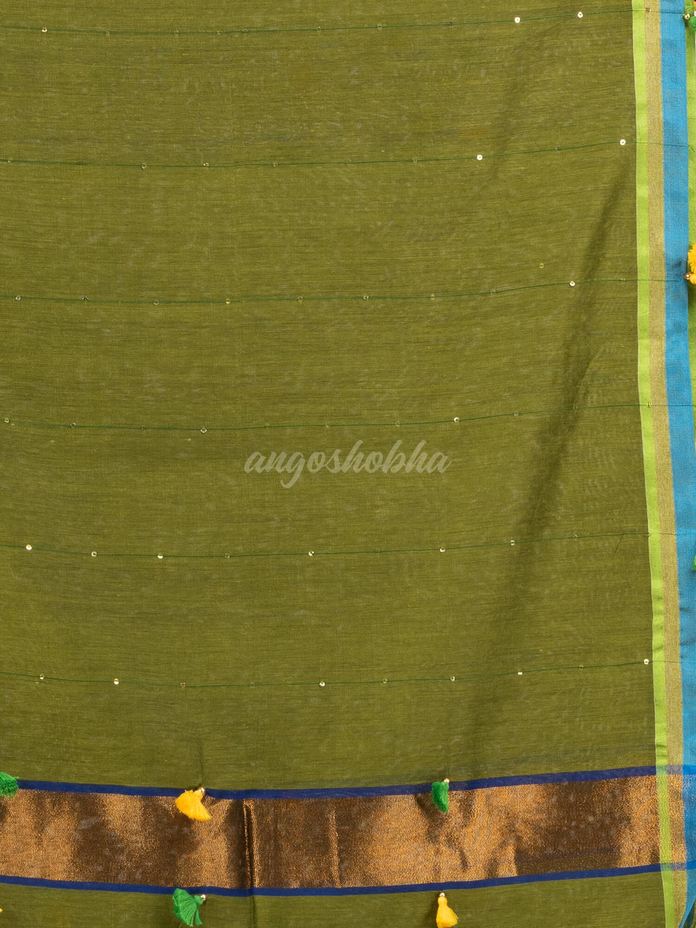 Olive green cotton blend with pompom handloom saree