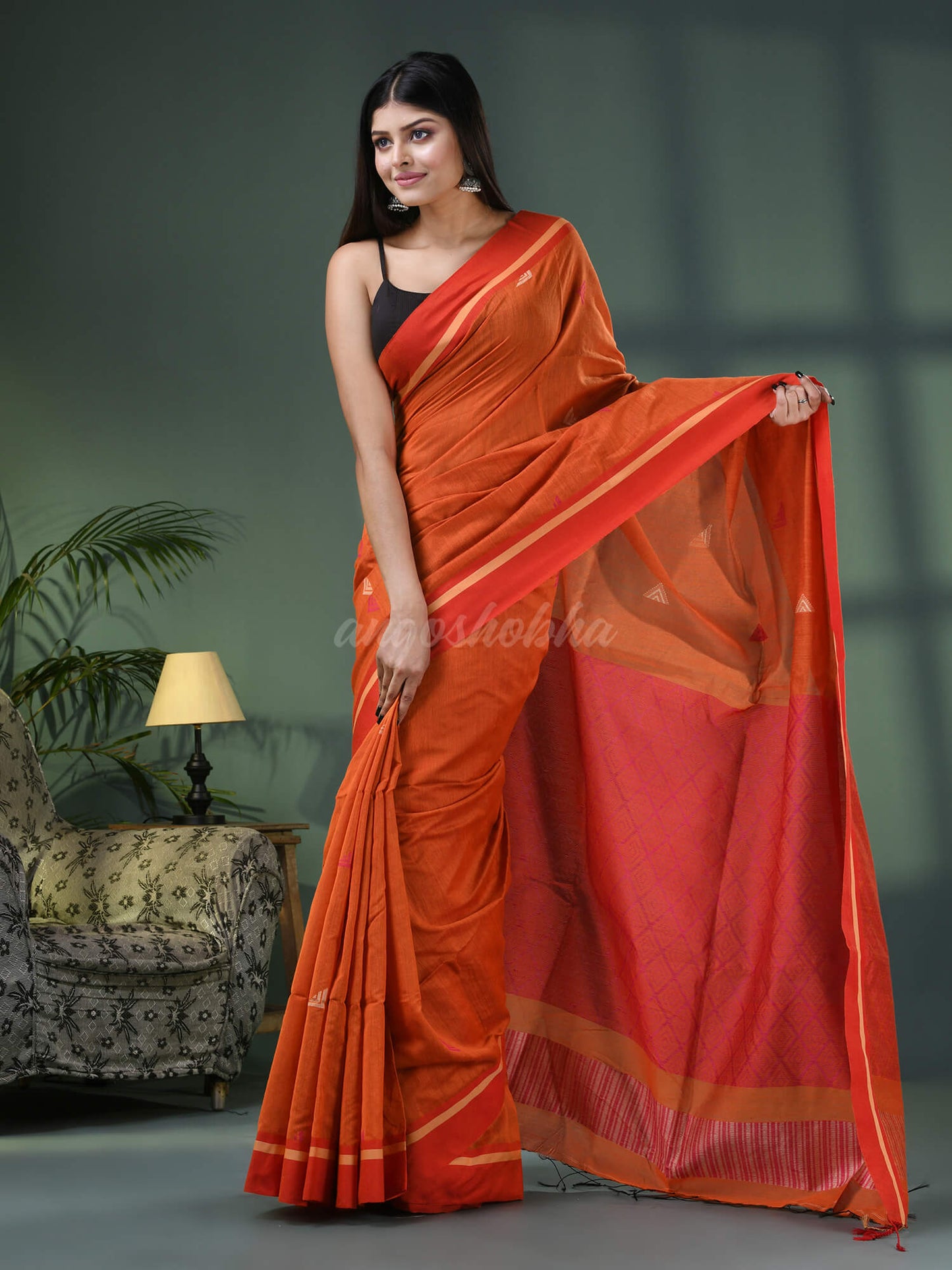 Orange Cotton Blend Jacquard Work Handloom Saree