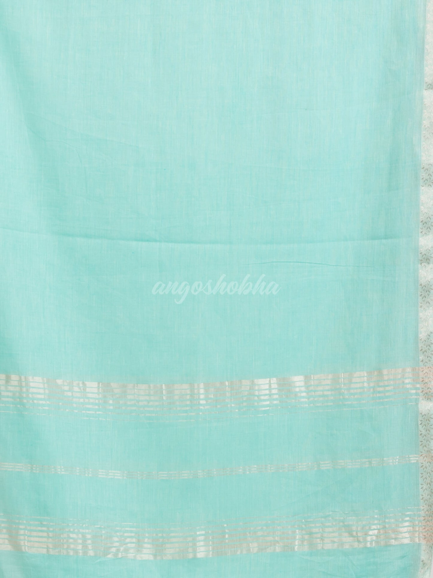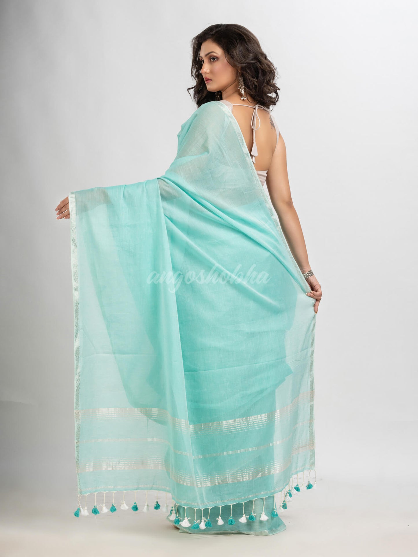 Description: Accentuate your ethnic ensemble by wearing this saree from Angoshobha. Sarees have their own grace, specially this one.This saree from Angoshobha is a beautiful Paled Turquoise cotton handloom saree .With silver zari jacquard border and pallu silver zari colour stripe ,& pompom added The hem of the saree is disguised with Paled Turquoise colour plain design. Style of it with minimal jewellery and high heels to slay the ethnic look.You can wear anywhern and Crafted in a cotton fabric, this beauty gives the most comfortable and any festival moment with wonderful enjoyment.So collect this product and enjoy with wearing cotton saree. Obviously you can trust on this collection. We are always with your fashion and choice.