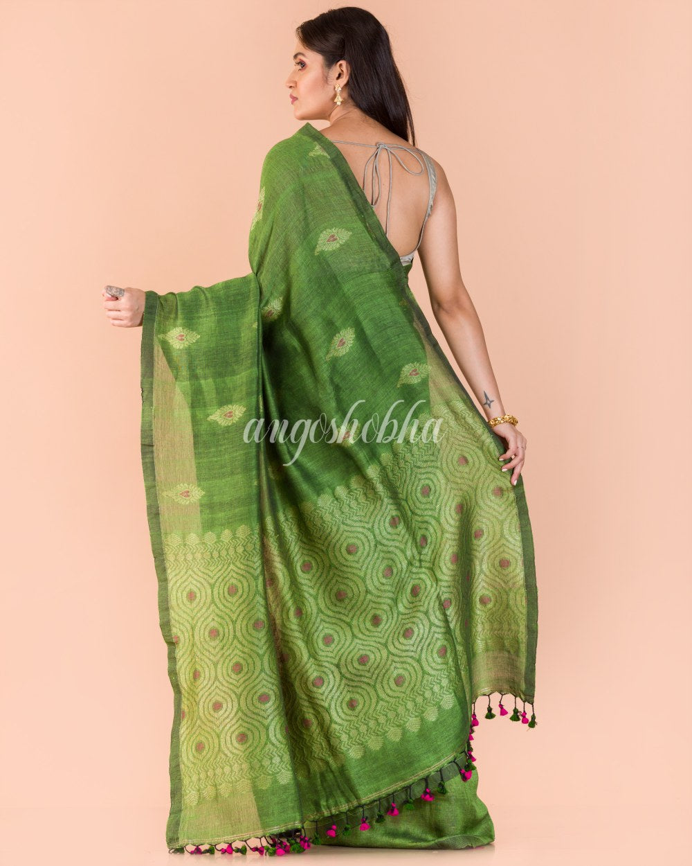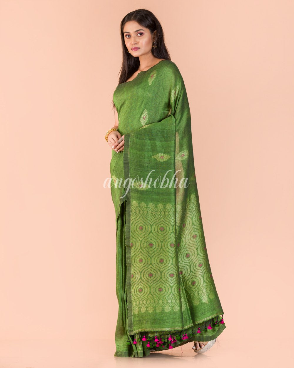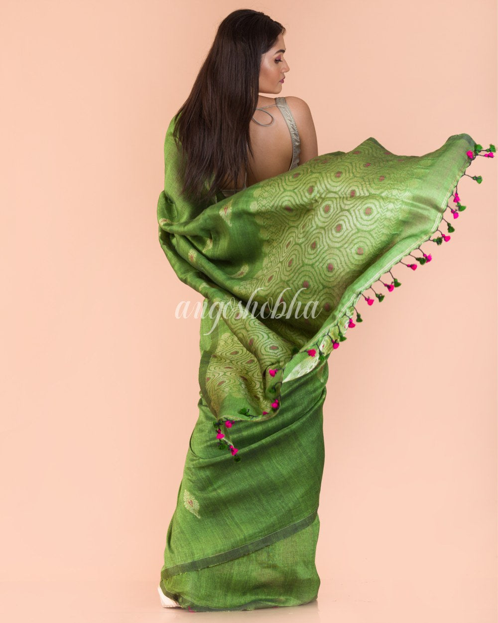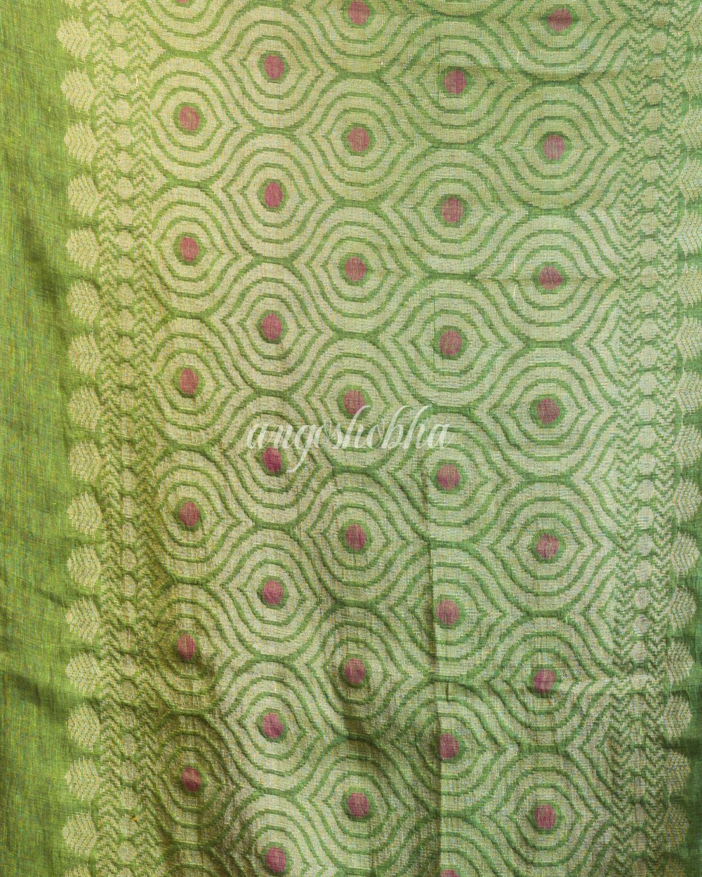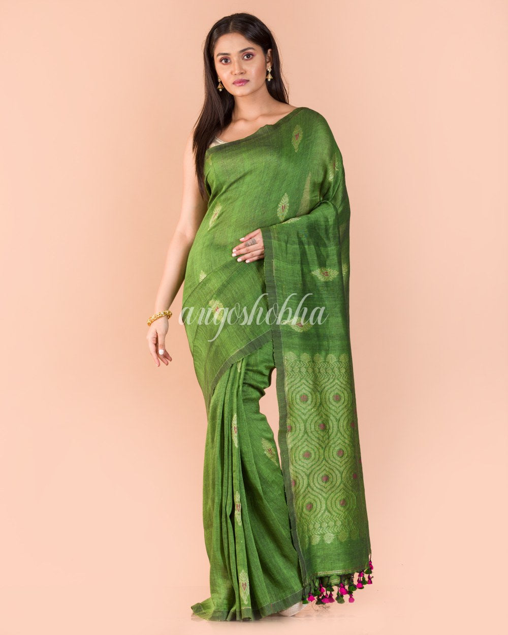 Description: Angoshobha ethnic jacquard work saree comes with an unstitched blouse piece, which can be stitched according to your taste and preference. This parrot Green tangail saree is crafted by skilled craftsmen using high quality linen fabric without compromising on its quality.The hem of the sari is disguised of parrot green and silver color combined with unique design.Over the body it is spreading out of motifs. Saree is very comfortable in summer and suitable for festivals .With this beautiful floral design and fabric, this saree and blouse set will fetch you Oodles of compliments and praises.So buy this very soon