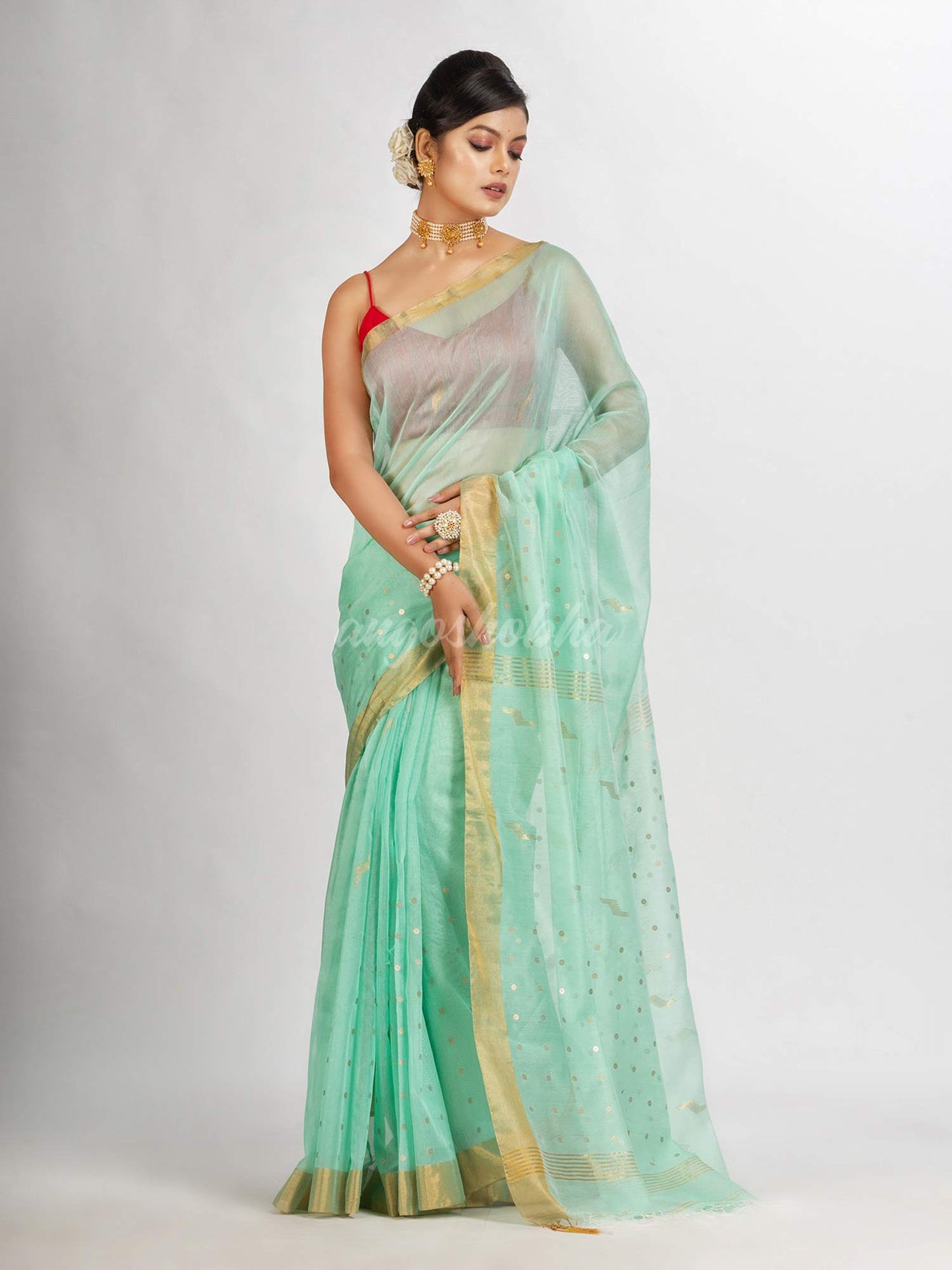 Pastel Green Silk Cotton Pocket Chumki Jamdani handloom saree