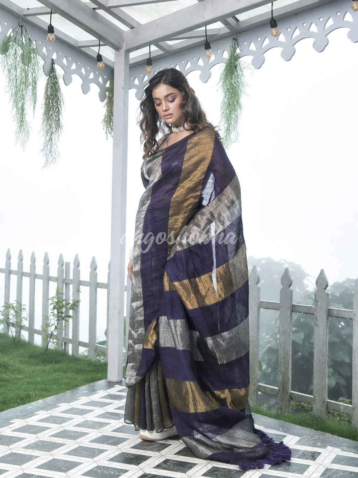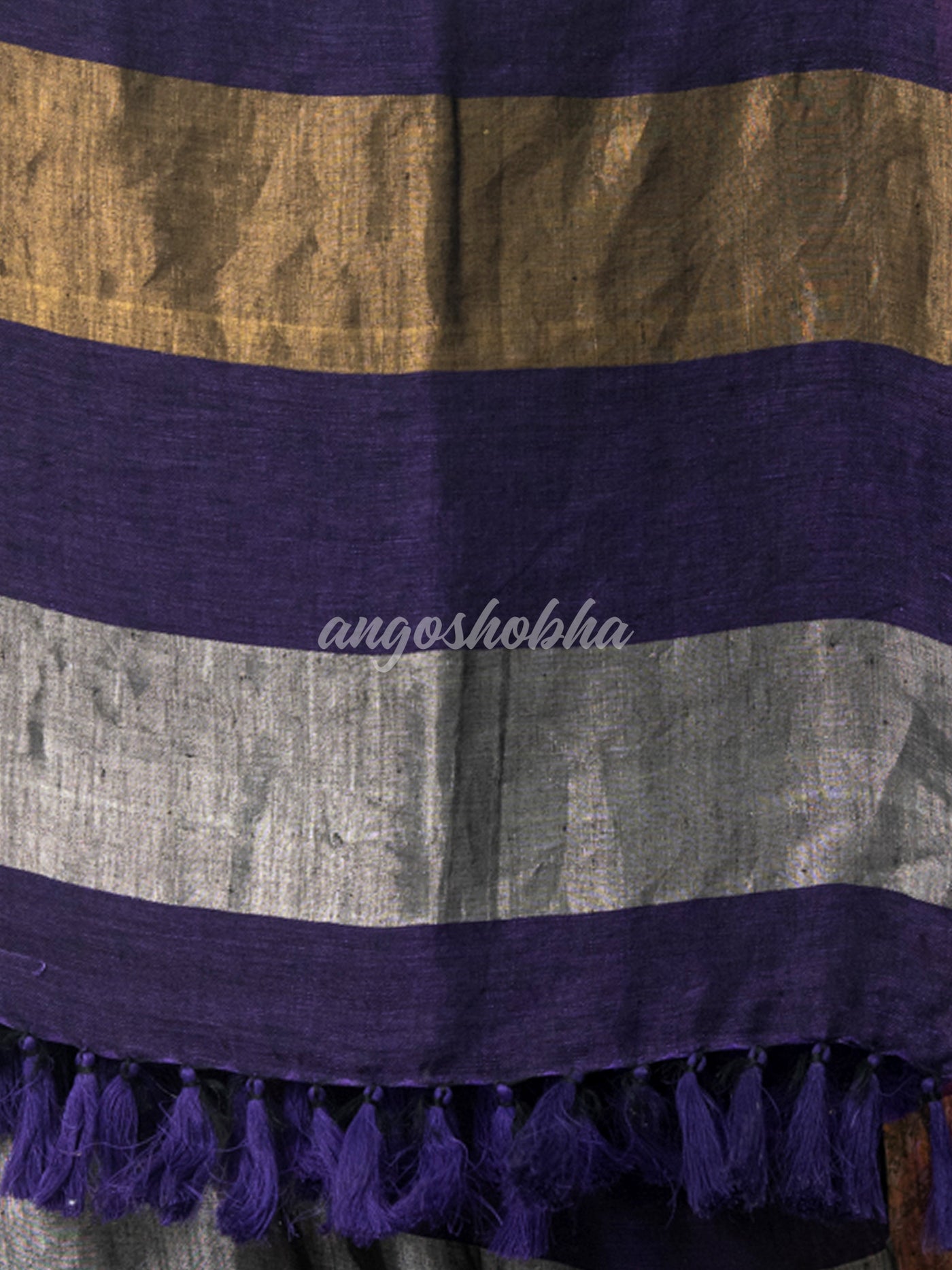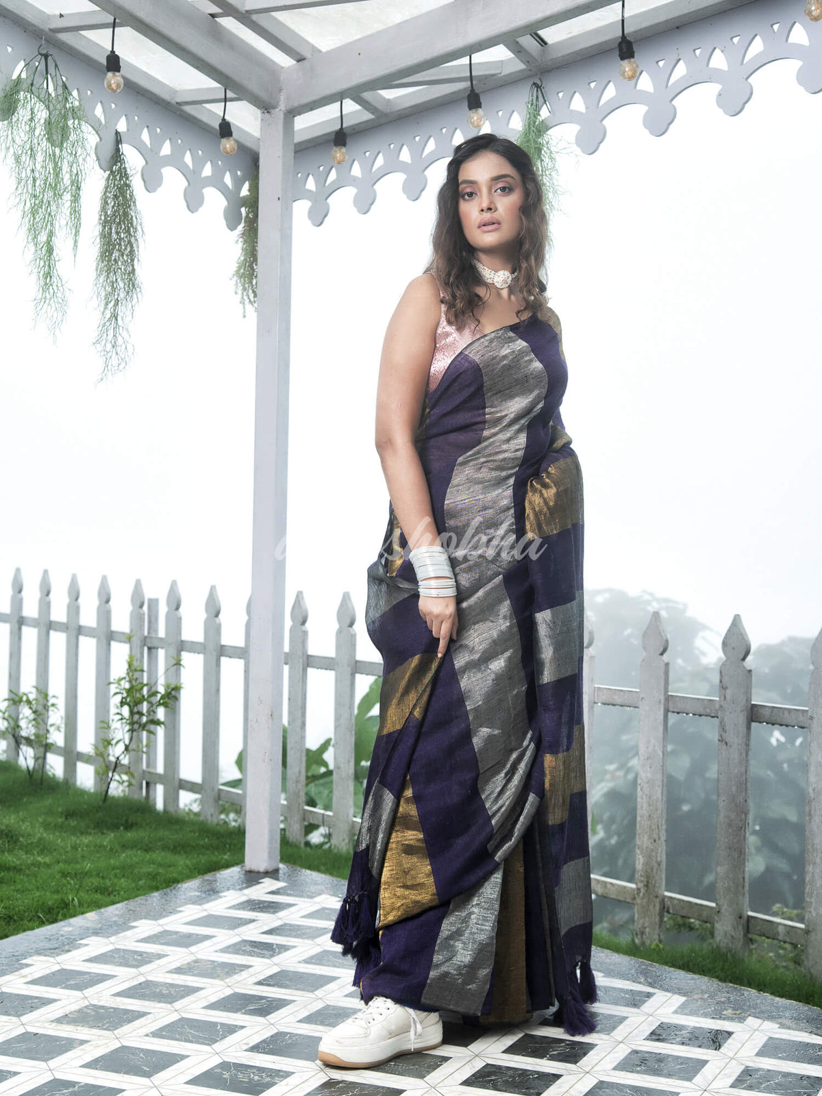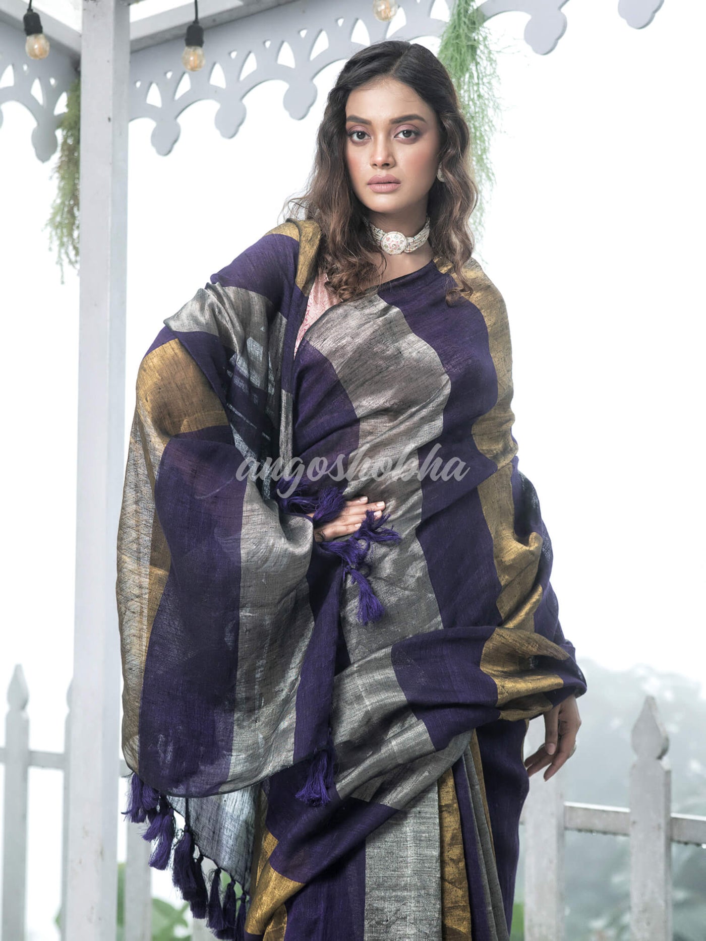Description: angoshobha's unique Purple Linen Multicolor Tissue Body with Purple Tassels Handwoven Saree features a dominant purple base color, intricately woven with alternating stripes contrast of gold and silver zari. The texture appears to have a slight crinkled effect , possibly from the weaving of the way it's draped. It is very soft and comfortable to wear in warm climates by the by in hill area also. Purple color running blouse piece is attached with this .