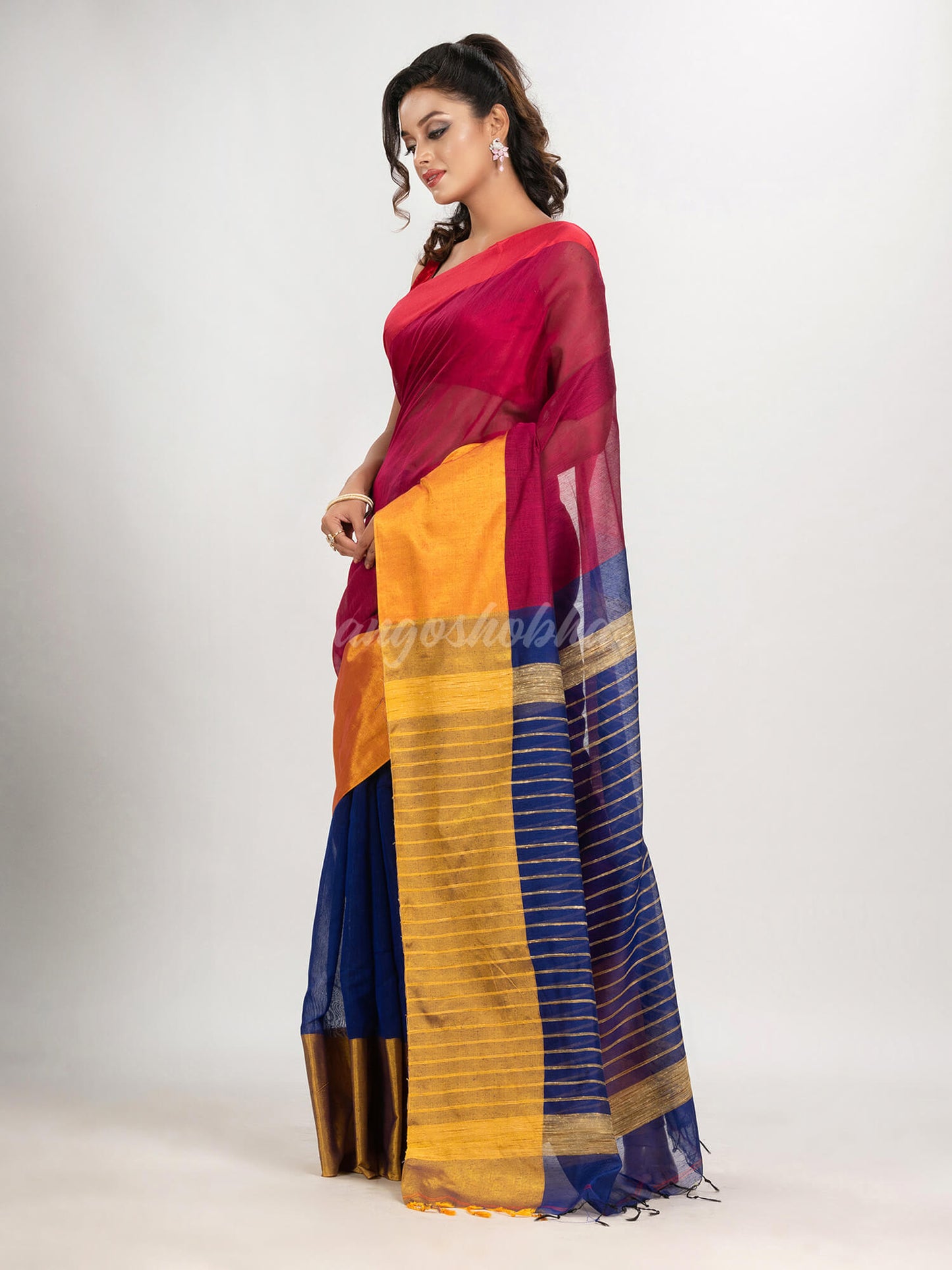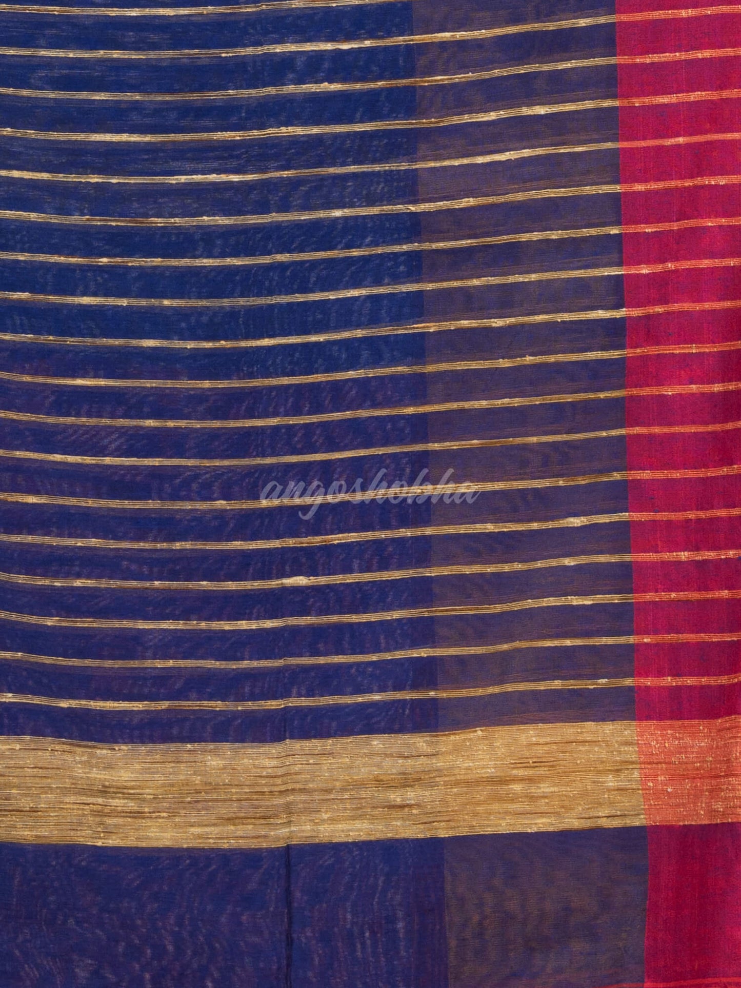 Description: Accentuate your ethnic ensemble by wearing this saree from Angoshobha. Sarees have their own grace, specially this one. This saree from Angoshobha is a beautiful Rani & Blue colour half and half handloom saree . The saree all body solid.The saree is Ganga Jamuna solid border.The saree pallu is golden zari colour strip on Blue. and an attached Blue colour blouse piece. Crafted in a soft cotton bend fabric, this beauty gives the most comfortable fit. Style it with minimal jewellery and high heels to slay the ethnic look.You can wear anywhere and any festival moment with wonderful enjoyment.So collect this product and enjoy with wearing cotton saree. Obviously you can trust on this collection. We are always with your fashion and choice.