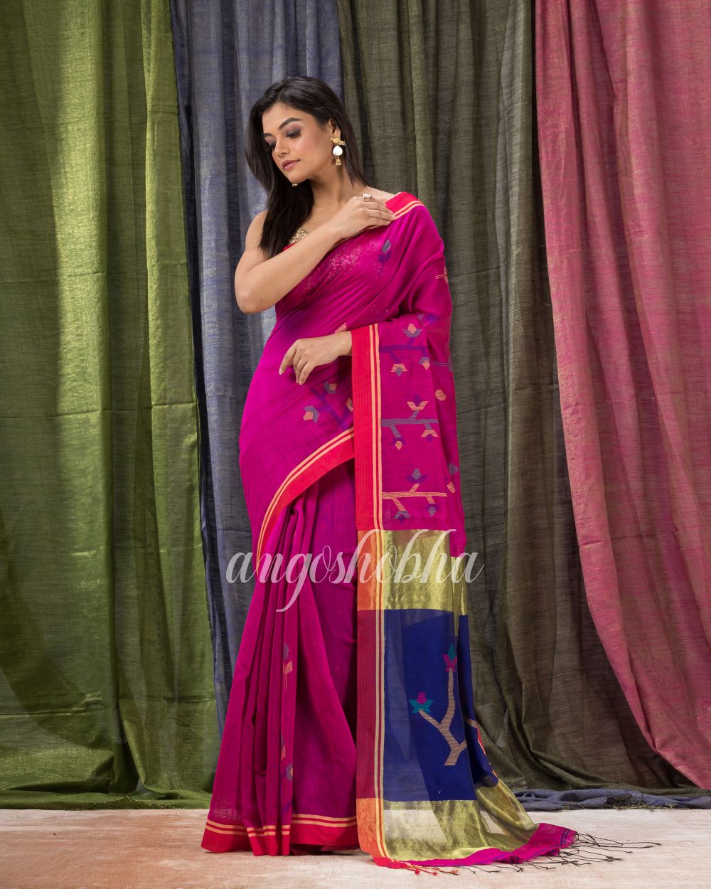 Rani Pink Cotton Blend Traditional Jamdani Saree