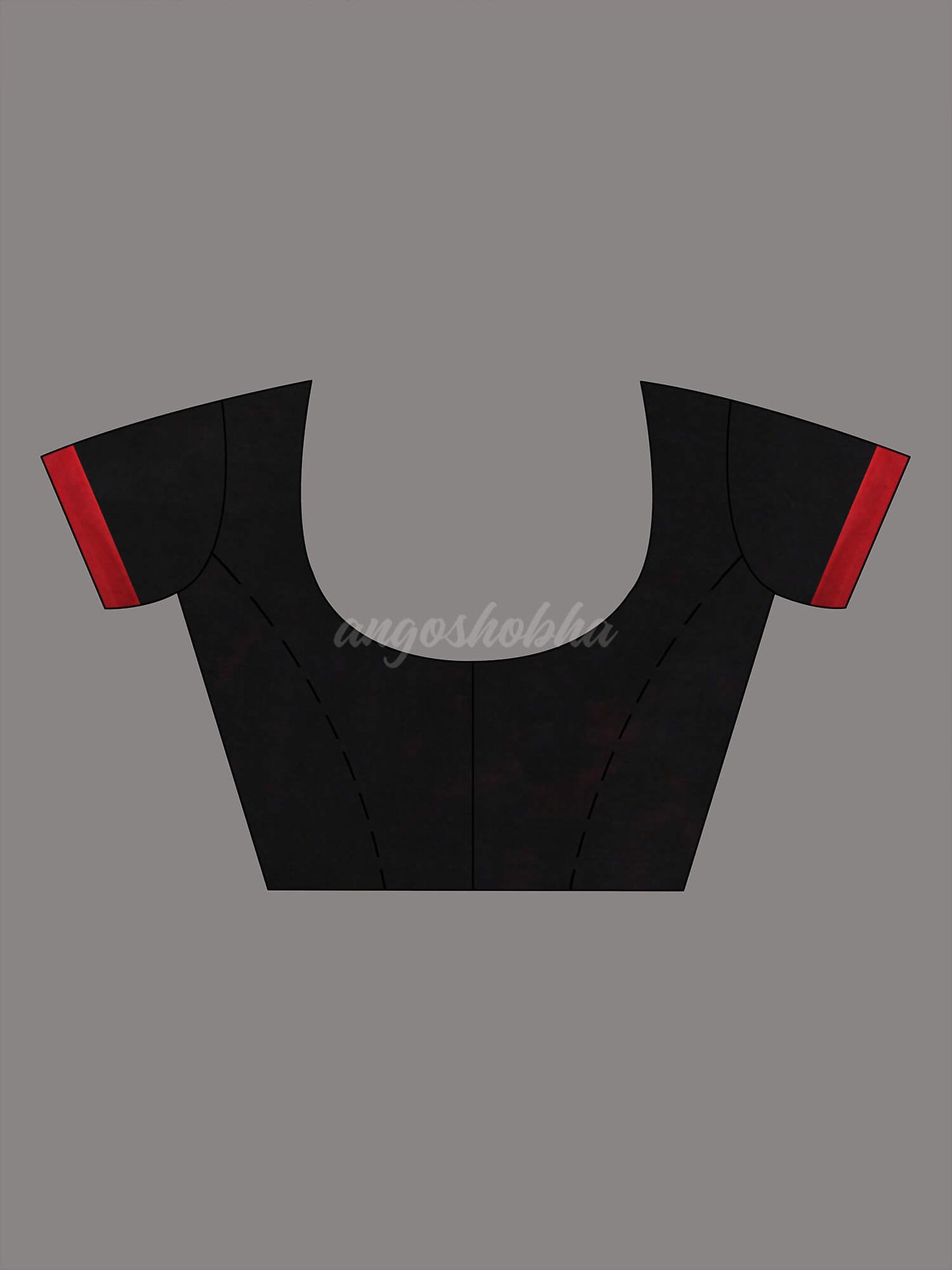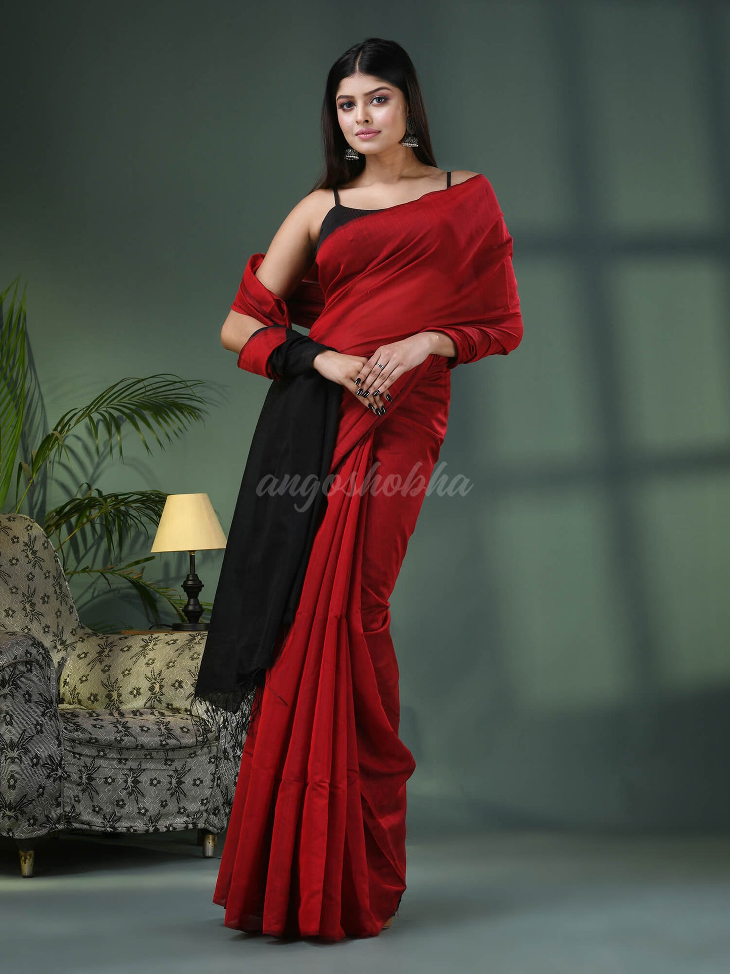 DESCRIPTION:This regal handspun cotton Red colour handloom saree features with handwoven work and it comes with Black hem and well with its emerald body. This piece is made with love and care by various artisans. It has an attached blouse piece.Crafted from premium cotton, it is ultra comfortable. This saree works well for  casual,and daily wear, Indian functions etc. Its colours and matters make a striking statement.So certainly buy this saree .