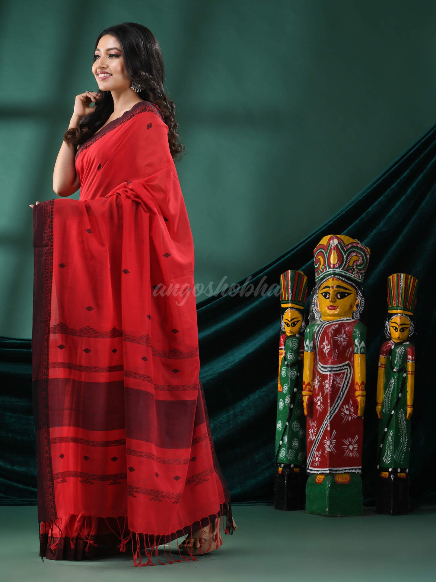 This saree from Angoshobha is a Red colour cotton saree. the Black colour jacquard wark border. saree all body smal motif. and Jacquard work pallu. The saree comes with a Red colour running blouse piece. Style it with minimal jewellery. Colour hues may slightly vary from that which appears in the image. This saree works well for casual, and daily wear, Indian functions etc. Its colours and matters make a striking statement. So certainly buy this saree.