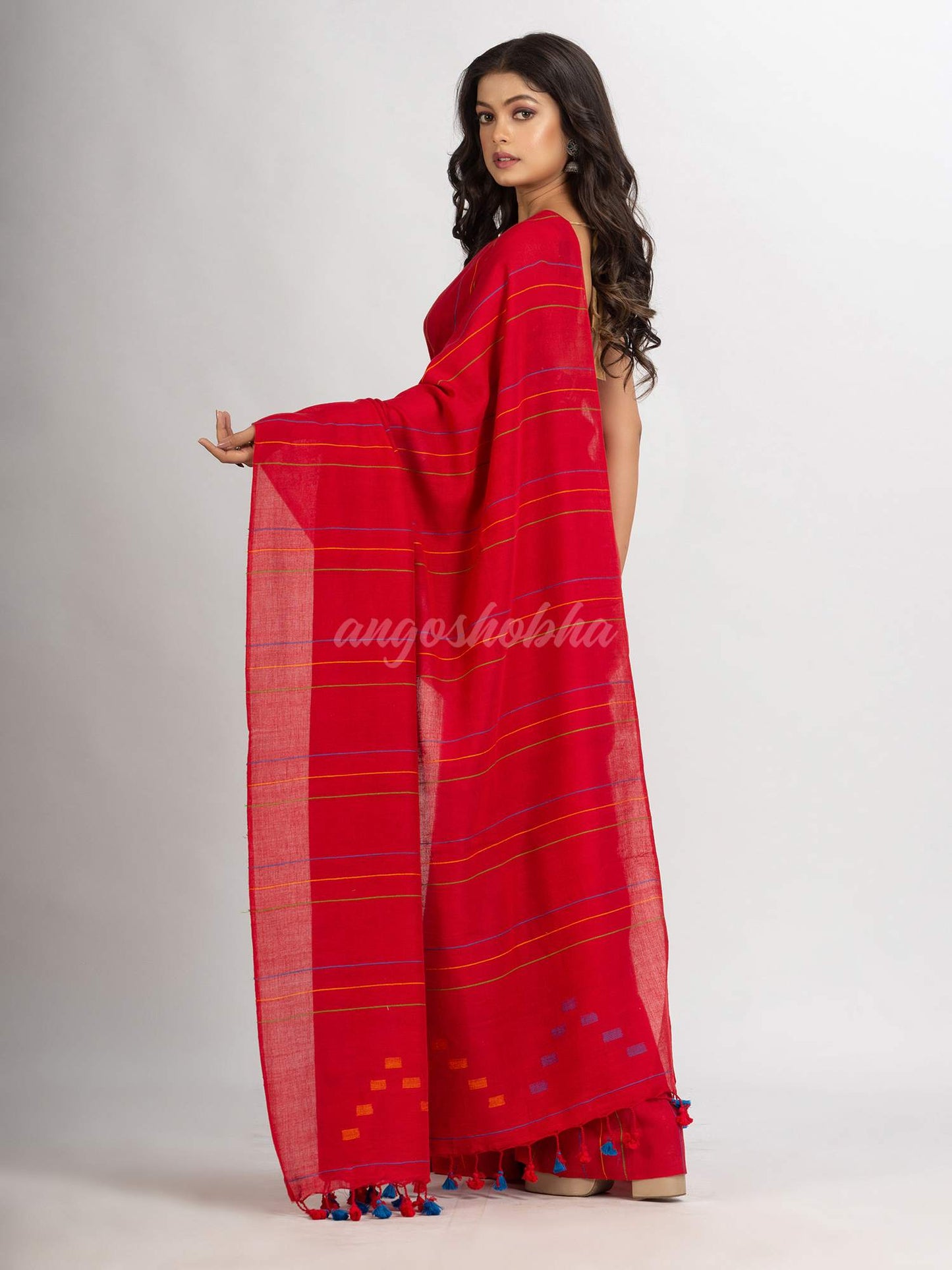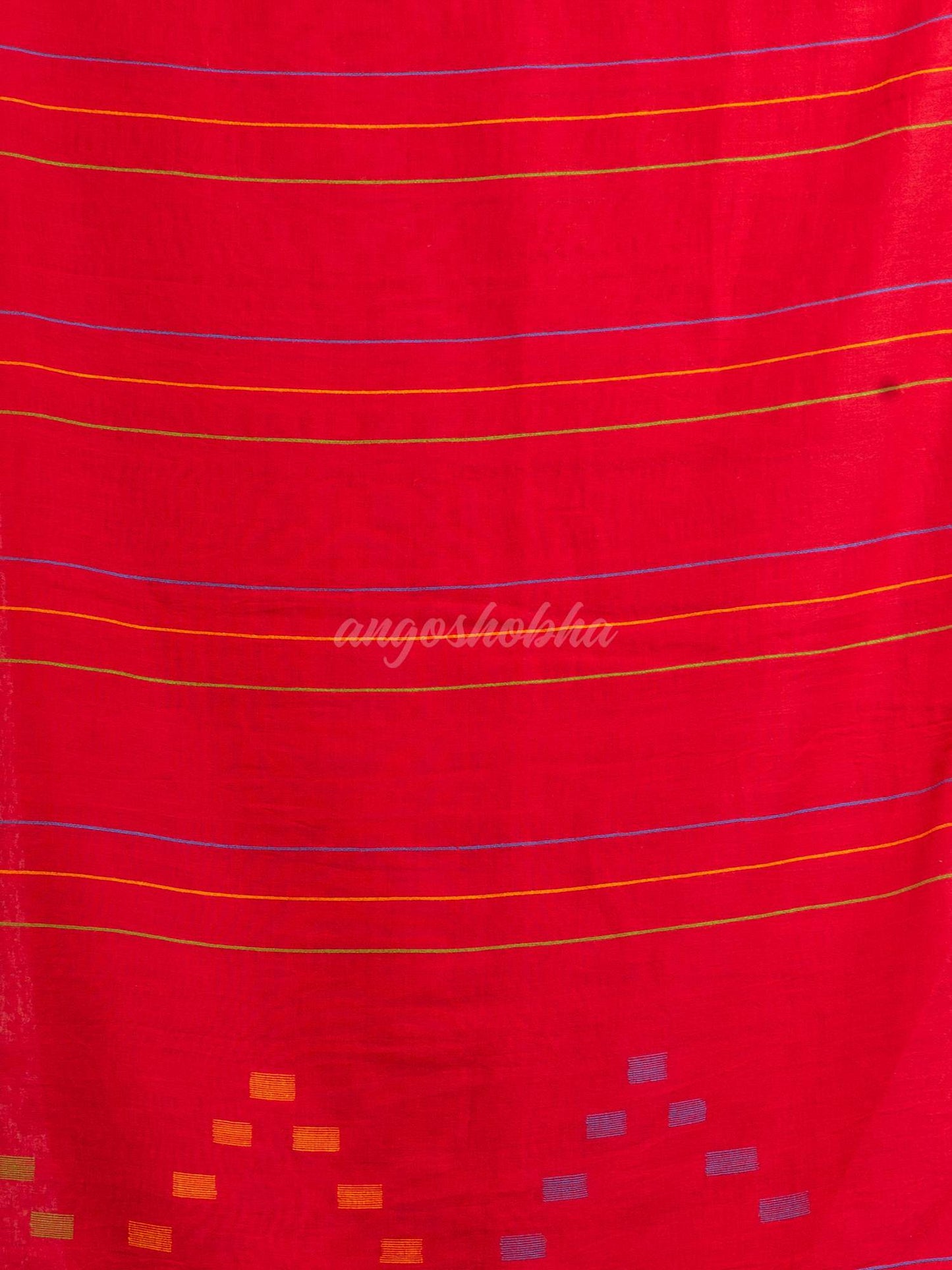Dscription:  Angoshobha’s ethnic saree comes with an unstitched blouse piece, which can be stitched according to your taste and preference.  This Red body and multi colour stipe  with pallu Yellow & blue buti jamdani saree is crafted by skilled craftsmen using high qeuality blended cotton fabric without compromising on its quality. Saree is very comfortable in summer and suitable for festivals. this saree and blouse set will fetch you Oodles of compliments and praises Colour hues may slightly vary from that which appears in the image