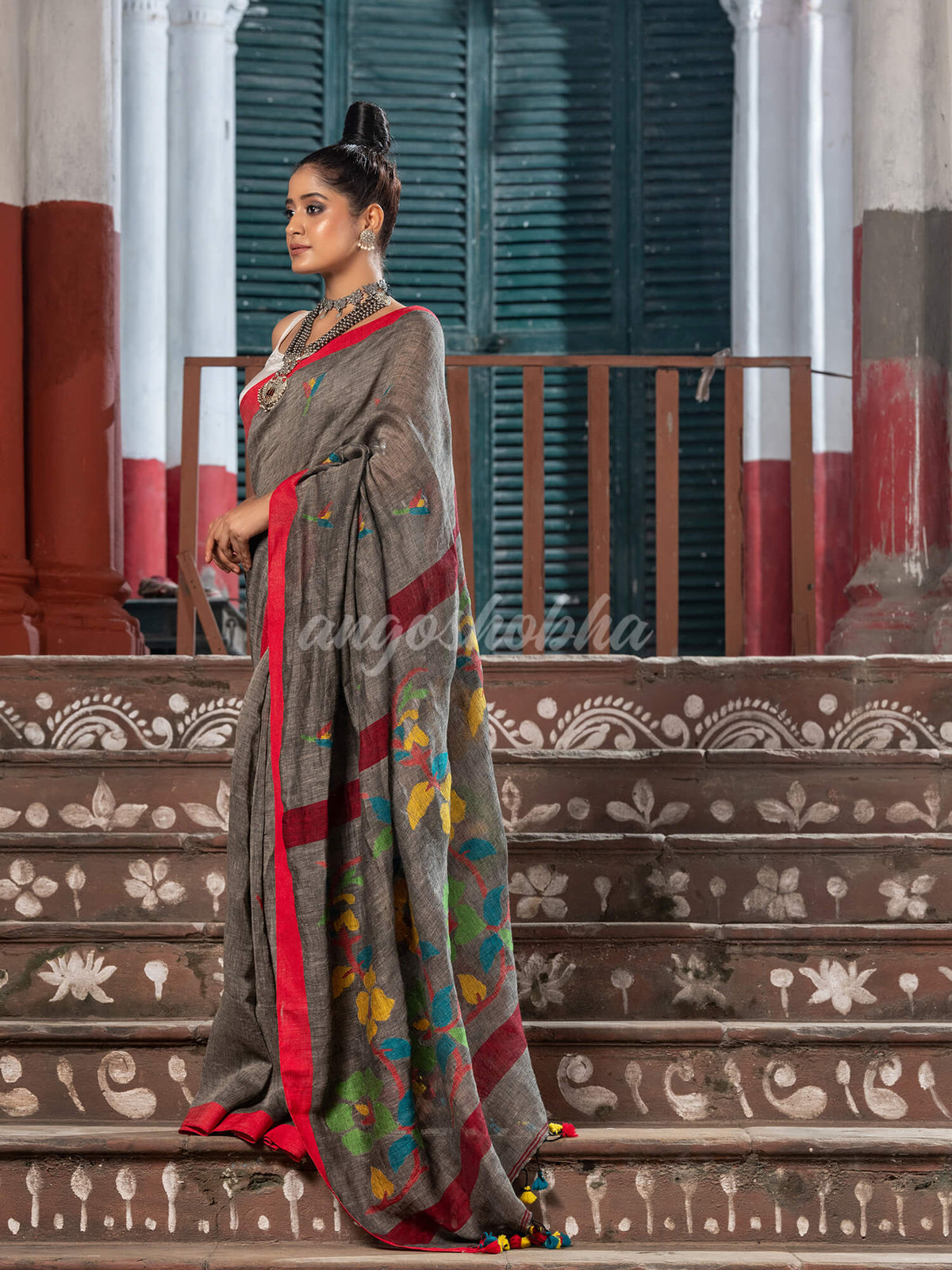 Grey Linen All Body Buti With Flowers Motive Pallu Jamdani Saree