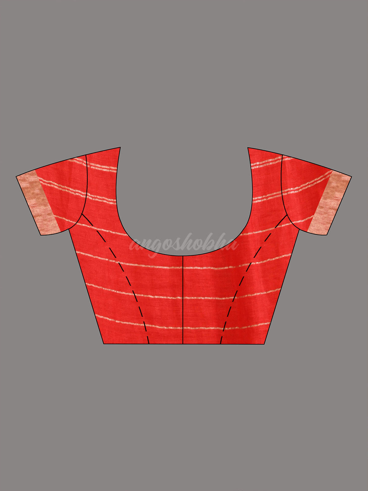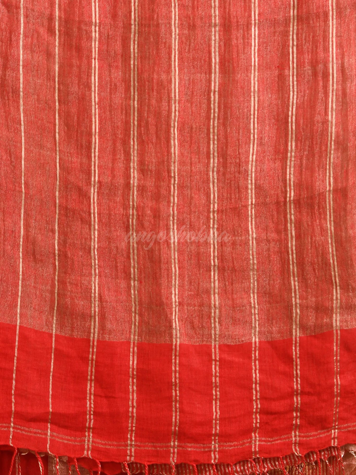 Description: Accentuate your ethnic ensemble by wearing this saree from Angoshobha. Sarees have their own grace, specially this one.This saree from Angoshobha is a beautiful Red Handwoven Linen saree. The saree All Body Silver Zari Strip.Small Check Design With Red Colour Border And Silver Colour on The sides.With Strip pallu.The Saree comes with a Red coloue blouse piece. Style of it with minimal jewellery and high heels to slay the ethnic look.You can wear anywhere and any festival moment with wonderful enjoyment.So collect this product and enjoy with wearing linen saree. Obviously you can trust on this collection. We are always with your fashion and choice.