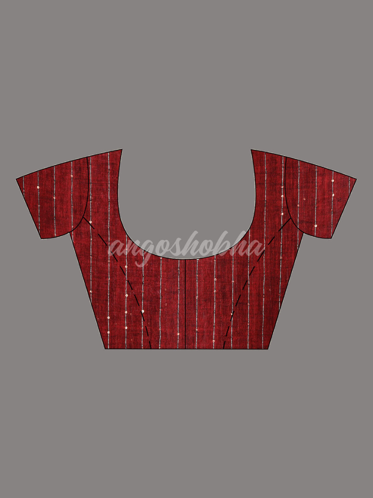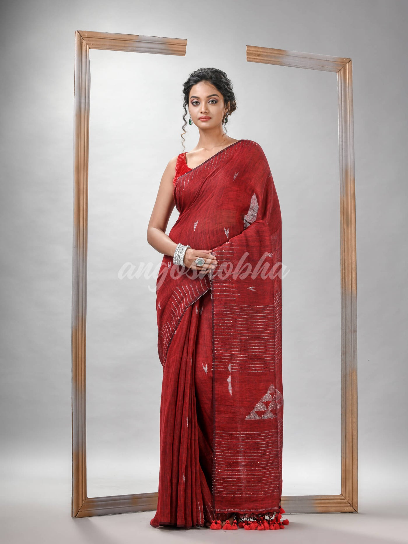 Description: Angoshobha’s ethnic saree comes with an unstitched blouse piece, which can be stitched according to your taste and preference.This Red sequins saree is crafted by skilled craftsmen using high quality linen fabric hand woven work,without compromising on its quality.The hem of the sari is disguised with unique design with sequins. Saree is very comfortable in summer and suitable for festivals .With this beautiful design and fabric, this saree and blouse set will fetch you Oodles of compliments and praises.So let’s start to order the product now.