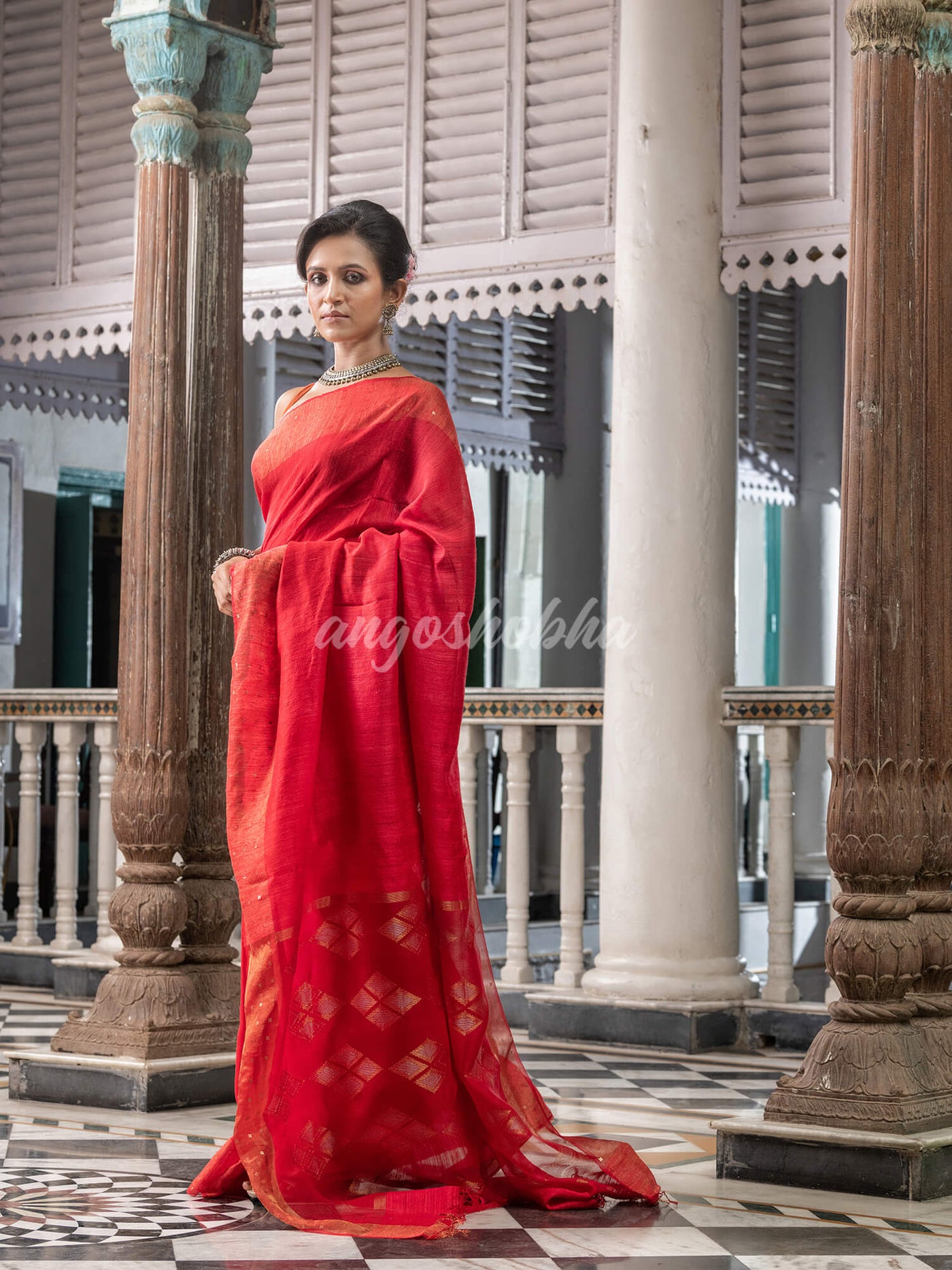 angoshobha’s ethnic Red Matka Silk Handloom Saree comes with an unstitched blouse piece, which can be stitched according to your taste and preference. This Red Color sequins saree is crafted by skilled craftsmen using high quality matka silk fabric without compromising on its quality. The border of the Red Matka Silk Handloom Saree is disguised with Red color and the hem of the saree is concocted with Red and silver strips with latest printed design color. pure matka silk sarees is very comfortable in summer and suitable for festivals with this beautiful design and fabric, this matka silk saree and blouse set will fetch you Oodles of compliments and praises