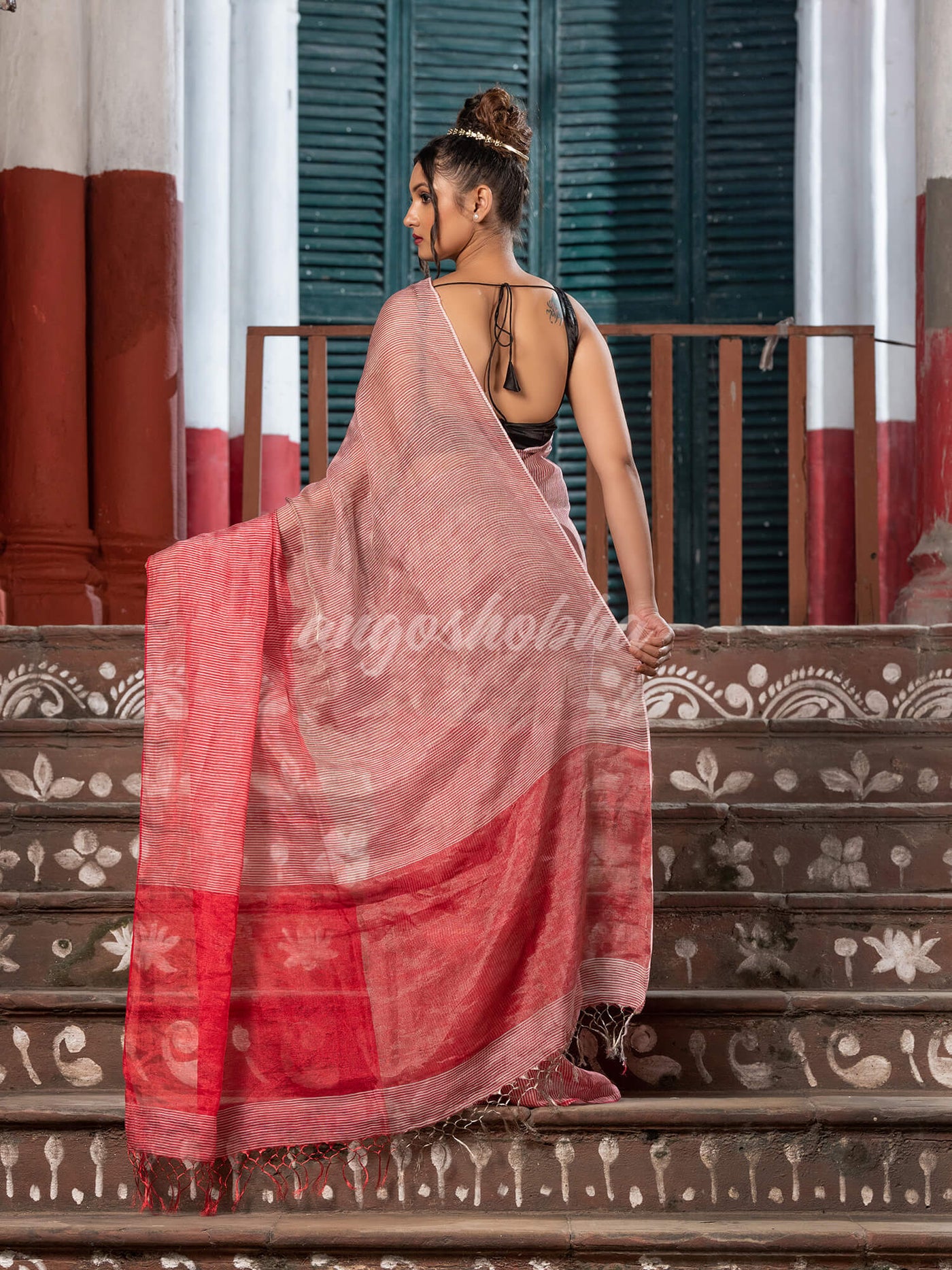 Description: Accentuate your ethnic ensemble by wearing this saree from Angoshobha. Sarees have their own grace, specially this one.This saree from Angoshobha is a beautiful red and Silver traditional handwoven tissu linen saree .The all saree stipe .with red colour pallu and red colour running blouse piece.
