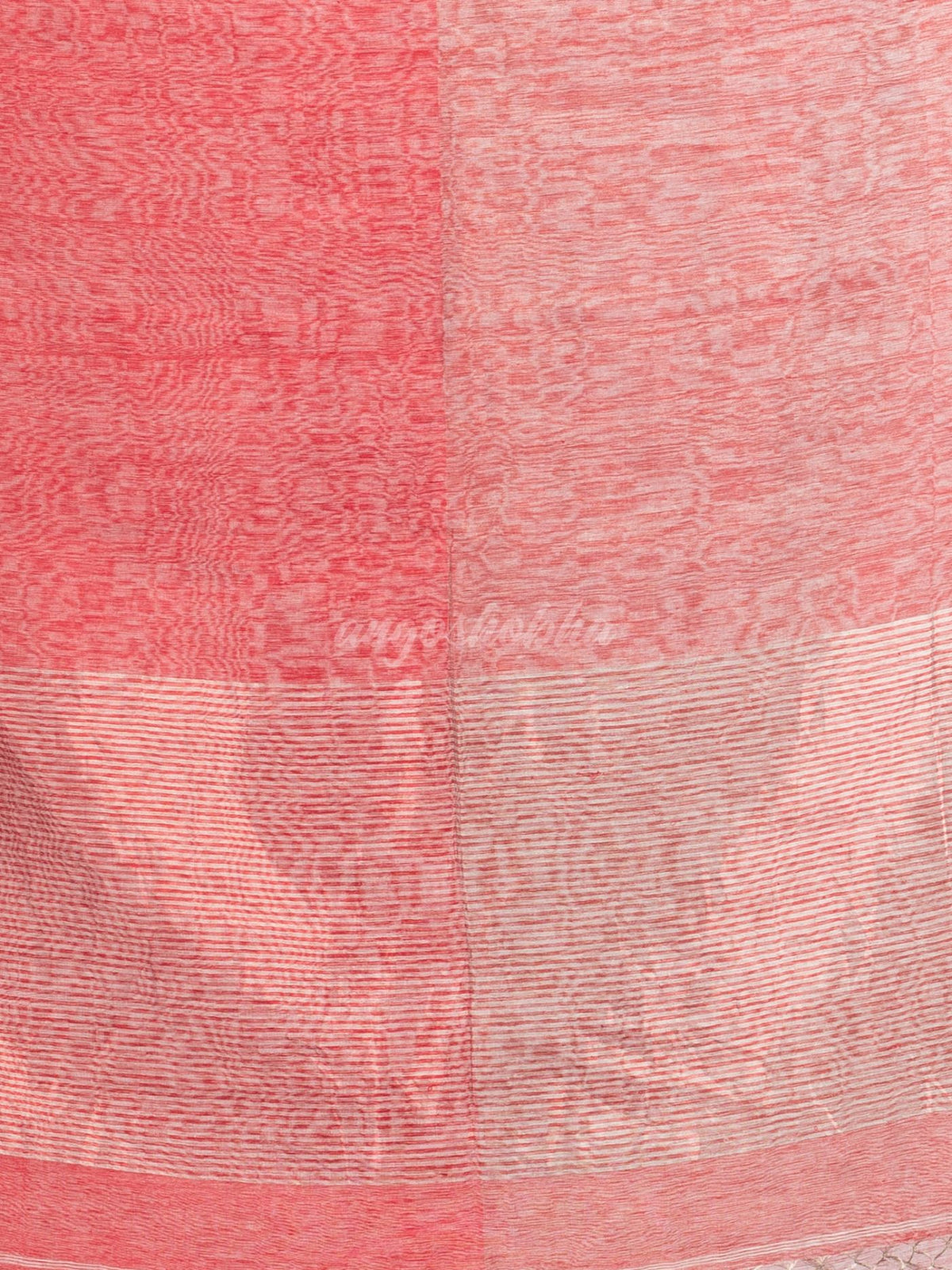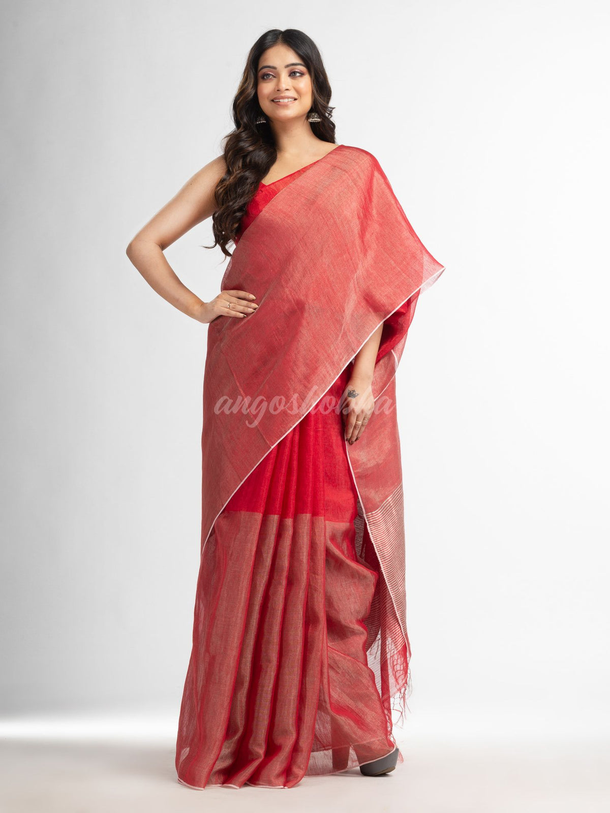 Description: Accentuate your ethnic ensemble by wearing this saree from Angoshobha. Sarees have their own grace, specially this one.This saree from Angoshobha is a beautiful  Traditional Red colour tisssu zari  linen handeoven saerr. The half 0f the saree is red and half is white  colour with solit body.with pallu multi colour stipe.The saree comes with a running bluse piece red colour