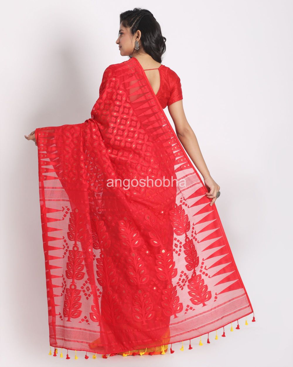 Description: Accentuate your ethnic ensemble by wearing this saree from Angoshobha. Sarees have their own grace, specially this one. This saree from Angoshobha is a beautiful yellow red handloom saree with jacquard weaving jamdani work designed temple border all over. It comes with a red with silver design pallu and an unstitched blouse piece. Crafted in a cotton silk fabric, this beauty gives the most comfortable fit. Style it with minimal jewellery and high heels to slay the ethnic look.You can wear anywhere and any festival moment with wonderful enjoyment.So collect this product and enjoy with wearing cotton silk saree. Obviously you can trust on this collection. We are always with your fashion and choice.