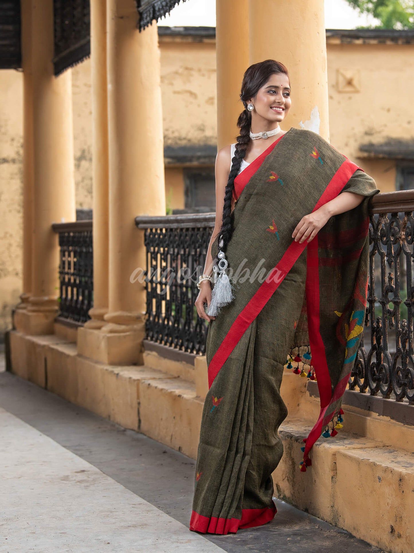 Sage Green Linen All Body Buti With Red Border Jamdani Saree
