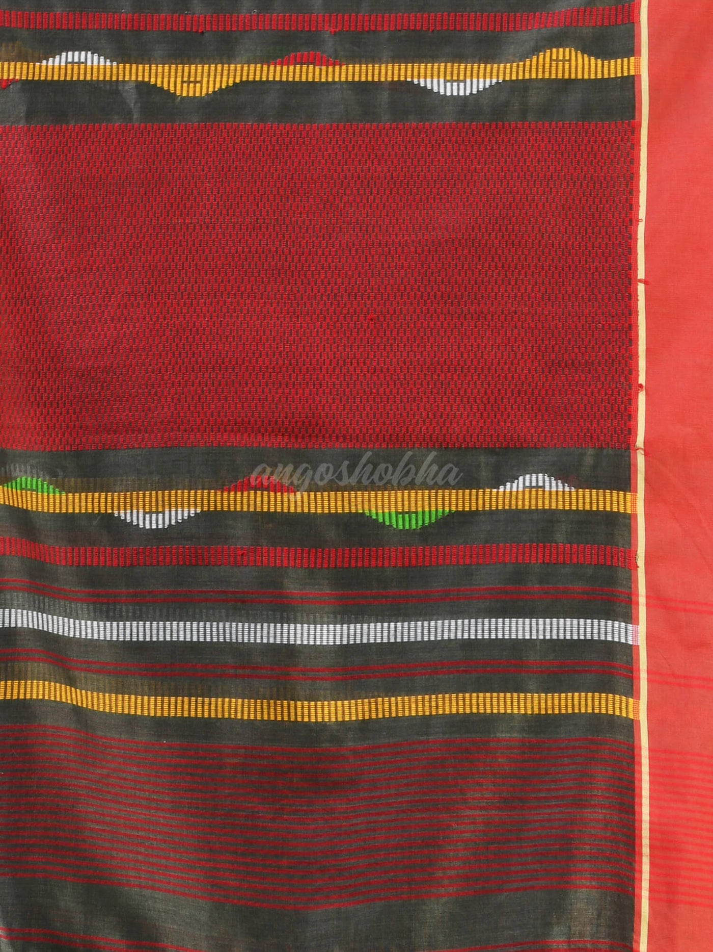 This regal hand loom saree features a woven motif, and its intricate border pairs well with its emerald Stealth Grey body. Crafted from premium cotton fabric, it is ultra comfortable. This saree works well for social meet, daily wear, casual Indian functions. Its colors and matters make a striking statement. The border of the saree is disguised with temple designed and the hem of the saree is concocted with Red Stealth Grey disguised with multi color motifs. It is attached with a blouse piece. So buy this saree certainly.