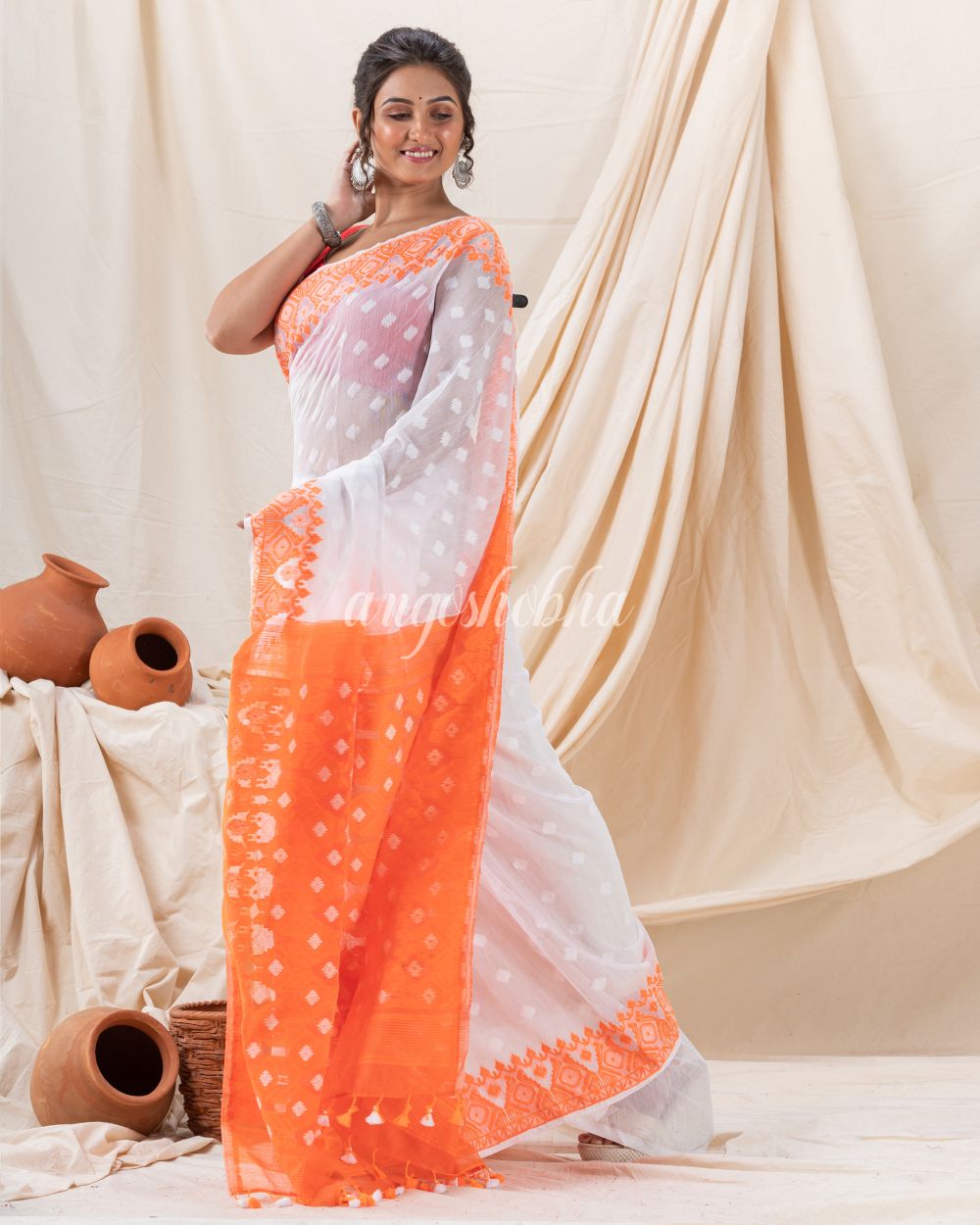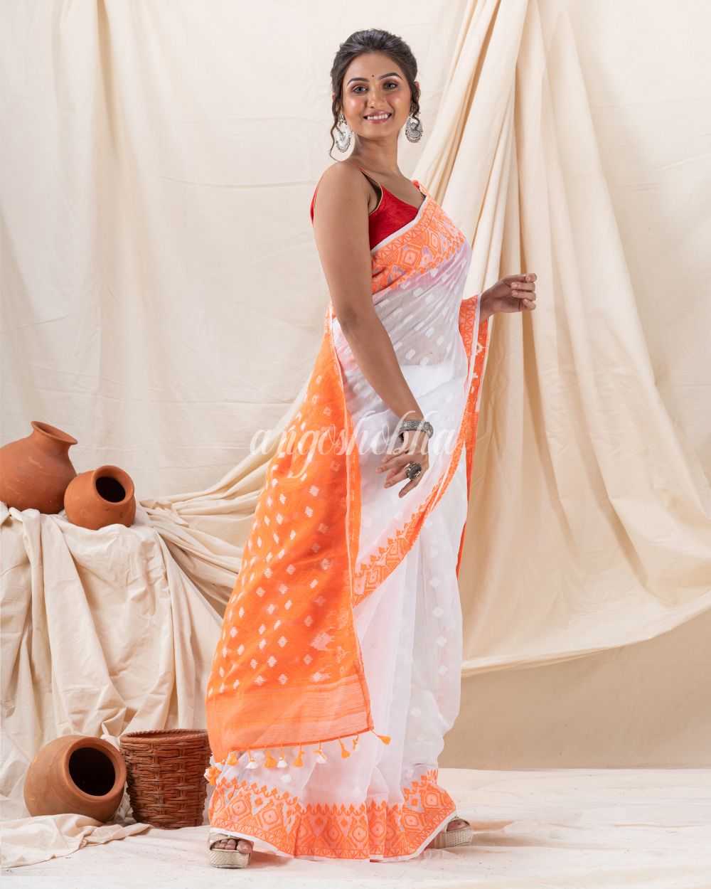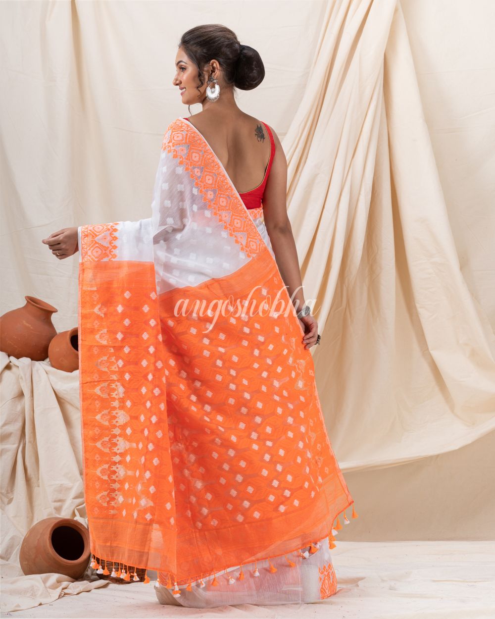 Description: We always prefer extraordinary thing as per our requirement we impose a special amount for the getting latest item. In fact to get the perfect product we believe on the company’s brand valuation but sometimes we are cheated on this matter. So on those moment what can we do? experts of Angoshobha suggest to the customer if you will possible to visit to our manufacturing department to get this Traditional White Soft Dhakai Jamdani Saree you can come otherwise to taste the saree so you can buy first time then you will decide after checking the quality of the saree. What is speciality of Angoshobha’s item? focus on the saree you clearly acknowledged about the border by the by it is disguised with complicated orange subtle design which is manufactured with jacquard weaving by weavers from Angoshobha. Rectangular shape motifs are crafted on the body furthermore the hem of the saree is embellished with orange white colour compilation. There is not attached blouse piece yet adjoined the orange white pumpum. You can attend party by  wearing this saree.