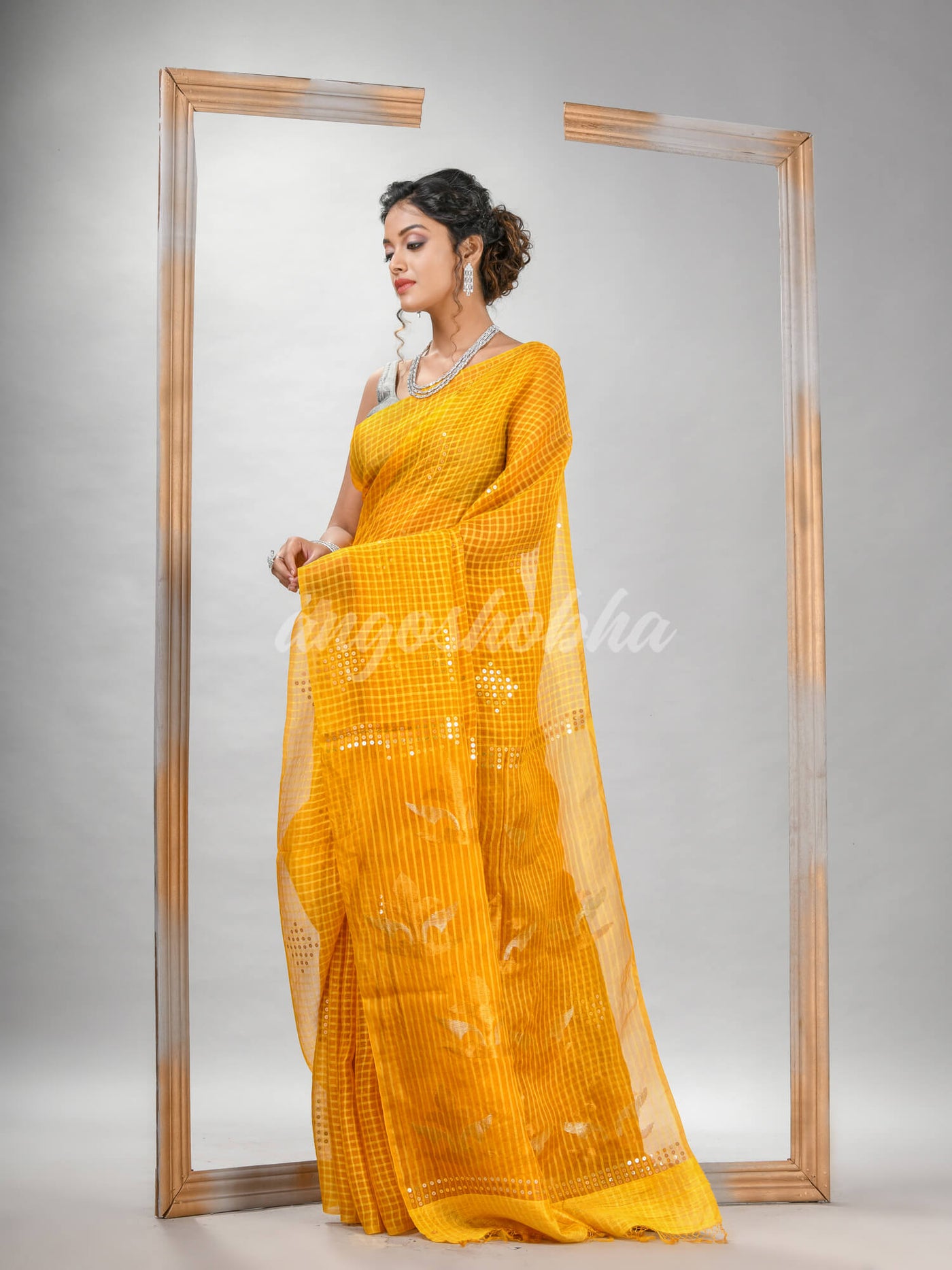 DESCRIPTION: Angoshobha’s ethnic saree comes with an unstitched blouse piece, which can be stitched according to your taste and preference. This Yellow sequins matka silk saree The all saree kotha chek is crafted by skilled craftsmen using high quality matka silk fabric without compromising on its quality.This saree is concocted with latest design on the pallu over the body the sequins are spreading out. Saree is very comfortable in summer and suitable for festivals .With this beautiful sequins design and fabric, this saree and blouse set will fetch you Oodles of compliments and praises.