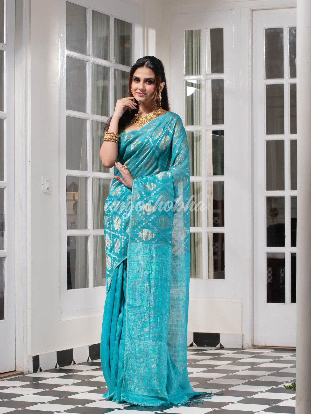 Description: Accentuate your ethnic ensemble by wearing this saree from angoshobha Brand .Sarees have their own grace, specially this one. This saree is made with a beautiful Traditional Turquoise Blue Silk Matka pure fabric. All body part is embellished with intricate motifs. The hem is furnished with turquoise blue silk  and golden zari check . Style of it with minimal jewelry and high heels to slay the ethnic look. You can wear anywhere and any festival moment with wonderful enjoyment. The hues may slightly vary from that which appears in the image.