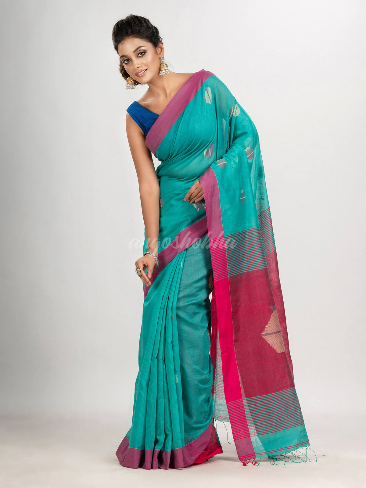 Description :Accentuate your ethnic ensemble by wearing this saree from Angoshobha. Sarees have their own grace, specially this one. This saree from Angoshobha is a beautiful Turquoise jamdani cotton blend saree. the saree all body noddle motive .with Rani colour border. it is pallu rani colour strip and motive.The saree cones with rani colour running blouse piece. this beauty gives the most comfortable fit. Style it with minimal jewellery and high heels to slay the ethnic look.Colour hues may slightly vary from that which appears in the image