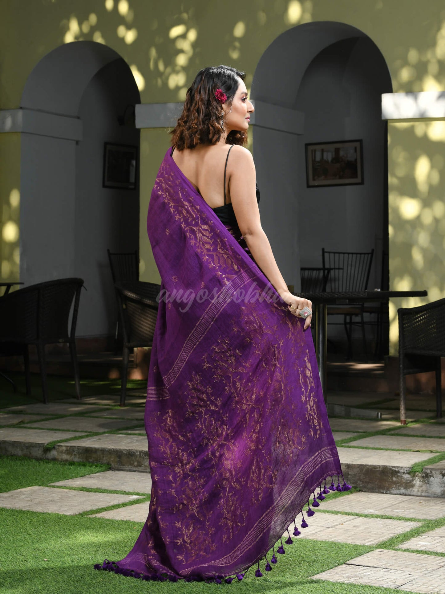 Description: Accentuate your ethnic ensemble by wearing this saree from Angoshobha. Sarees have their own grace, specially this one. This saree from Angoshobha is a beautifu Violet Colour Linen Handwoven Saree.The Saree All Body Small Motive,With Jacquard Zari Border. And Jacquard Zari Work pallu. And Violet colour blouse piece attached. Crafted in a Linen fabric, this beauty gives the most comfortable fit. Style of it with minimal jewellery and high heels to slay the ethnic look.You can wear anywhere and any festival moment with wonderful enjoyment.So collect this product and enjoy with wearing Linen saree. Obviously you can trust on this collection. We are always with your fashion and choice.