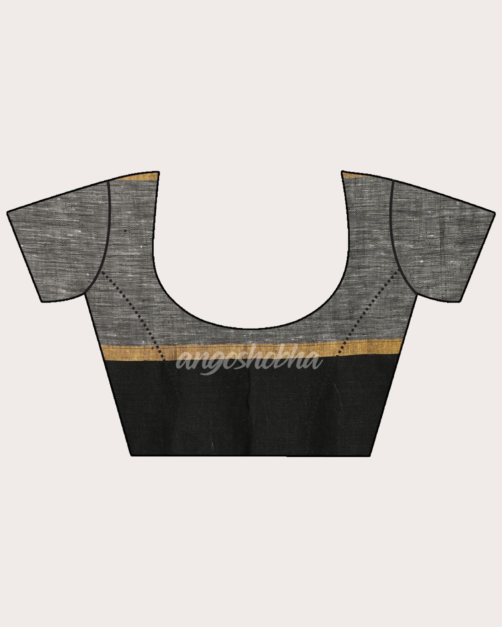 Description: Accentuate your ethnic ensemble by wearing this saree from Angoshobha. Sarees have their own grace, specially this one. This saree from Angoshobha is a beautiful white black handloom saree with handwoven check linen work all over.The border of the sari is disguised with golden color .The hem of the sari is disguised with  grey,black and white compilation and an attached blouse piece. Crafted in a linen fabric, this beauty gives the most comfortable fit. Style of it with minimal jewellery and high heels to slay the ethnic look.You can wear anywhere and any festival moment with wonderful enjoyment.So collect this product and enjoy with wearing linen saree. Obviously you can trust on this collection. We are always with your fashion and choice.