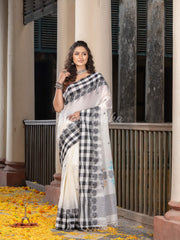 Description: Accentuate your ethnic ensemble by wearing this saree from Angoshobha. Sarees have their own grace, specially this one. This saree from Angoshobha is a beautiful White cotton jamdani saree . The saree all body small jacquard buti.With black and white colour kotha chek border. and the flower motif next to it. with pallu multi colour jacquard motif and strip. with comes with a white colour blouse piece.Crafted in a cotton fabric, this beauty gives the most comfortable fit. Style of it with minimal jewellery and high heels to slay the ethnic look. You can wear anywhere and any festival moment with wonderful enjoyment. So collect this product and enjoy with wearing cotton saree. Obviously you can trust on this collection. We are always with your fashion and choice.