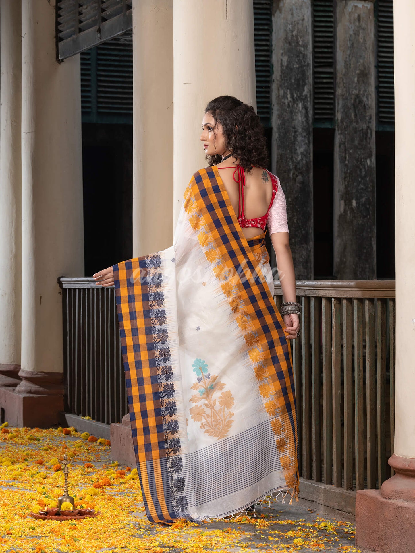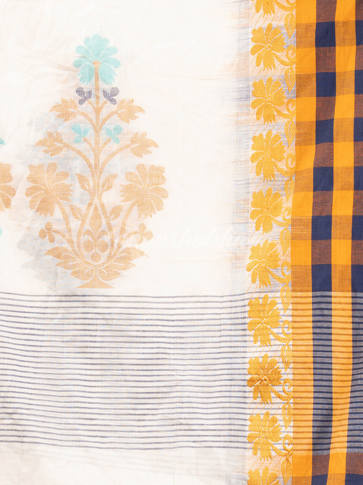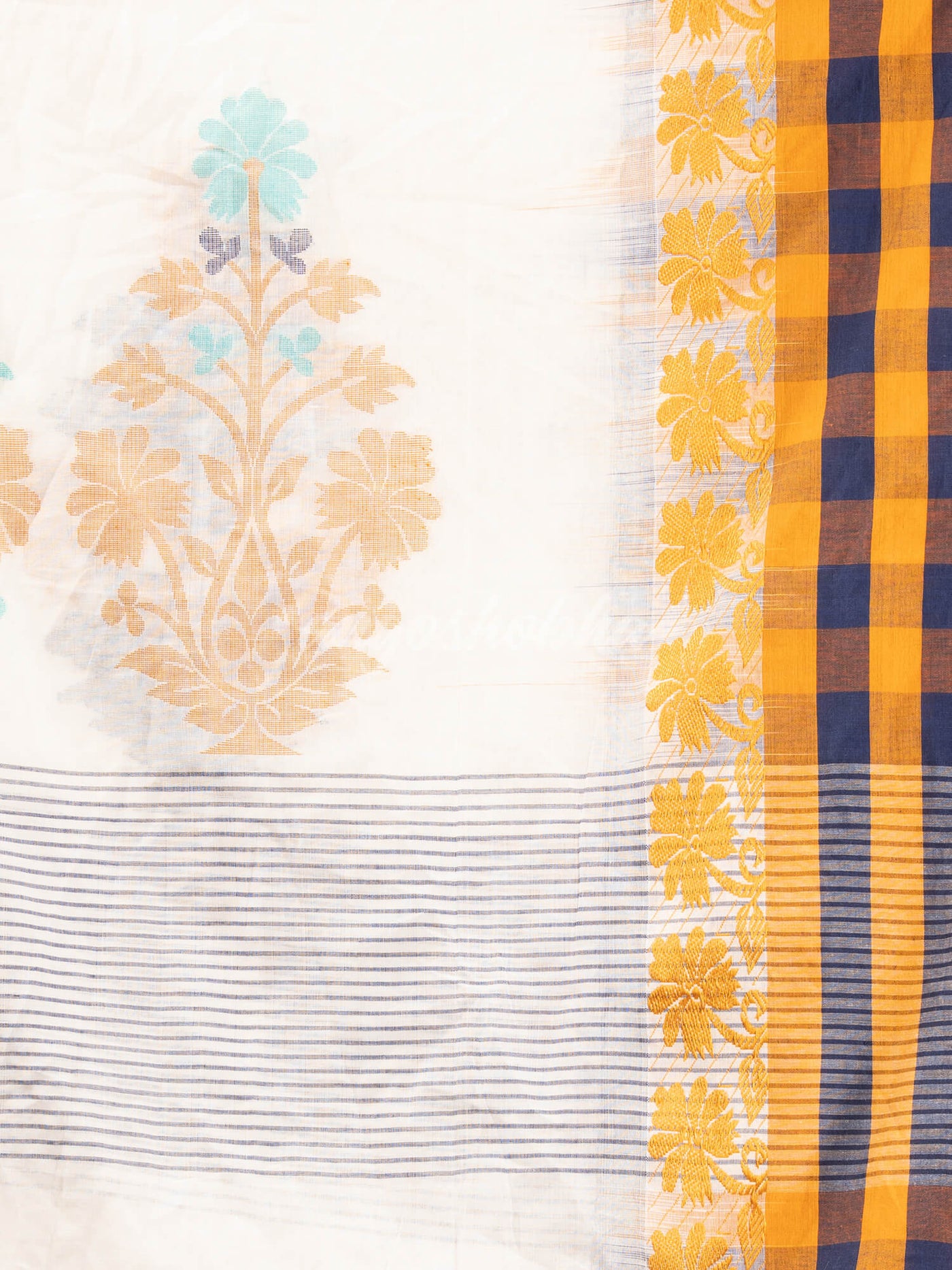 Description: Accentuate your ethnic ensemble by wearing this saree from Angoshobha. Sarees have their own grace, specially this one. This saree from Angoshobha is a beautiful White cotton jamdani saree . The saree all body small jacquard buti. and malti colour chek border. the flower motif next to it. with pallu multi colour jacquard motif and strip .And the saree comes with a white colour blouse piece.Crafted in a cotton fabric, this beauty gives the most comfortable fit. Style of it with minimal jewellery and high heels to slay the ethnic look. You can wear anywhere and any festival moment with wonderful enjoyment. So collect this product and enjoy with wearing cotton saree. Obviously you can trust on this collection. We are always with your fashion and choice.