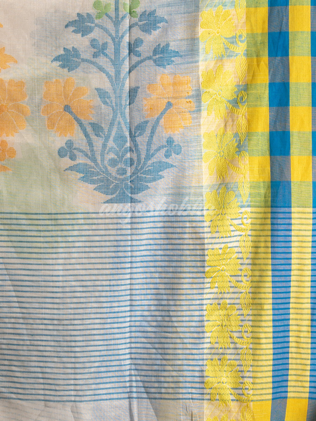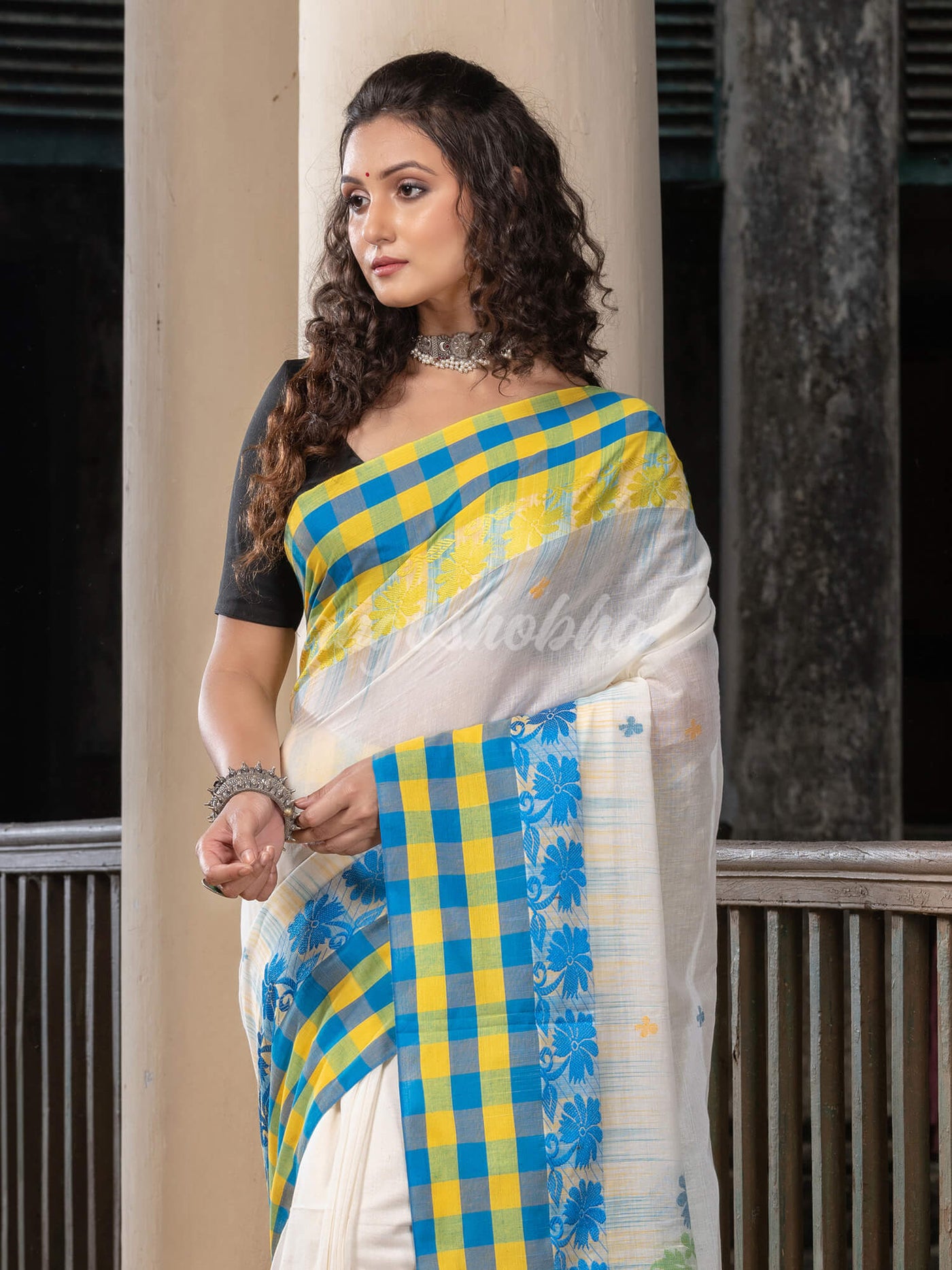 Description: Accentuate your ethnic ensemble by wearing this saree from Angoshobha. Sarees have their own grace, specially this one. This saree from Angoshobha is a beautiful White cotton jamdani saree . The saree all body small jacquard buti. and multi colour chek border. the flower motif next to it. with pallu multi colour jacquard motif and strip .And the saree comes with a white colour blouse piece.Crafted in a cotton fabric, this beauty gives the most comfortable fit. Style of it with minimal jewellery and high heels to slay the ethnic look. You can wear anywhere and any festival moment with wonderful enjoyment. So collect this product and enjoy with wearing cotton saree. Obviously you can trust on this collection. We are always with your fashion and choice.