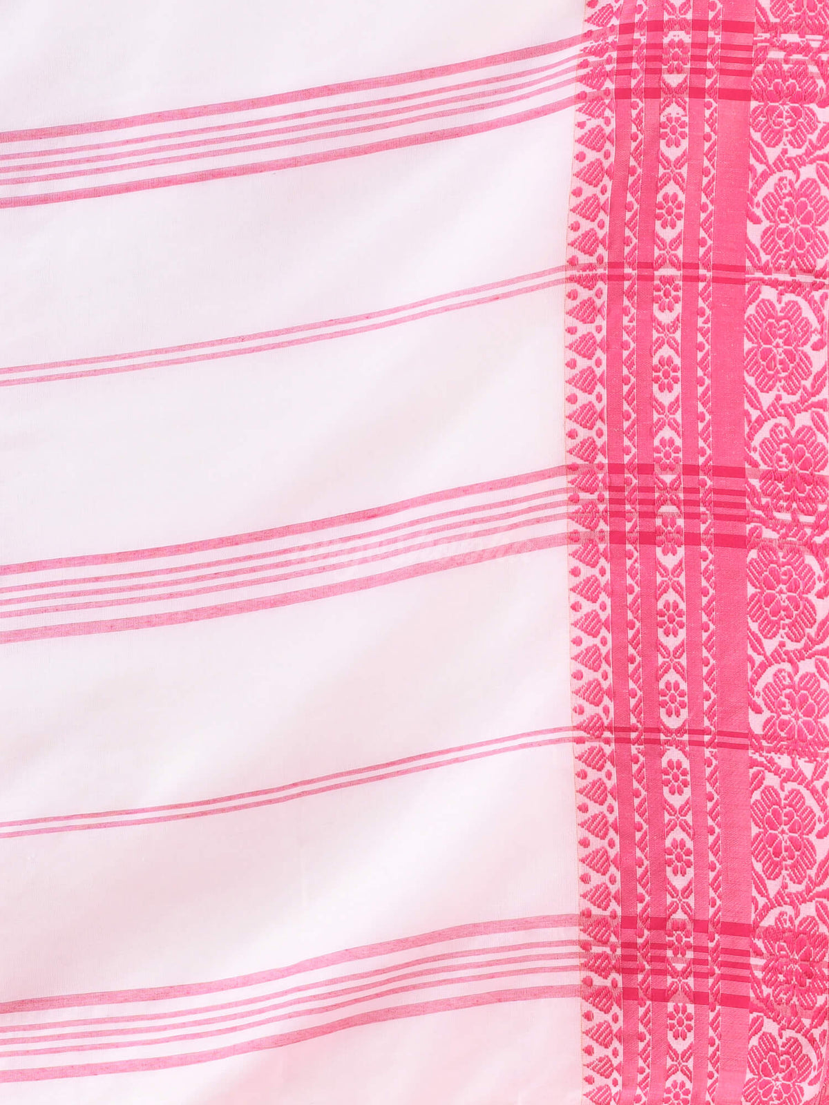 Description: This regal hand loom saree features a woven motif, and its intricate border pairs well with its emerald White body.This piece is handmade with love and care by various artisans. Crafted from begampuri cotton fabric, it is ultra comfortable. The border of the saree is disguised of pink colour and the hem of the sari is concocted with Pink adjusted with different color strikes.It is running with blouse piece.This sari suitable to wear at any function,festivals,daily basis. Its colors and matters make a striking statement.