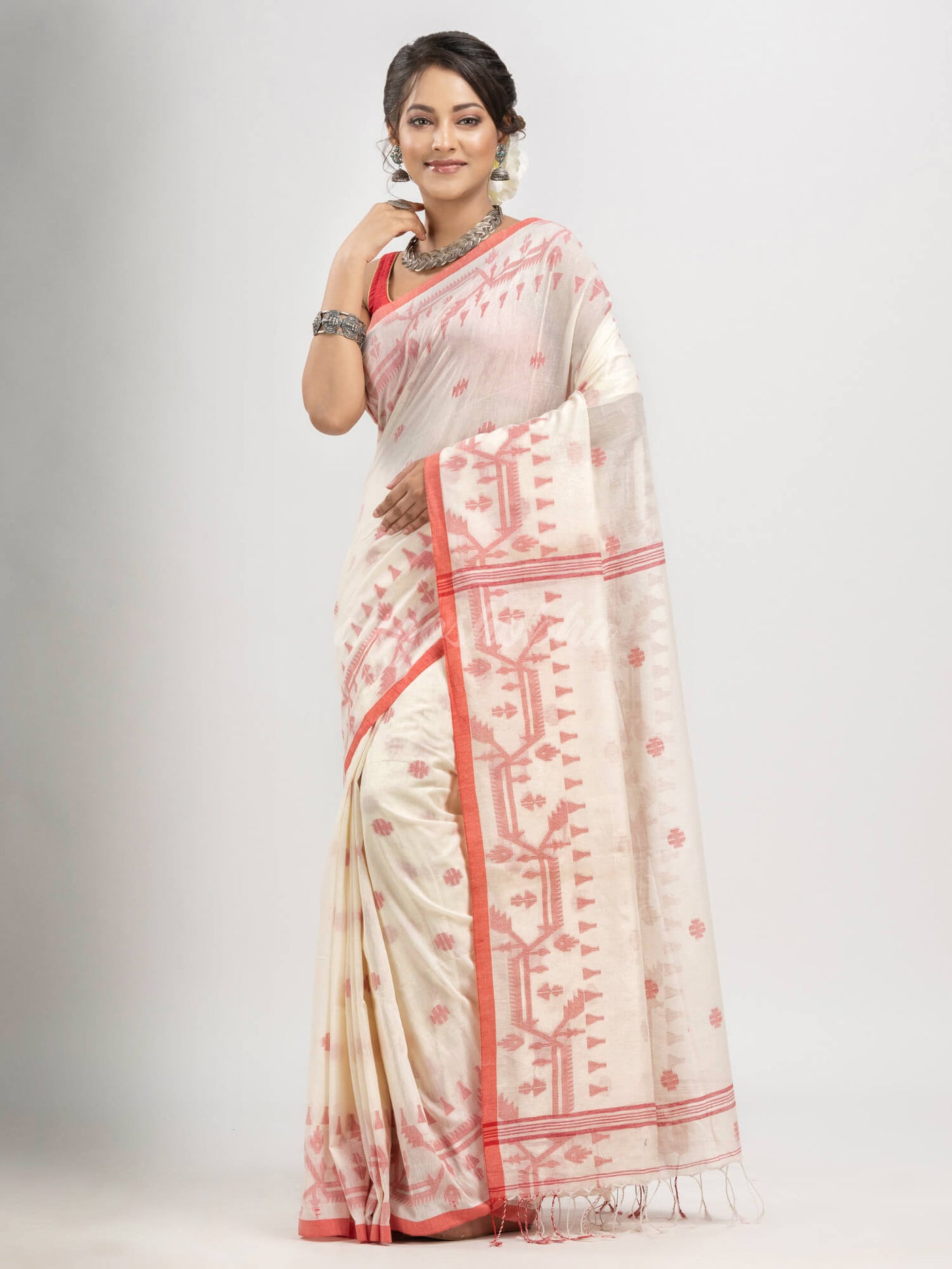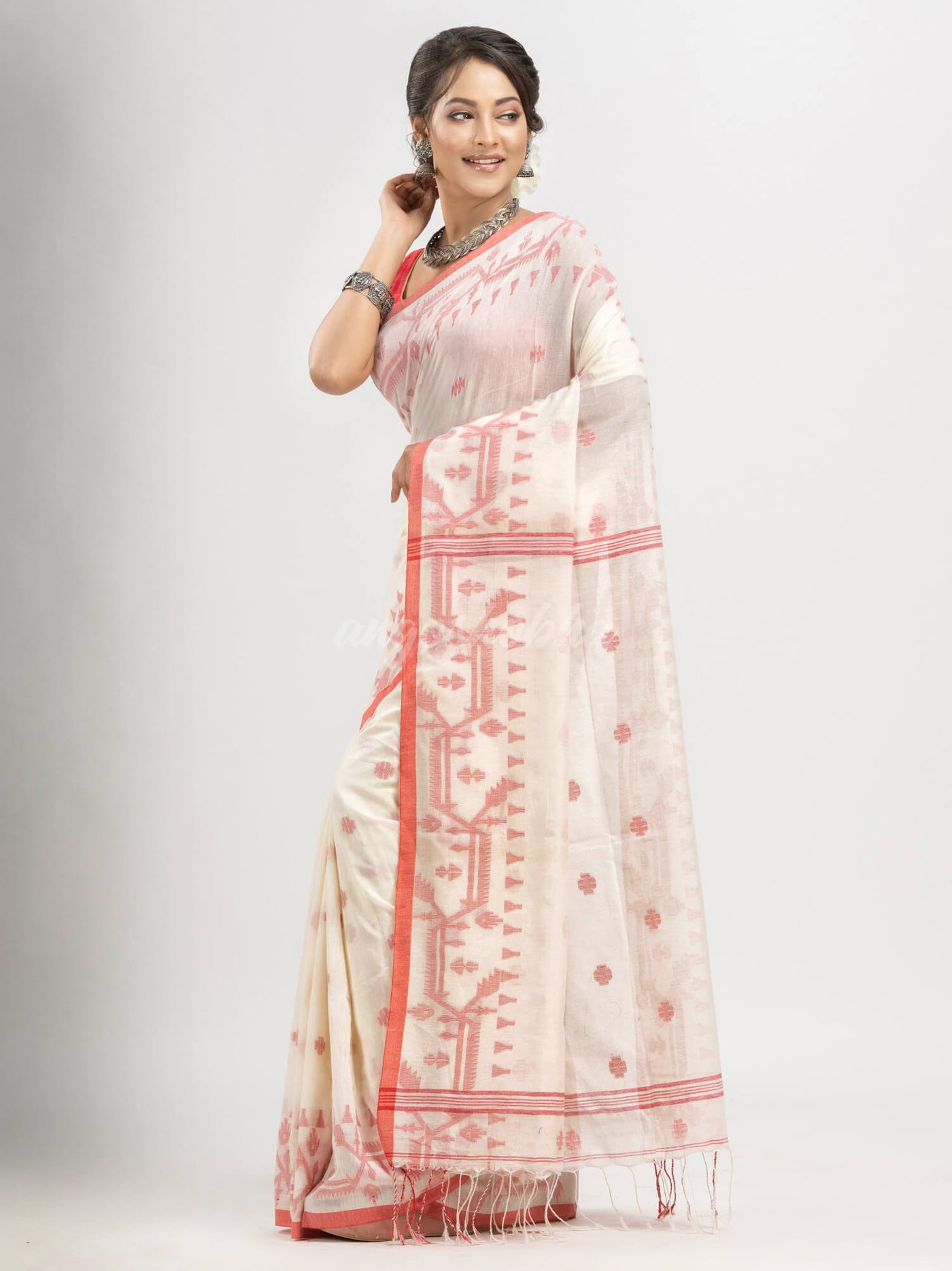 Description: Accentuate your ethnic ensemble by wearing this saree from Angoshobha. Sarees have their own grace, specially this one.This saree from Angoshobha is a beautiful White cotton jacquard saree. Saree all body red colour jacquard work.The border of the saree is red colour. with pallu red colour stripe & jacquard work. The saree  comes with a white colour running blouse piece.You can wear any whern and Crafted in a cotton fabric, this beauty gives the most comfortable and any festival moment with wonderful enjoyment.So collect this product and enjoy with wearing cotton saree. Obviously you can trust on this collection. We are always with your fashion and choice