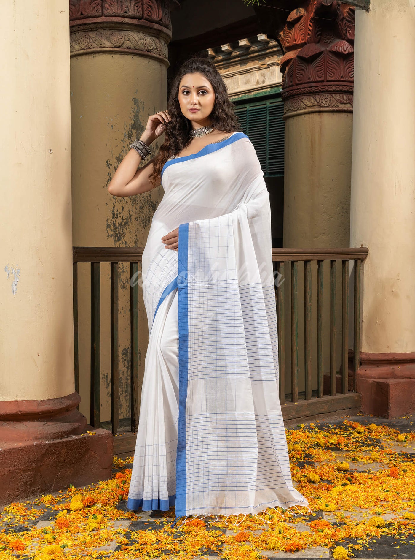 Description: Accentuate your ethnic ensemble by wearing this saree from Angoshobha.This saree from Angoshobha is a beautiful White cotton handloom saree. Half body of the saree is check, and half solid body. with acqua blue solid border. and half pallu motifs .The saree comes with a white colour blouse piece.Crafted in a cotton fabric, this beauty gives the most comfortable fit. Style of it with minimal jewellery and high heels to slay the ethnic look.You can wear anywhere and any festival moment with wonderful enjoyment.