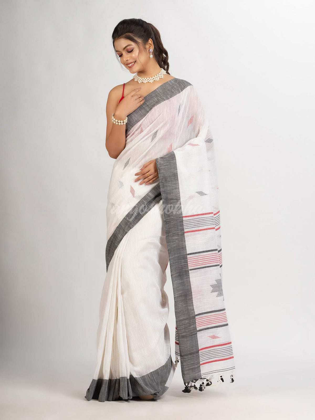 Description:  This Traditional White saree wtih Black border Cotton Jamdani saree is woven in grandiose to feel the freshness of tranquility. The serene  White overlay is embellished with self-threaded Black and Red motifs. It is disguised with pallu Red & Black stipe , and Red,Black motifs.With Black, White pompom aded the blouse piece which is White colour.