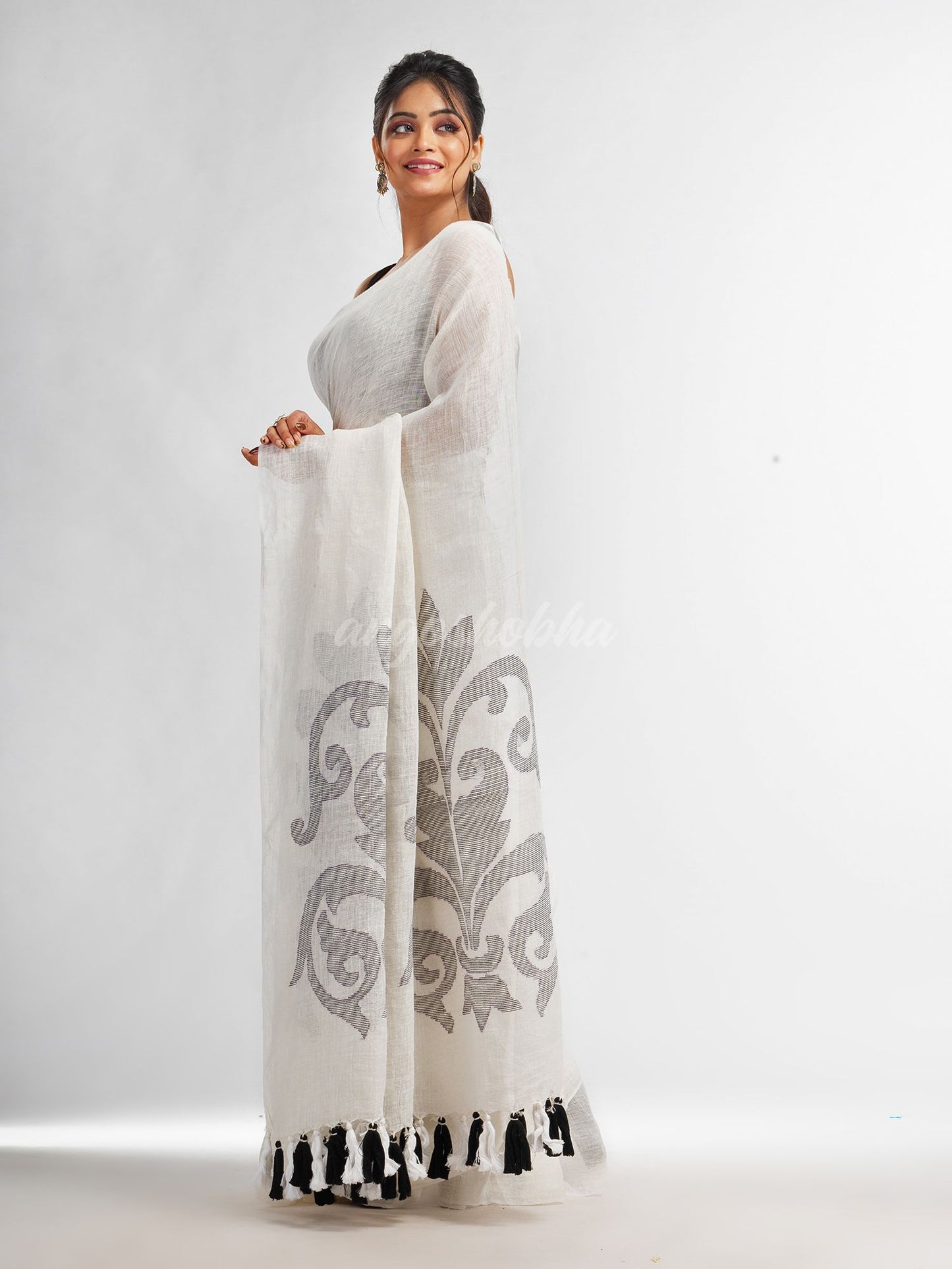 Description: Accentuate your ethnic ensemble by wearing this saree from Angoshobha. Sarees have their own grace, specially this one. This saree from Angoshobha is a beautiful White handwoven Linen saree.The border of the sari is disguised with White colour .All saree have motifs Black colour kollka. and an attached White colour blouse piece. Crafted in a linen fabric, this beauty gives the most comfortable fit.You can wear anywhere and any festival moment with wonderful enjoyment. Obviously you can trust on this collection. We are always with your fashion and choice.
