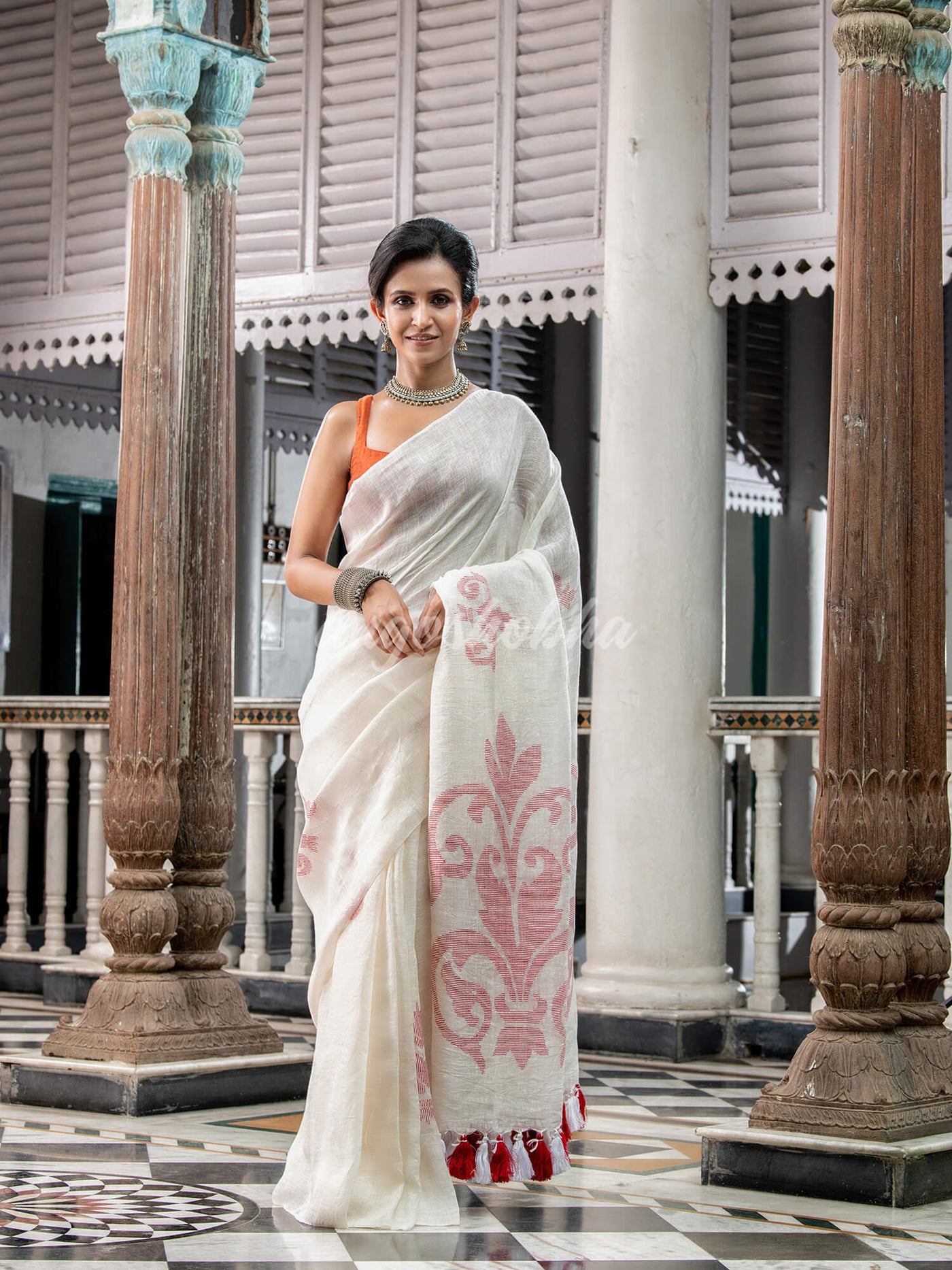 Accentuate your ethnic ensemble by wearing this White Linen Handloom Saree from Angoshobha. Sarees have their own grace, specially this one. This linen saree from Angoshobha is a beautiful White handwoven Linen saree. The border of the sari is disguised with White color . All saree have motifs Red color kalka and an attached White color blouse piece. Crafted in a linen fabric, this beauty gives the most comfortable fit.You can wear anywhere and any festival moment with wonderful enjoyment. Obviously you can trust on this collection. We are always with your fashion and choice.