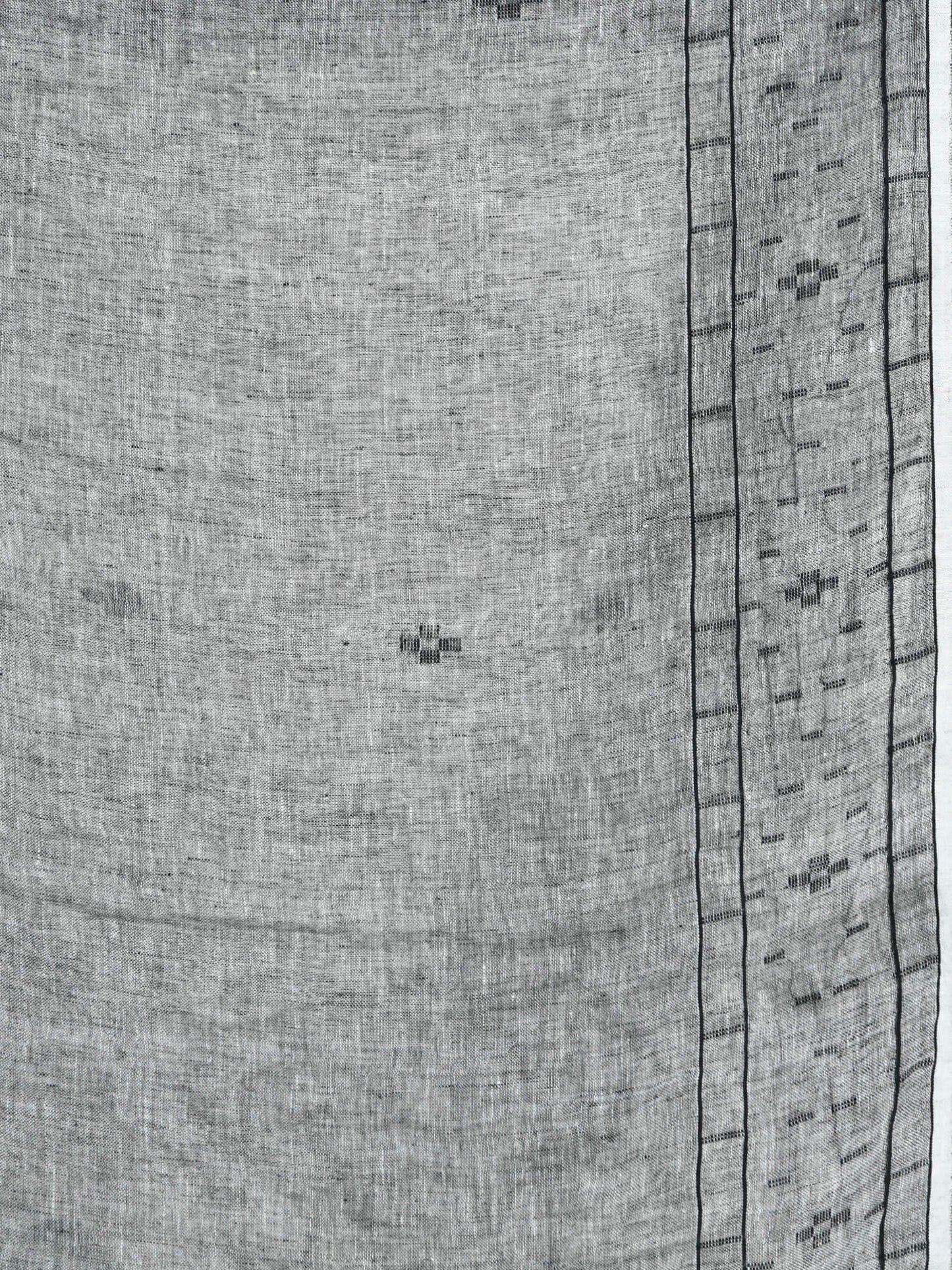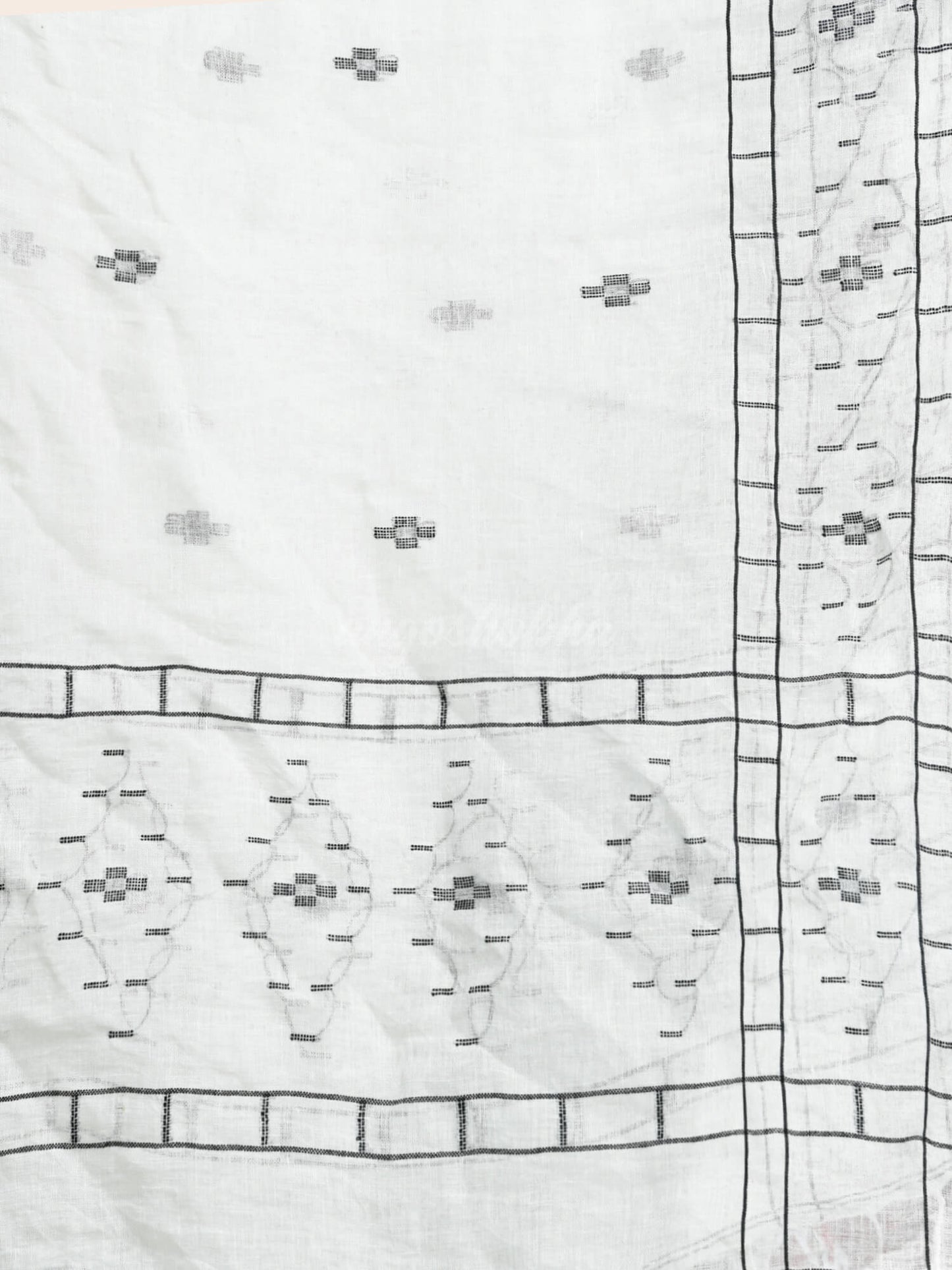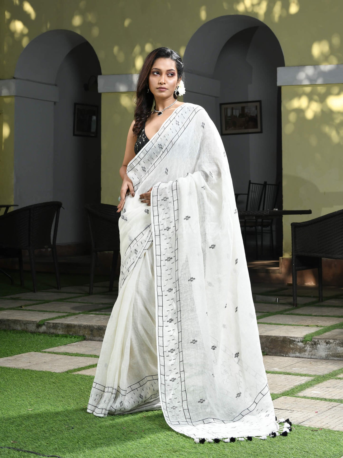 Description : Accentuate your ethnic ensemble by wearing this saree from Angoshobha. Sarees have their own grace, specially this one. This saree from Angoshobha is a beautiful White colour handwoven linen saree. The saree all body Black colour Motive.  The Black Coloured Jamdani Work on Both sides Of the body. and same  pallu. The saree comes with Black colour running blouse piece. this beauty gives the most comfortable fit. Style it with minimal jewellery and high heels to slay the ethnic look.Colour hues may slightly vary from that which appears in the image