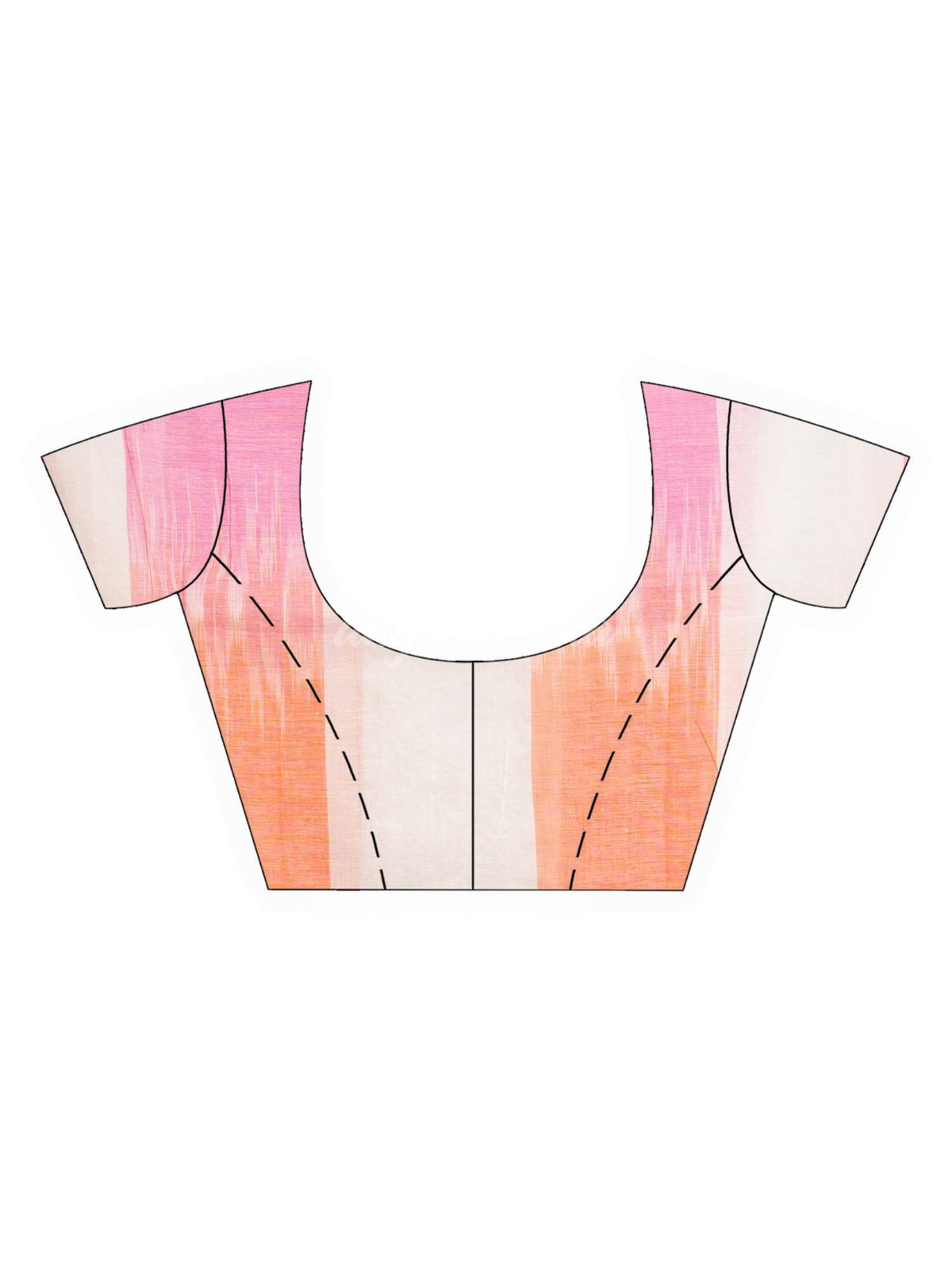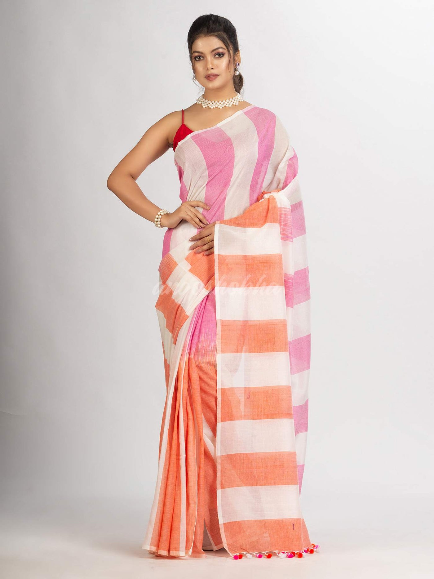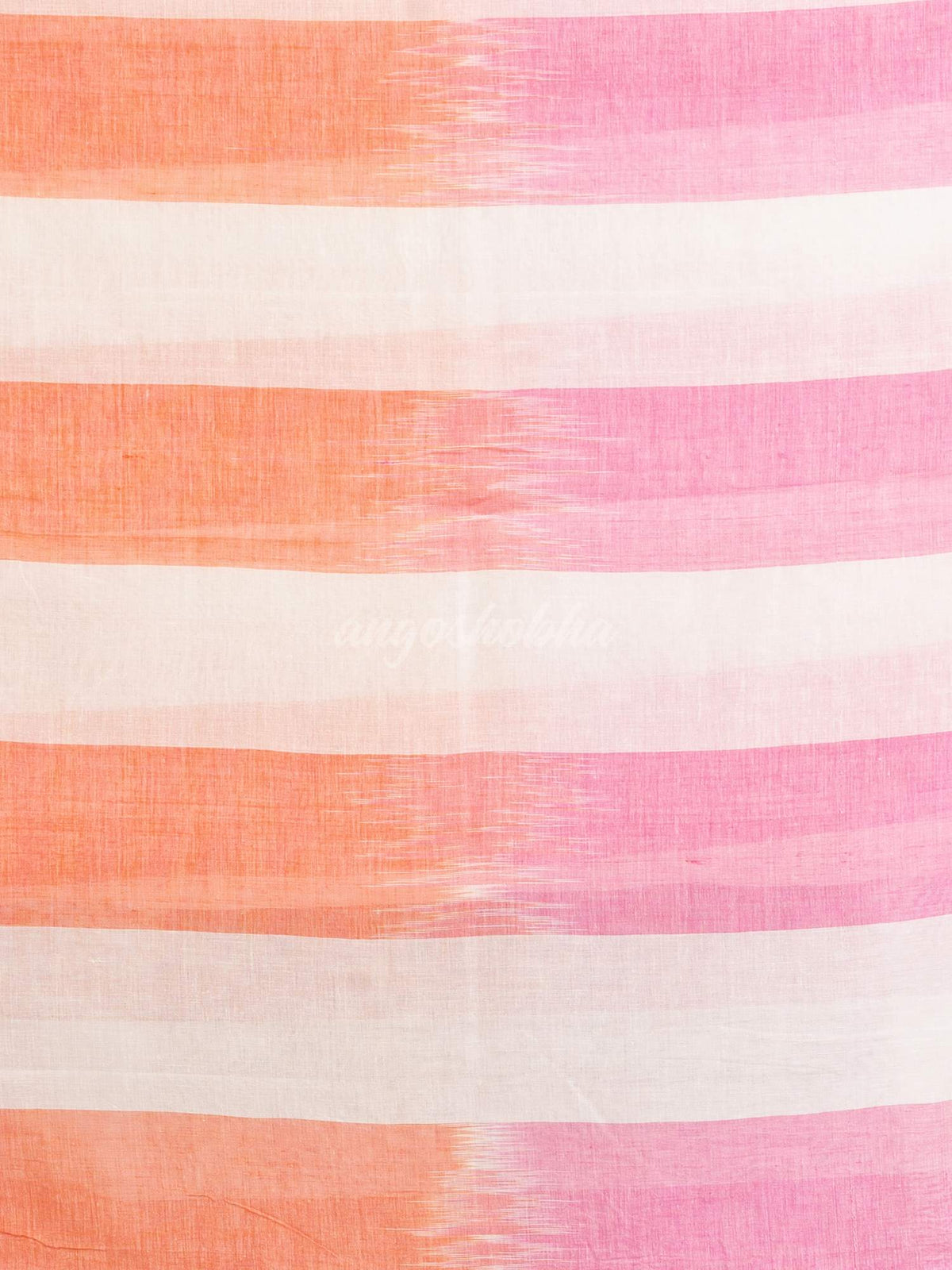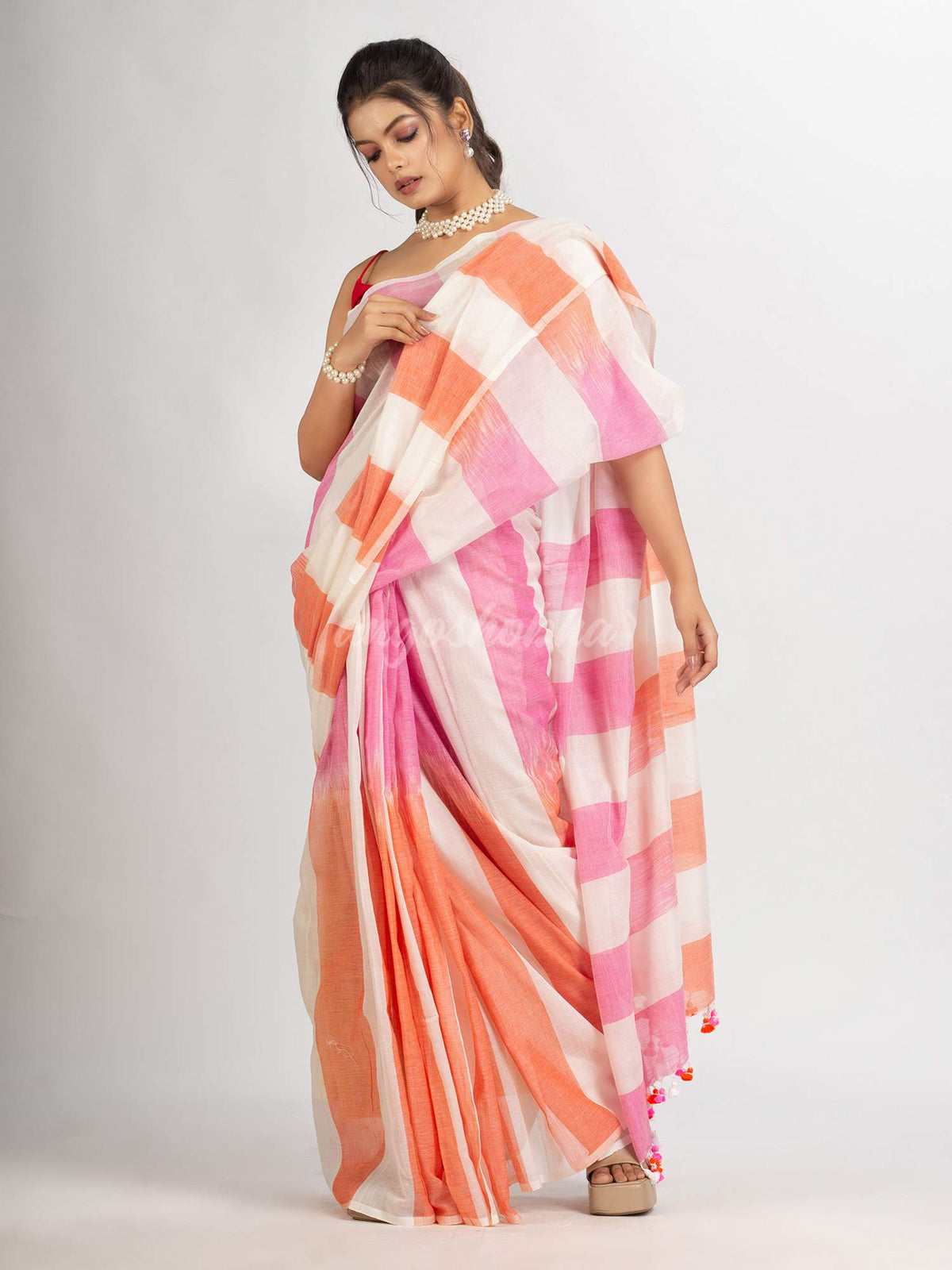 Description: Accentuate your ethnic ensemble by wearing this saree from Angoshobha. Sarees have their own grace, specially this one.This saree from Angoshobha is a beautiful white ,Pink & orange colour handloom saree with handwoven plain stripes work all over.It comes with a white,pink & yellow color stripes compilation pallu and an attached blouse piece.Crafted in a  cotton fabric, this beauty gives the most comfortable You can wear anywhere and any festival moment with wonderful enjoyment.So collect this product and enjoy with wearing cotton saree.