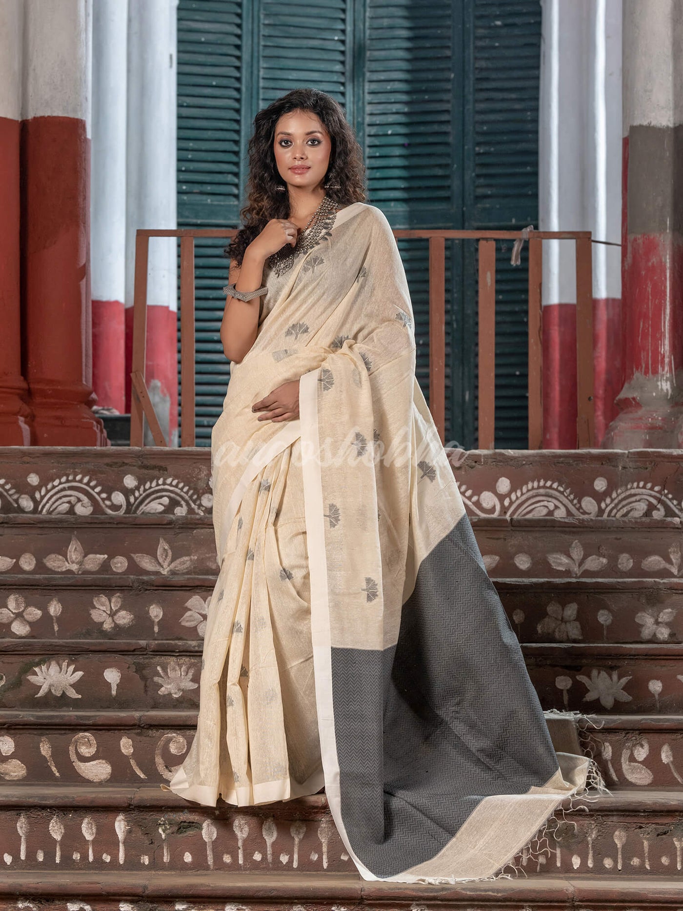 White Silk Noyal All Body Buti With Black Pallu Jamdani Saree